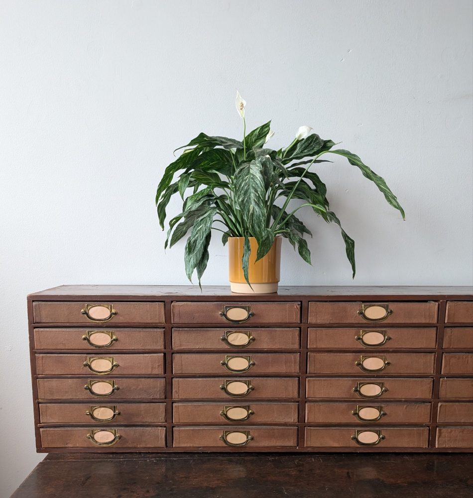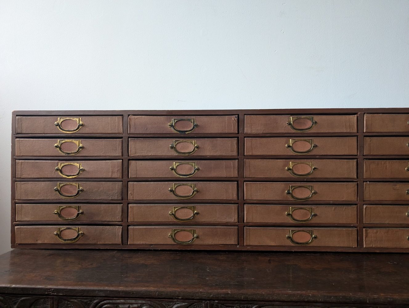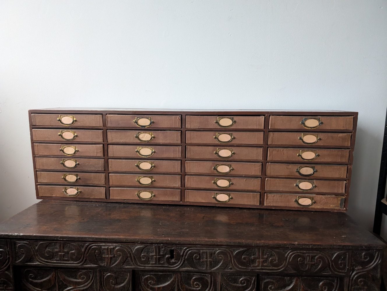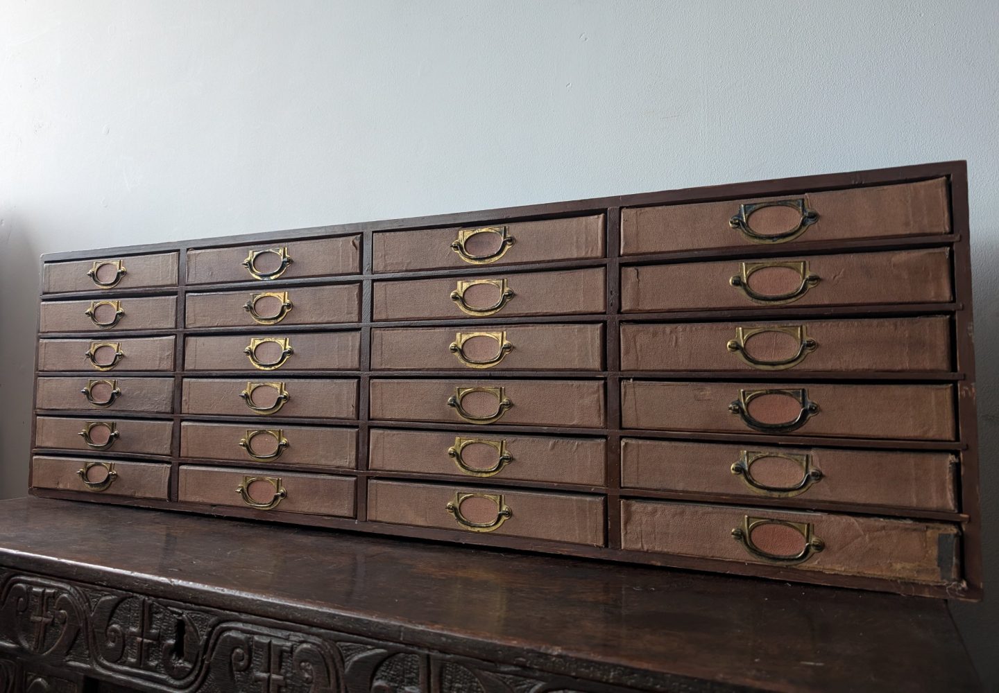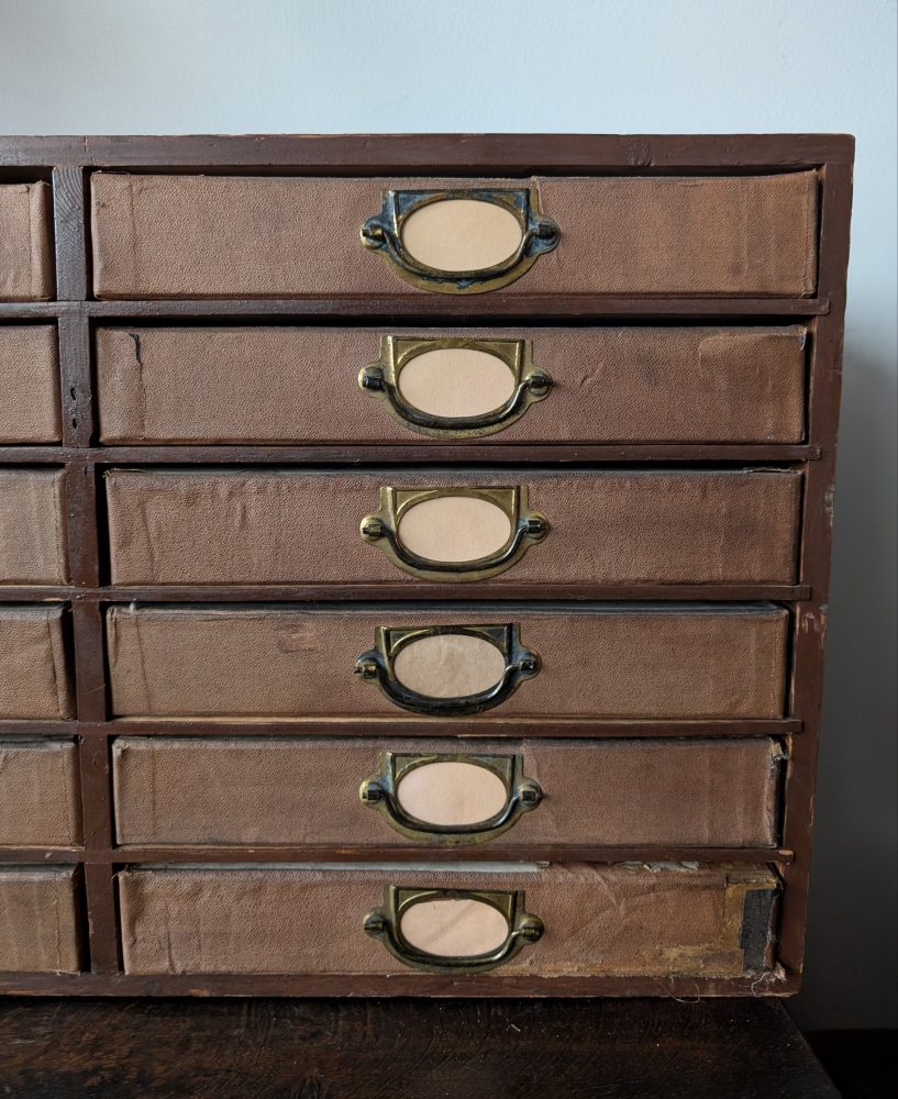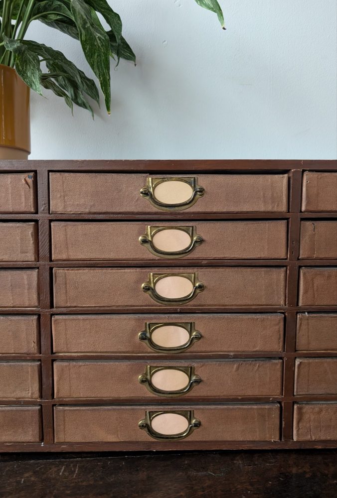 1920s antique cabinet of 24 drawers with brass pulls and label holders