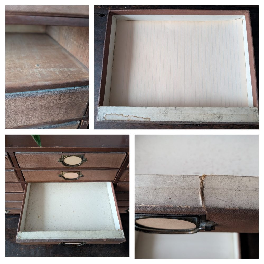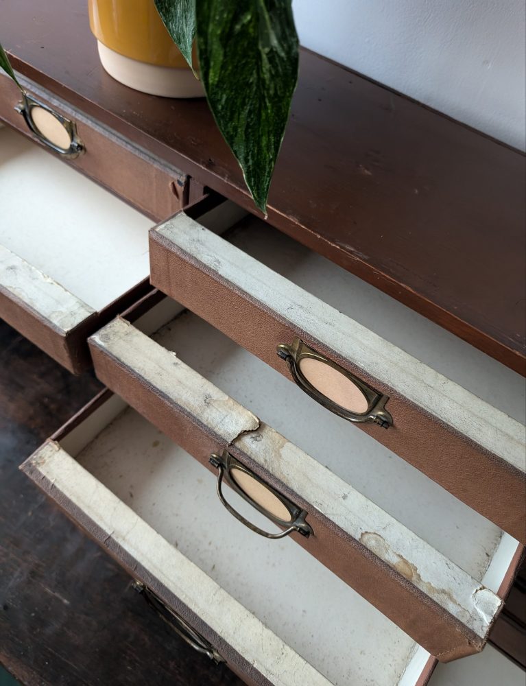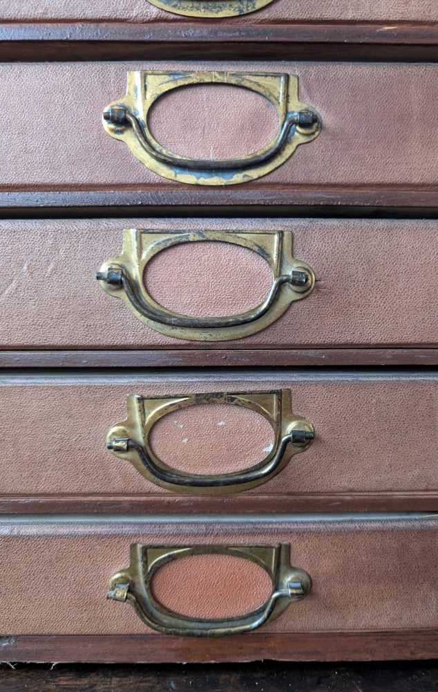 The labels are made from a stock of vintage paper I have from the first part of the twentieth century. They sit within incredibly attractive aged brass pulls and Art Nouveau influenced label holders. Some of the photos show the label holders without the labels if you prefer to remove them (they’d just need sliding out).