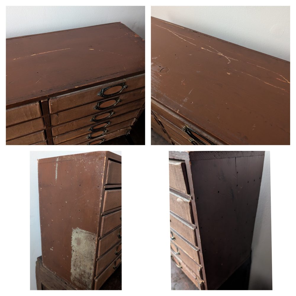 If you’re looking for a very smart piece in a very neat and tidy condition, you may want to look elsewhere but if you appreciate the great style of these drawers, loads of storage and a certain faded splendour, these are a triumph.
