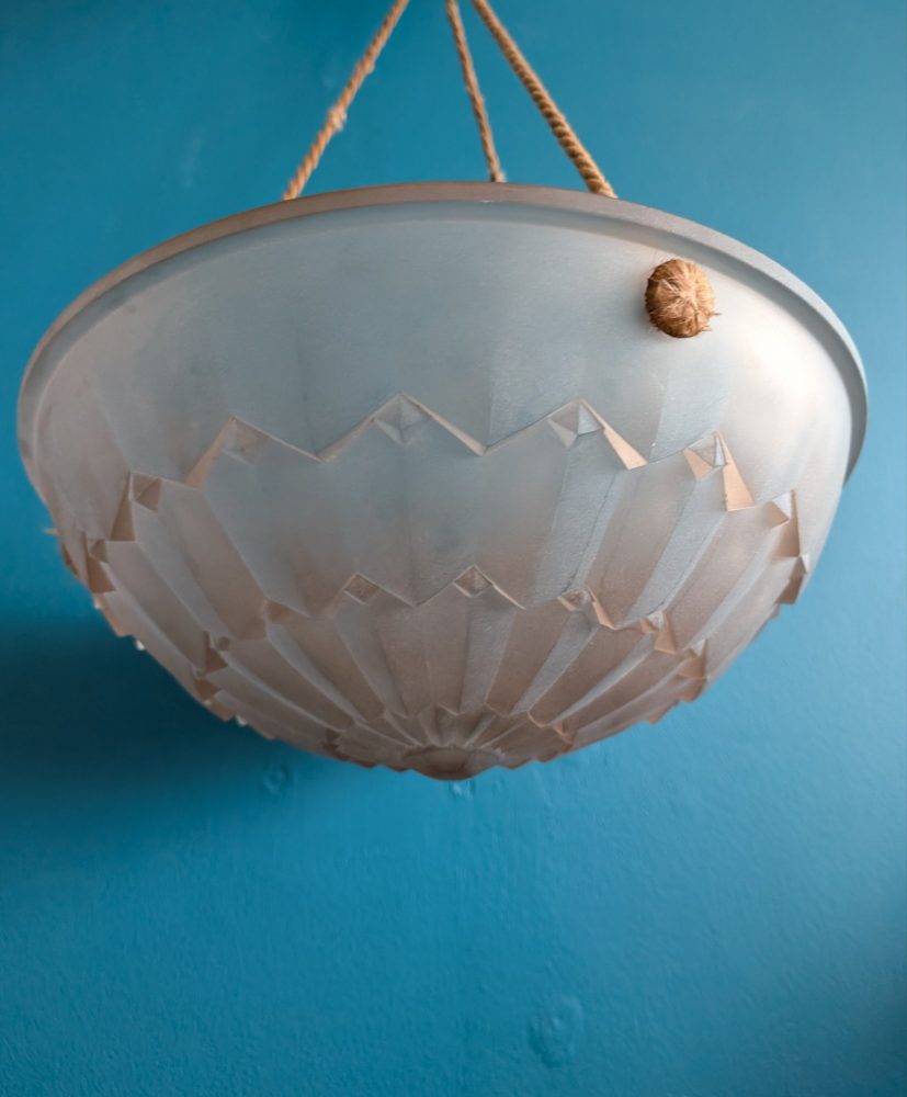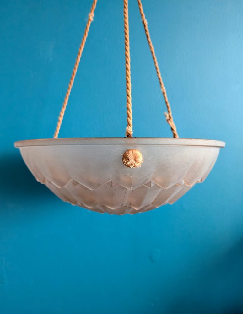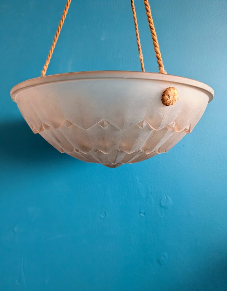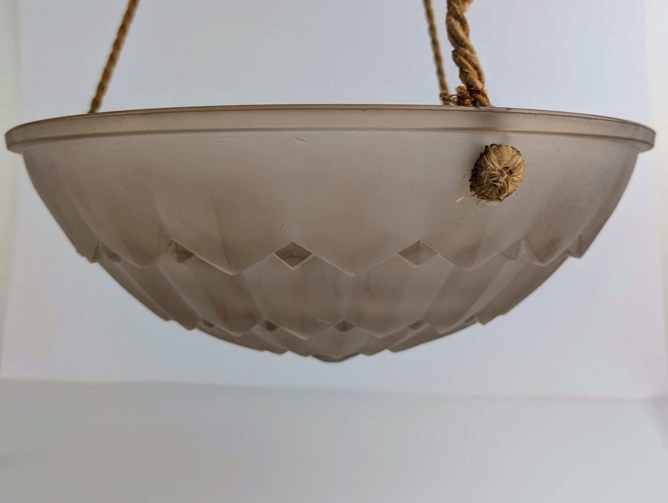 A fantastic 1920s Art Deco pendant frosted glass ceiling light shade with original hanging ropes and a brass ceiling mounting hook.