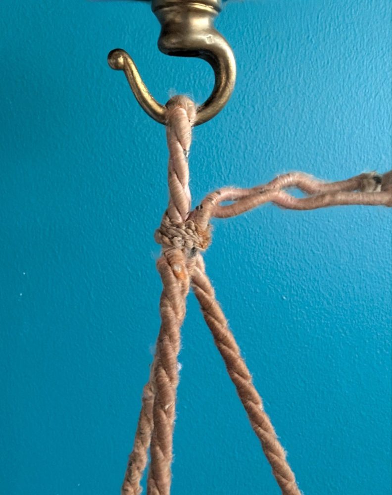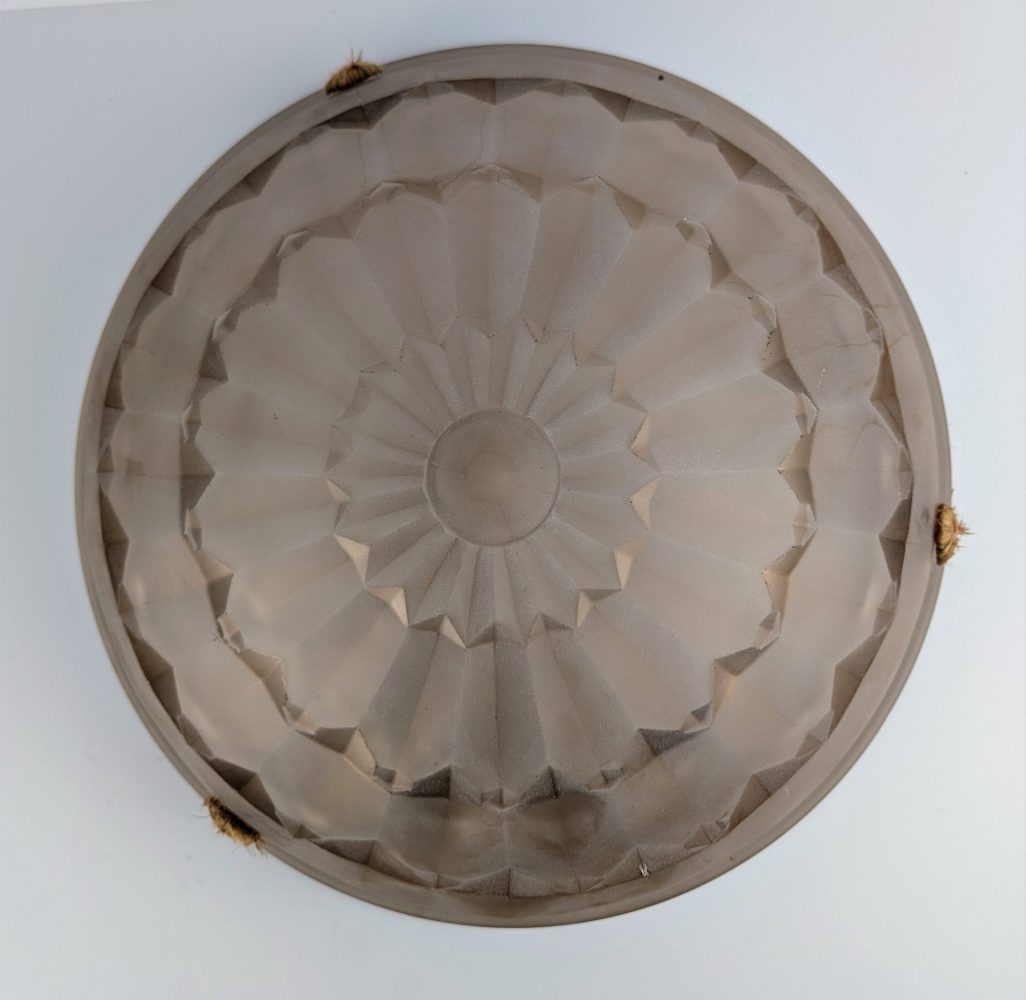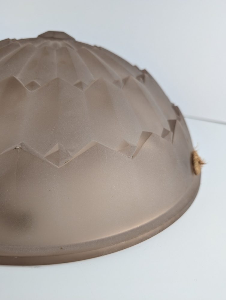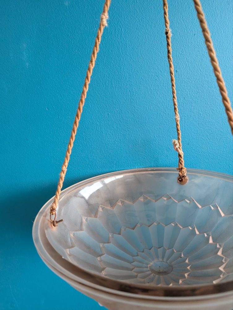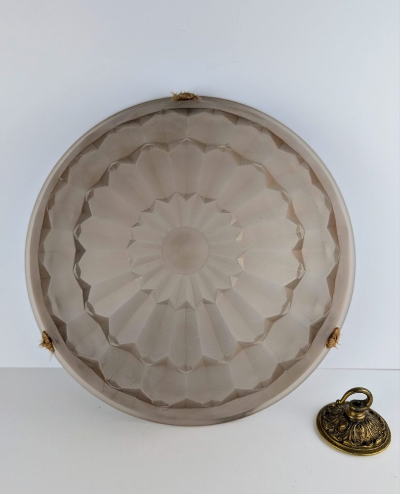 A fantastic 1920s Art Deco pendant frosted glass ceiling light shade with original hanging ropes and a brass ceiling mounting hook.