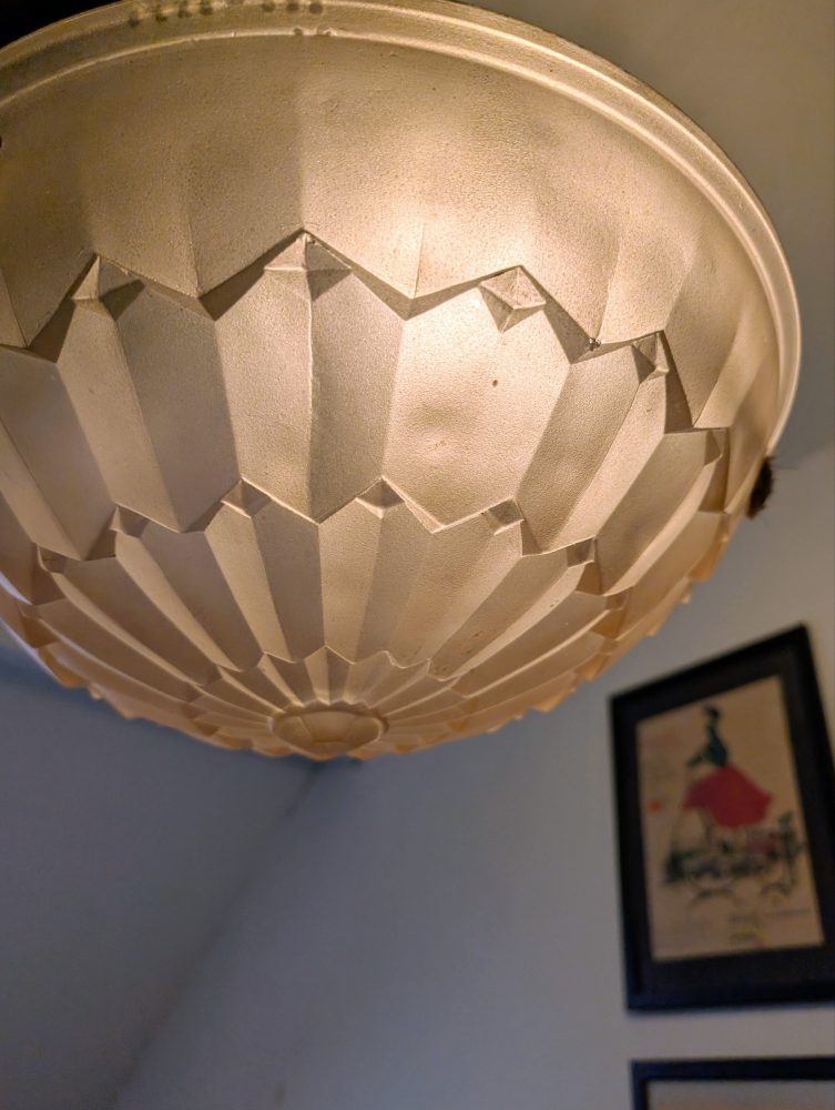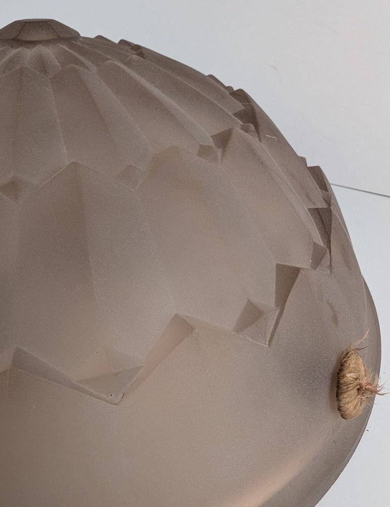 1920s French SEVB frosted glass pendant light shade with brass hanging hook