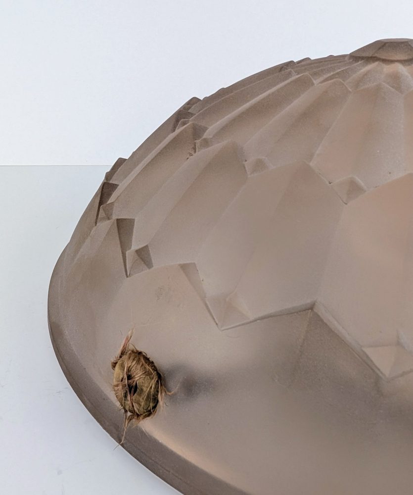 The mark S.E.V.B. 233 embossed on the edge of the shade denotes manufacture by French glassmaker ‘Société d’Exploitation des Verreries de Bagneaux’ near Paris previous to the year 1931.