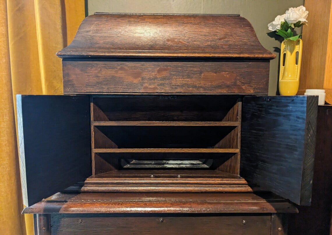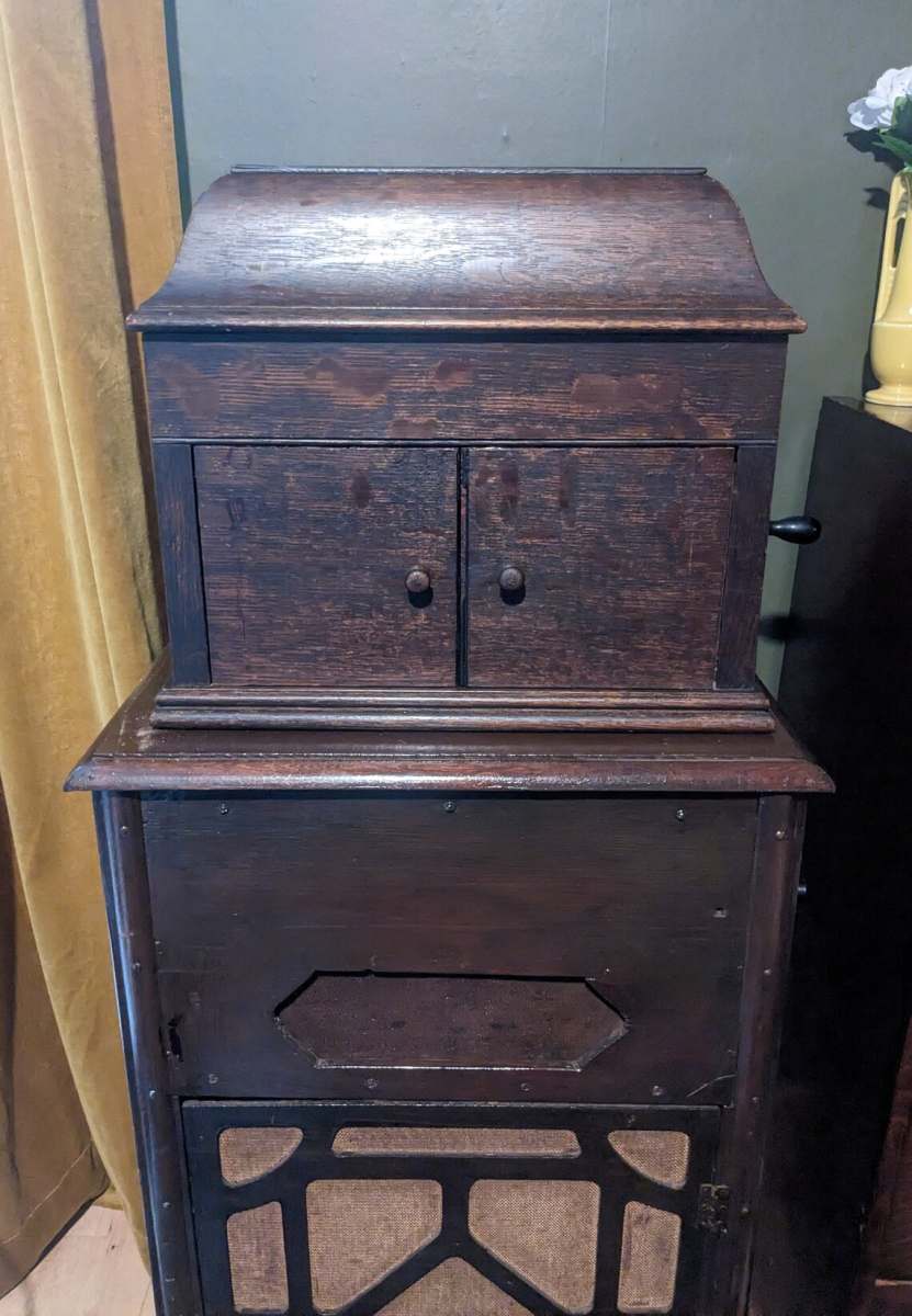 This type of table top Gramophone are larger and more powerful but also with more flexibility in terms of volume level than the standard. The doors to the front are for opening to the exact extent to give you the desired volume of the internal horn via the louvred oak panels. For the best sound, it is advised to close the lid while the record is playing.