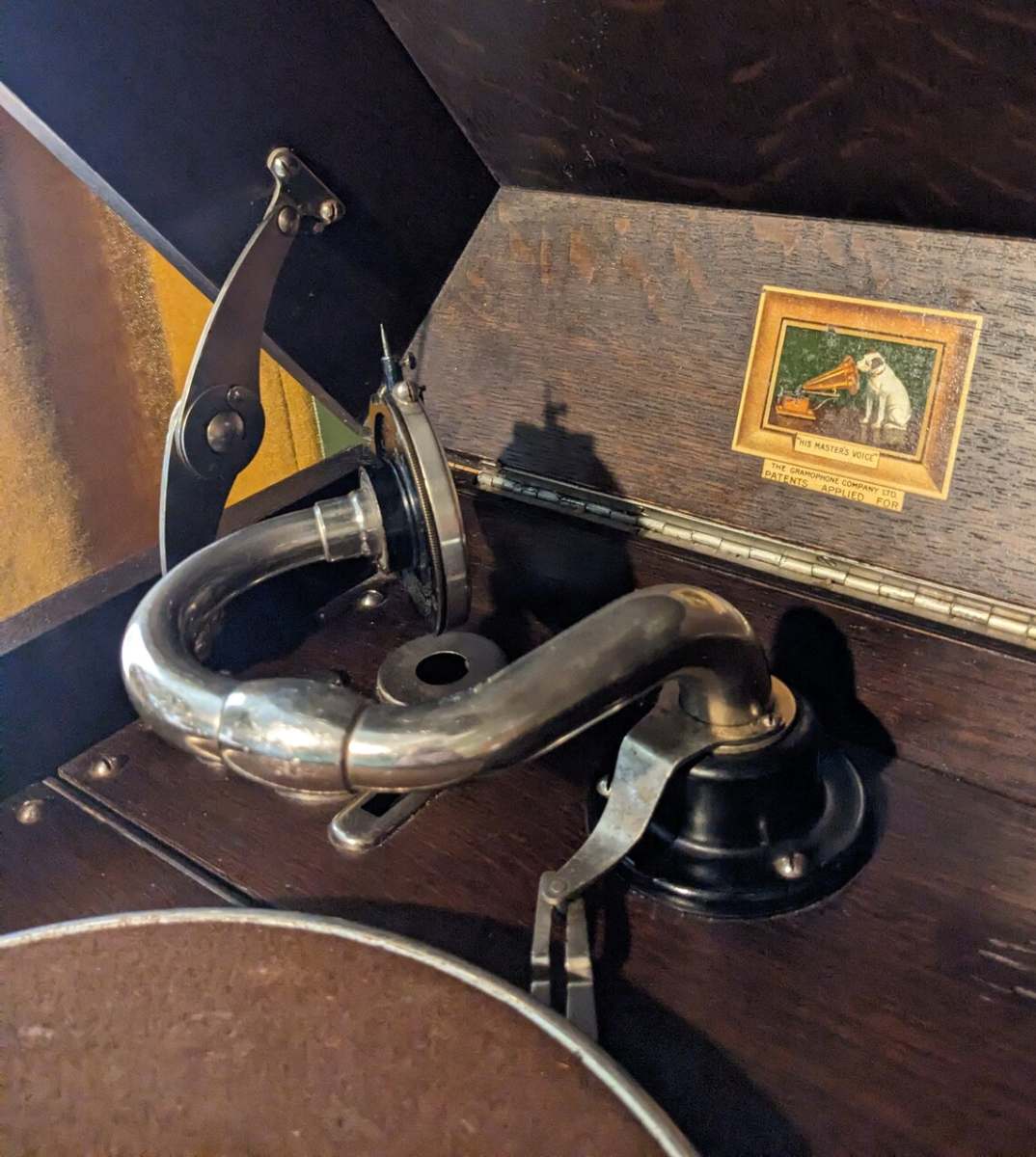 This differs from a Gramophone that requires a large bell in that this amplifies the music with just the ‘sound box’ which is the round piece to which the needle is attached at the end of the ‘tone arm’ rather than requiring a large exterior horn to be heard. This version is more compact and so easier to store and transport. The volume and quality of sound is plenty loud enough and of a very listenable quality.