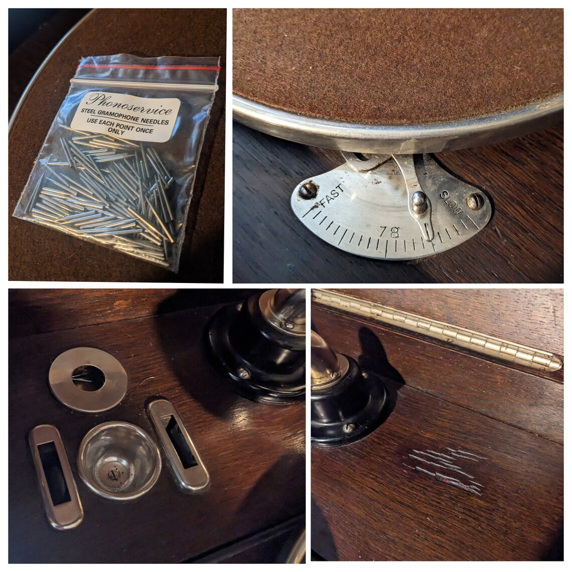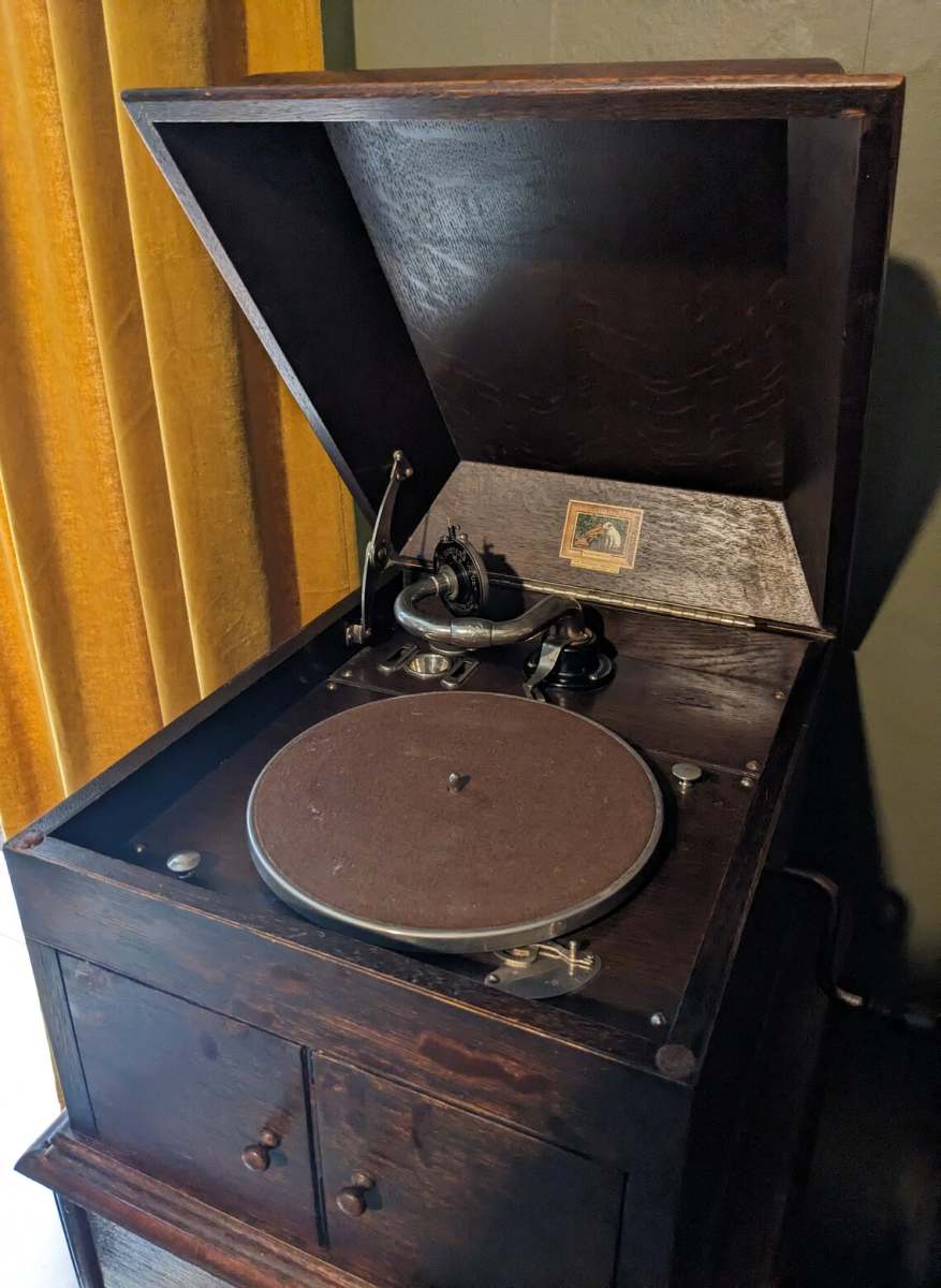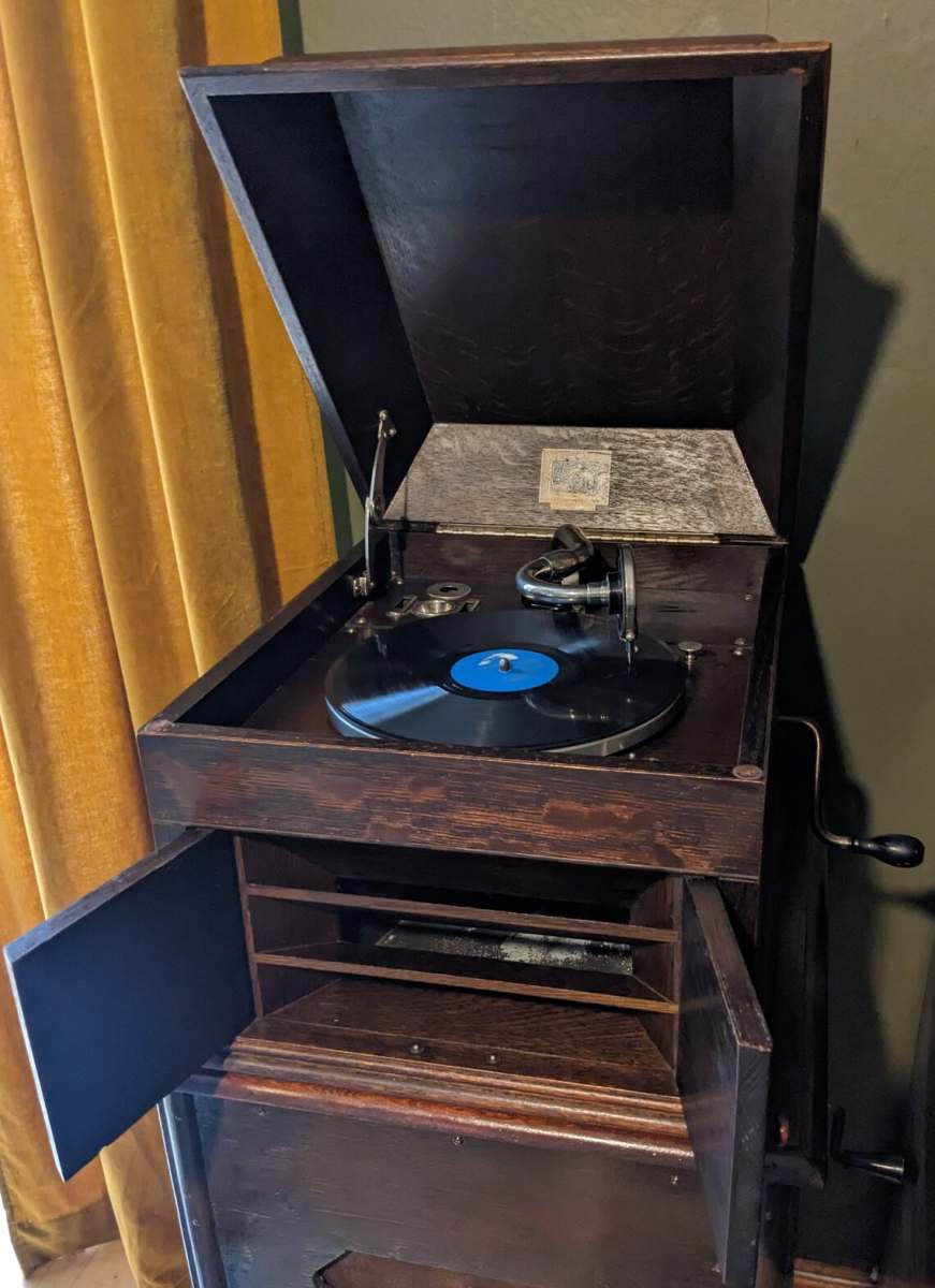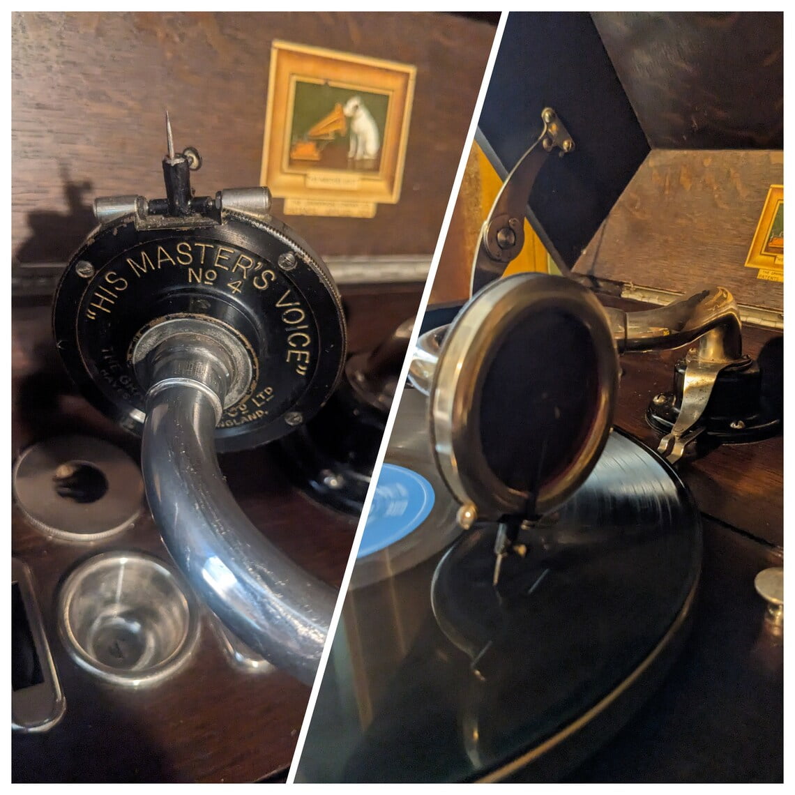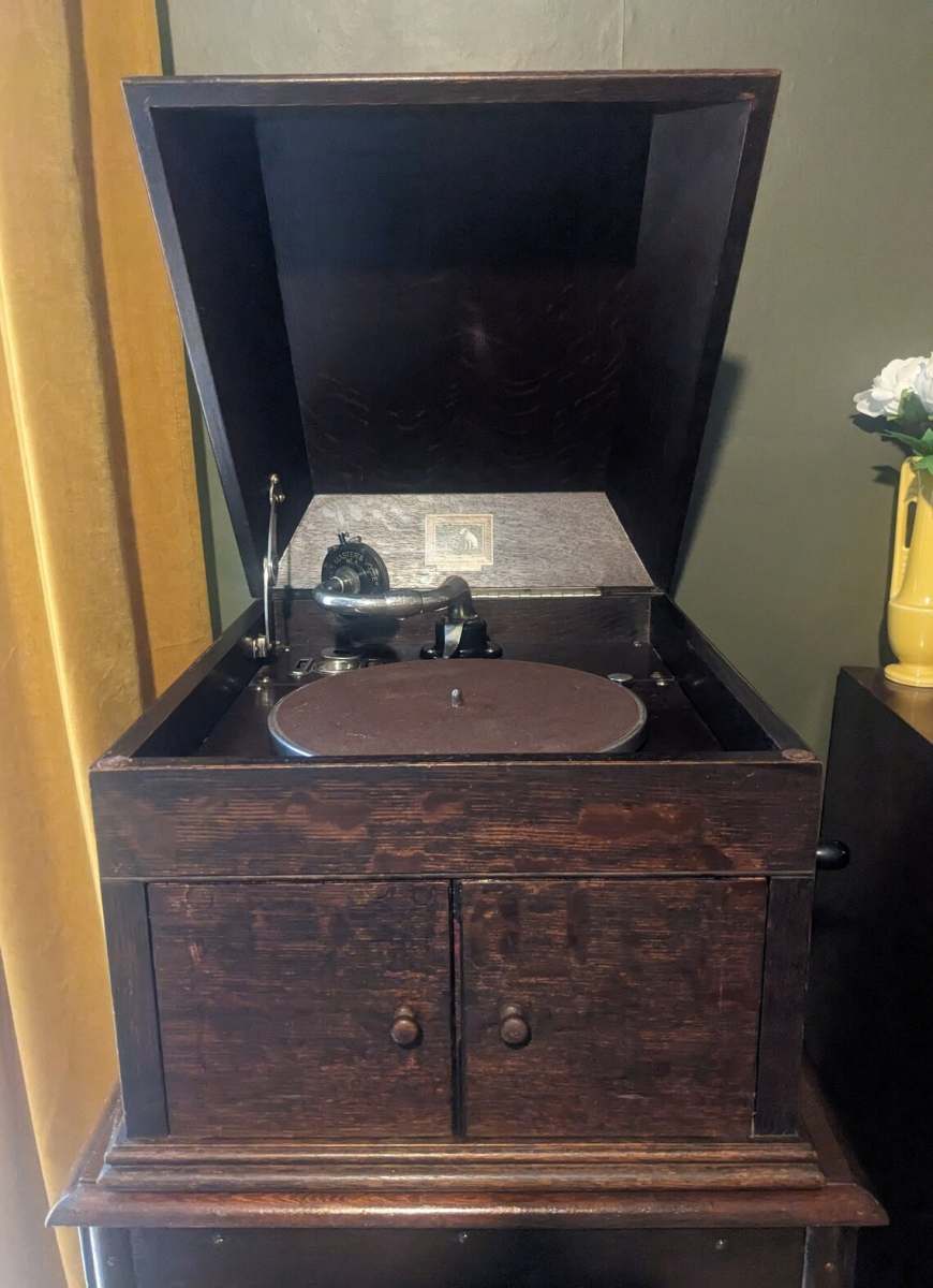 This gramophone has an automatic turntable start mechanism (by bringing the tonearm/soundbox all the way to the right side it will set the turntable in motion, then at the end of the record, the rightward movement of the arm caused by the eliptical ring groove causes the record to stop spinning. This saves your hard earned winding for just when you’re listening to music! This is not a feature of every gramophone and is a very appealing one to those who are familiar with them.