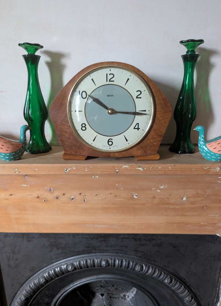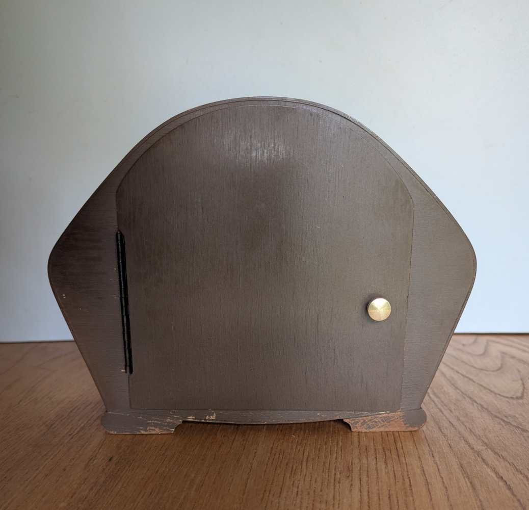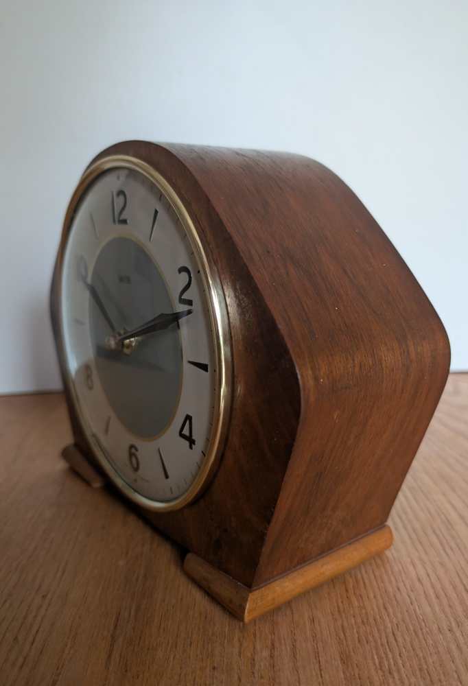 With bags of Art Deco style, with its bulging rounded sides and beige clock face with stylish gold tone hands and numerals, pointing to a more minimal, midcentury design to come, but continuing the tradition of the ‘Napoleon hat’ type mantel clocks of previous decades, with an updated shape.