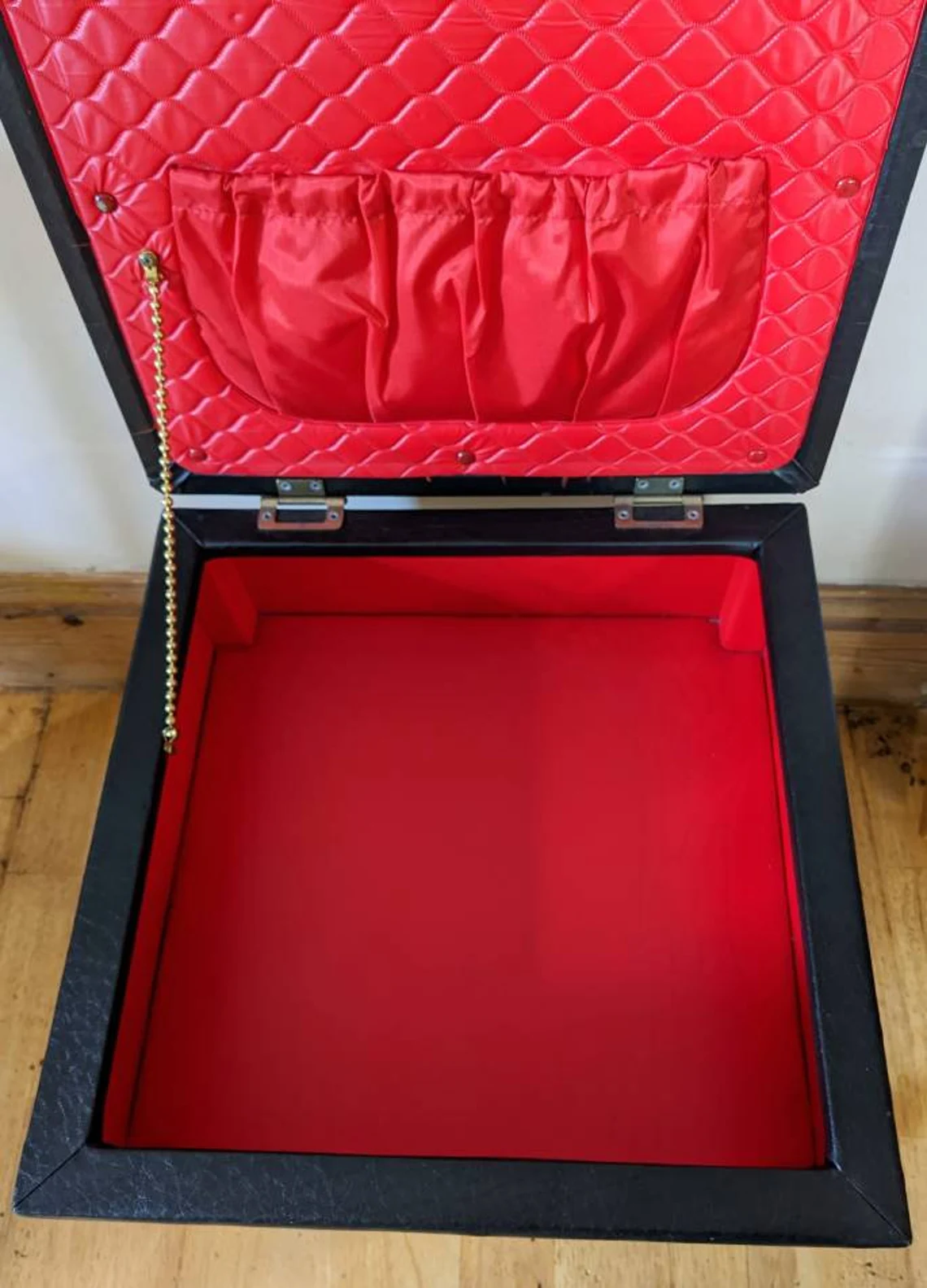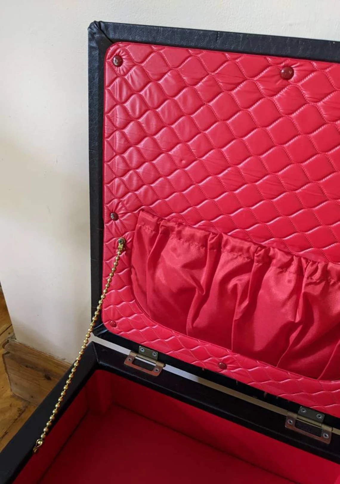 With a buttoned top, of textured vinyl, and a bold bright red lined interior to the storage area inside, and a padded underside of the lid which also has an elasticated pocket. A gold colour chain keeps the lid open to the ideal extent.