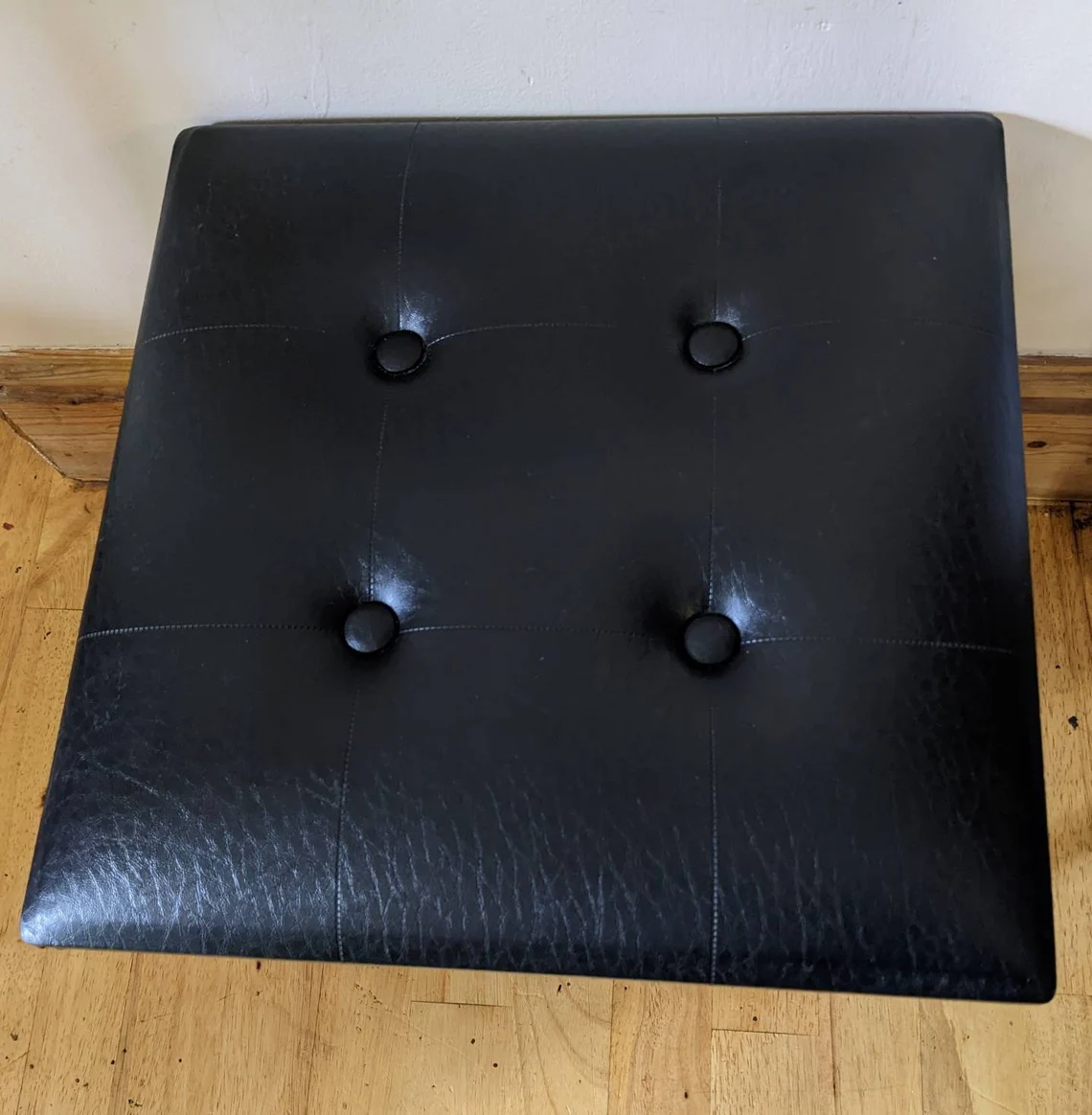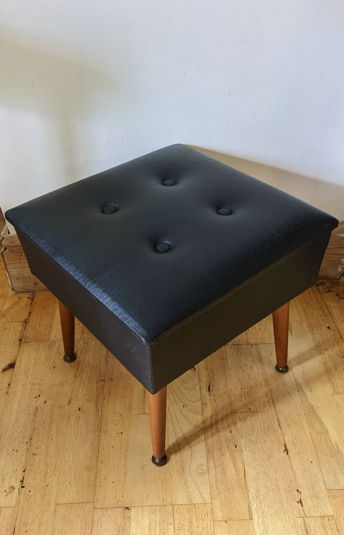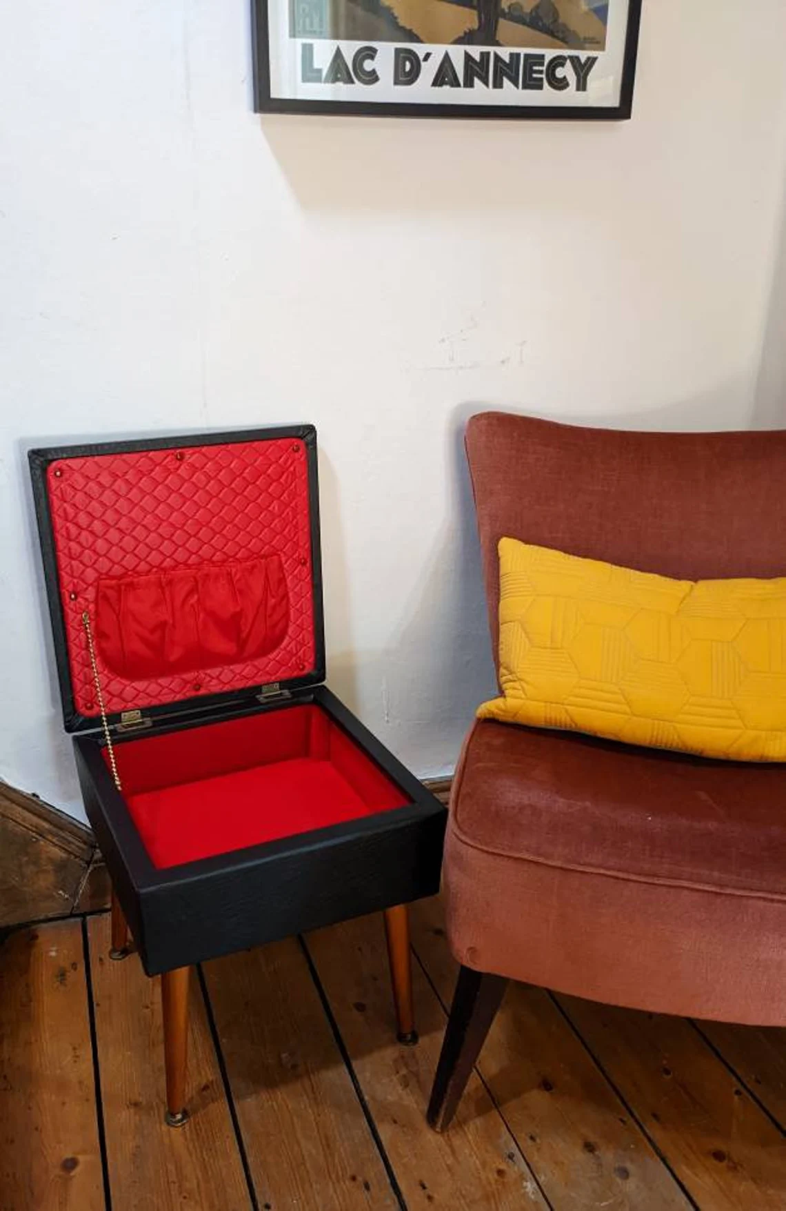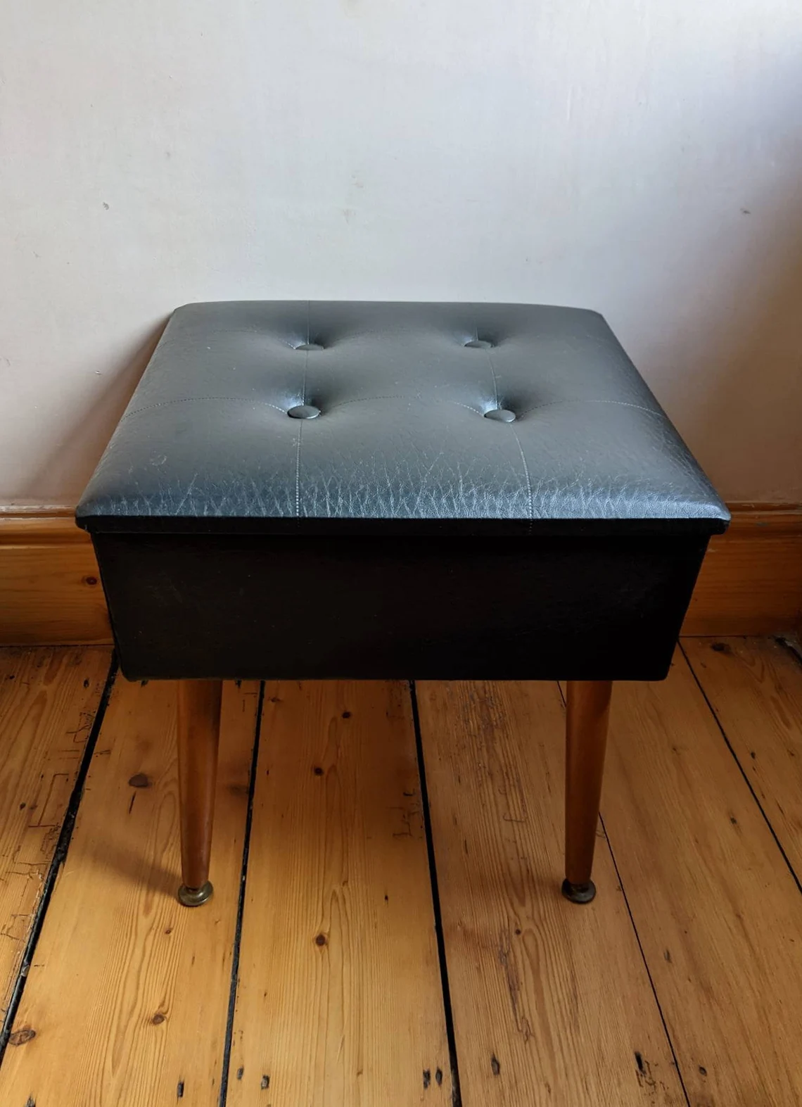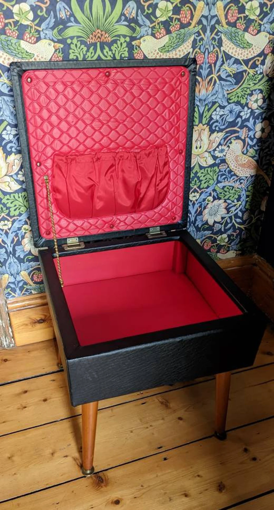 A wonderful 1960s black vinyl footstool / sewing box with an incredible bright red interior in astonishingly good condition.