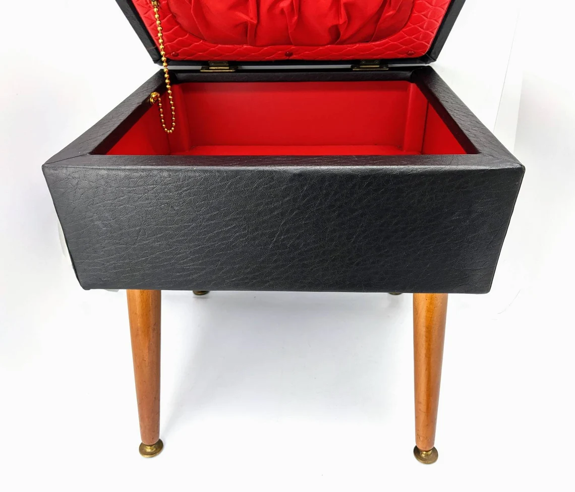 1960s black vinyl sewing box / footstool with bright red interior