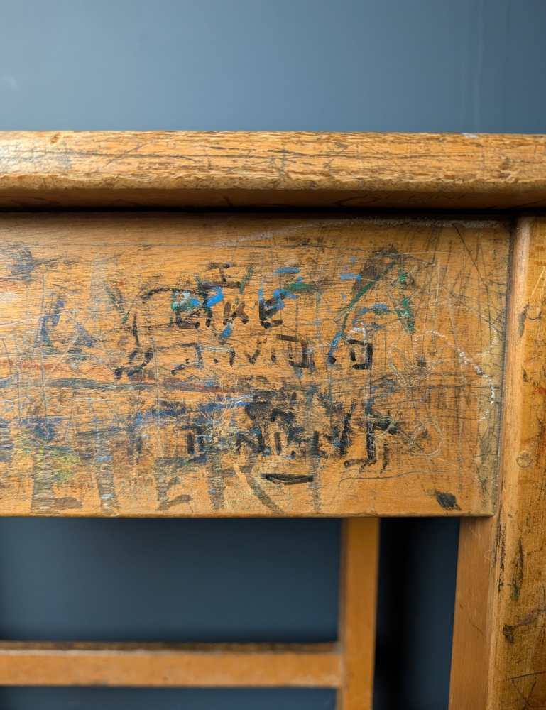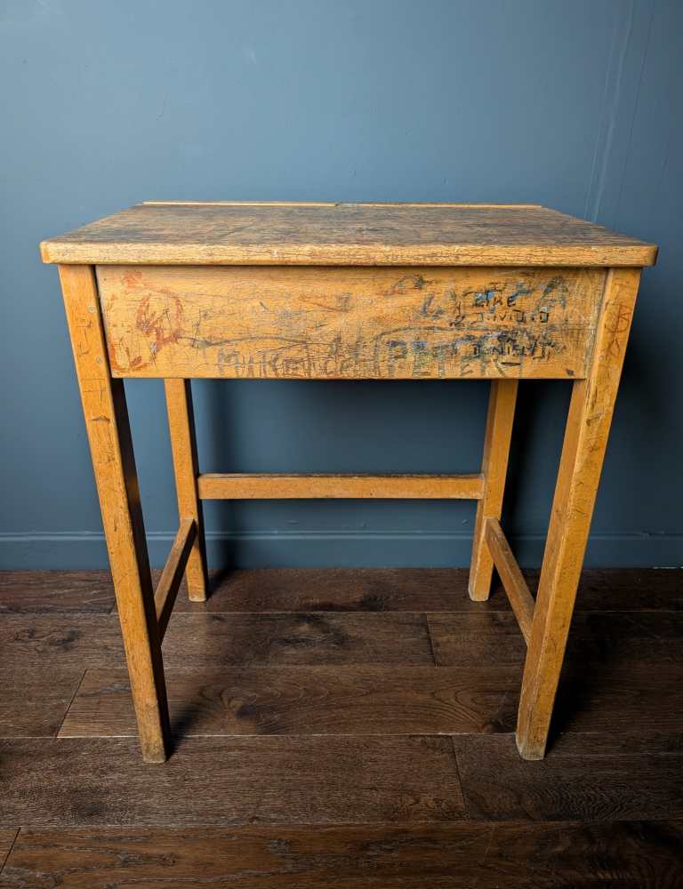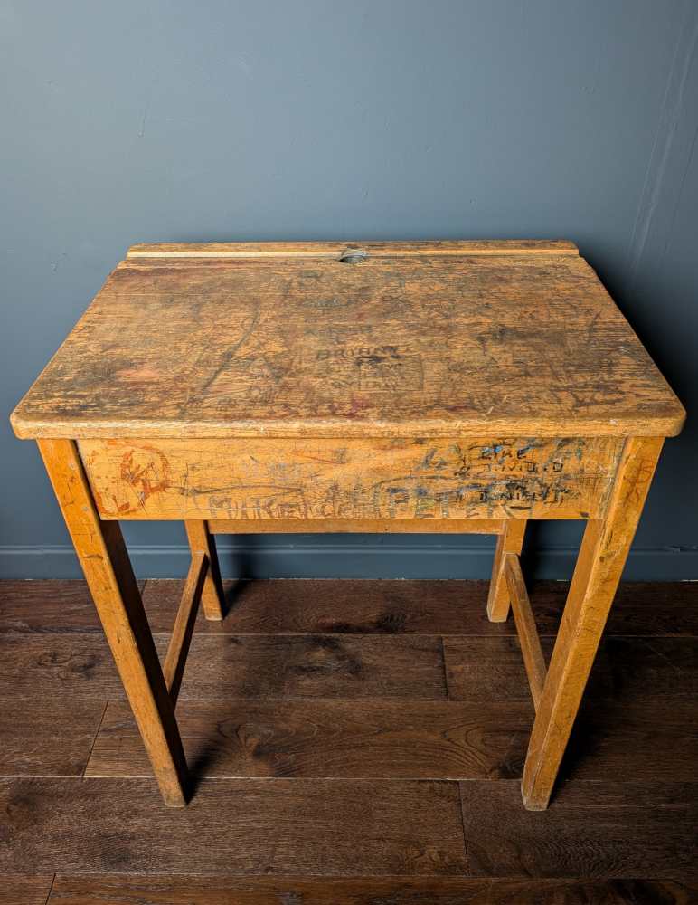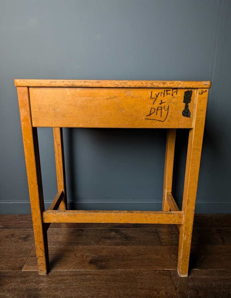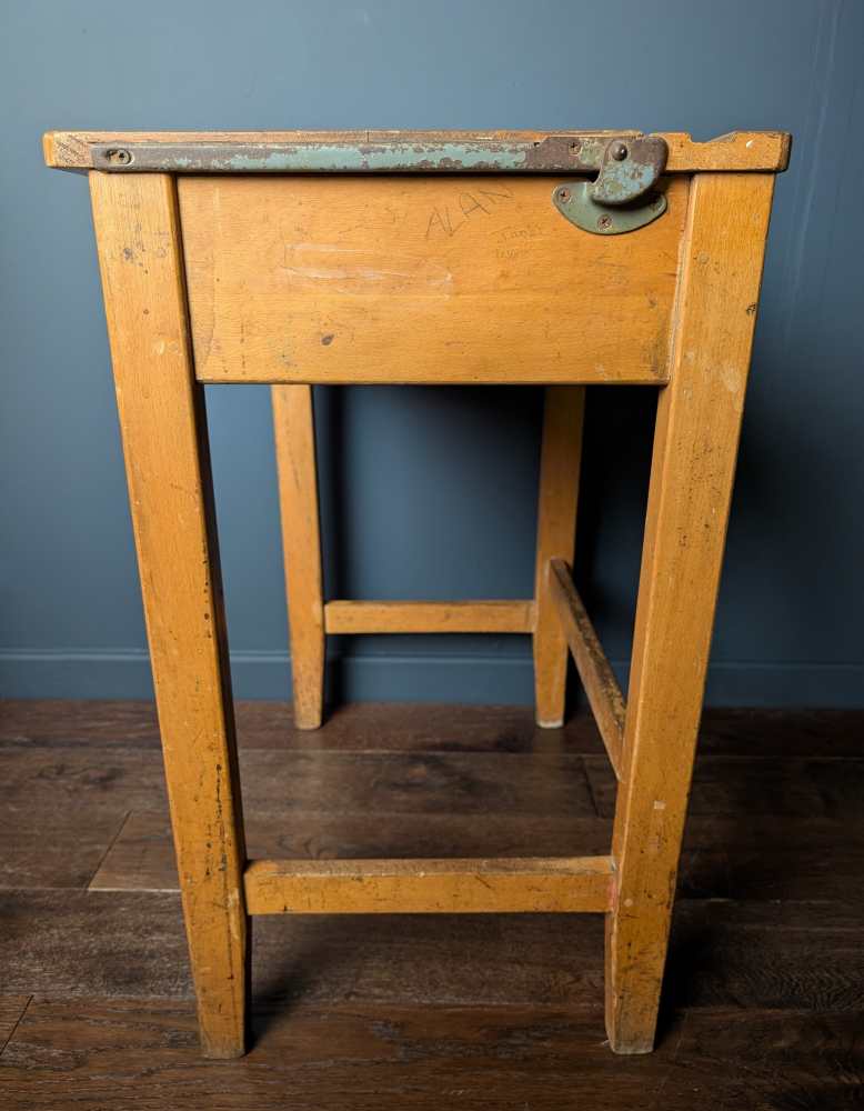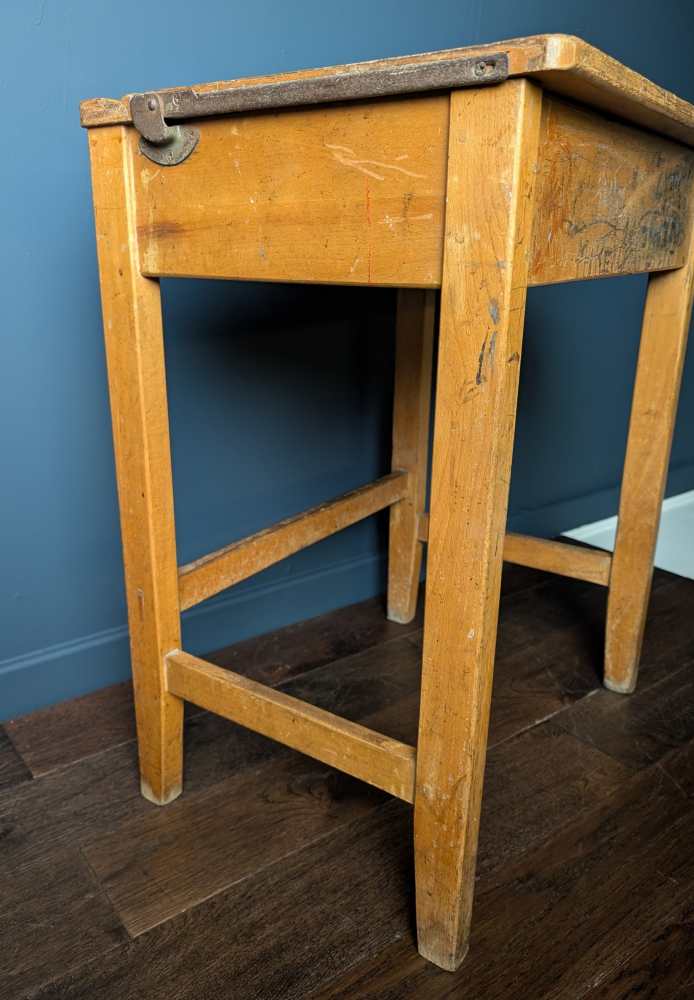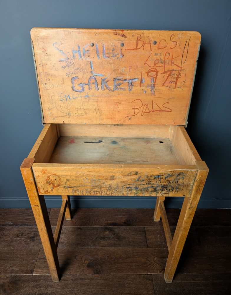 A great piece of teenage history in a midcentury beech wood school desk, in a classic style which will be known well by many, with pen recess at the back with a central inkwell, and a lift-up lid for books, sheets, maybe a poster of… Cliff Richard? Jane Fonda?
