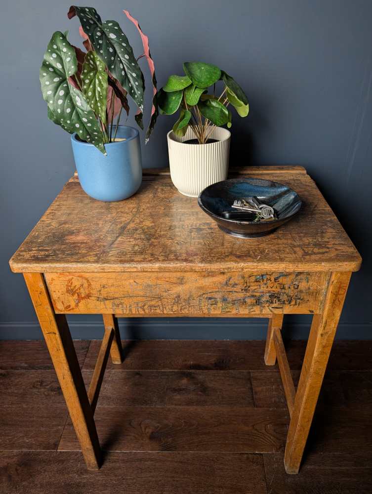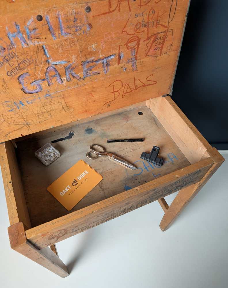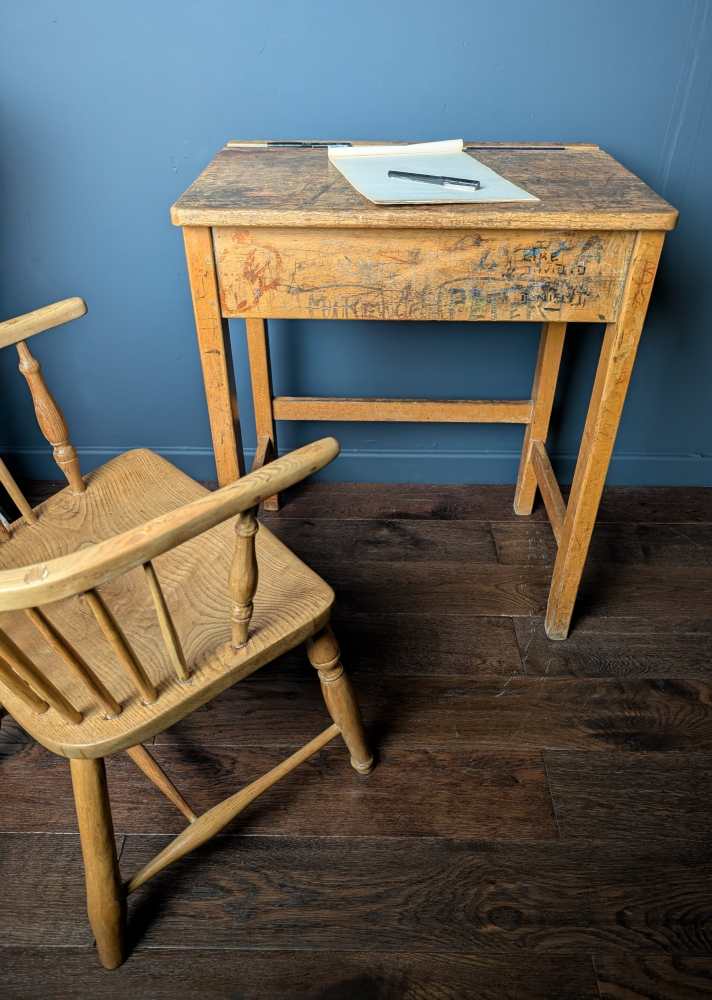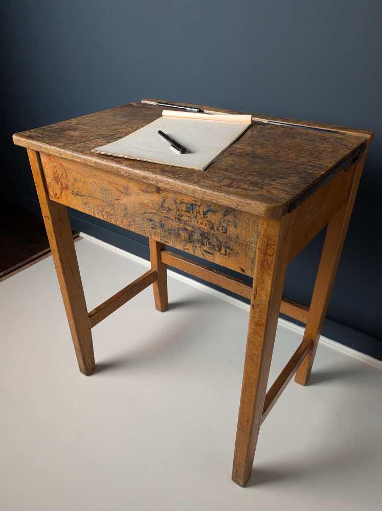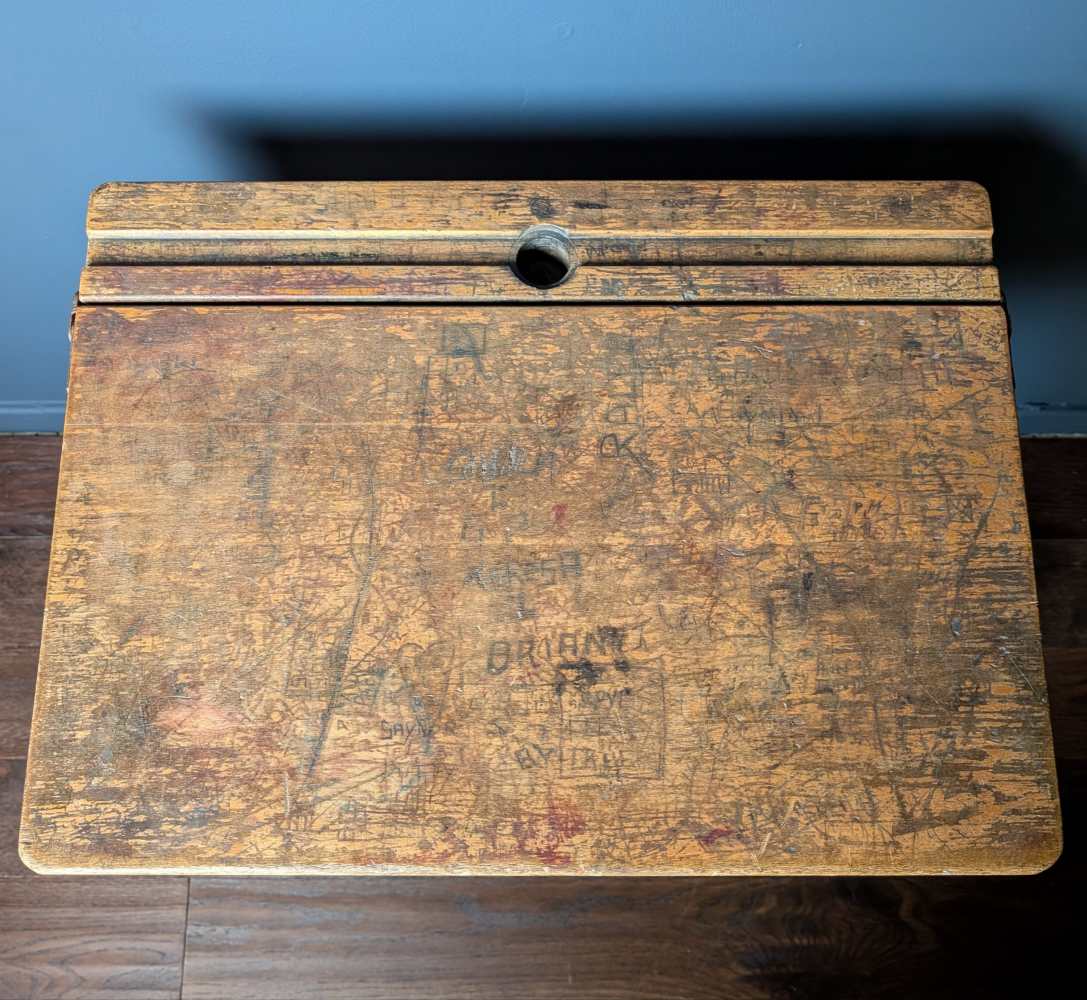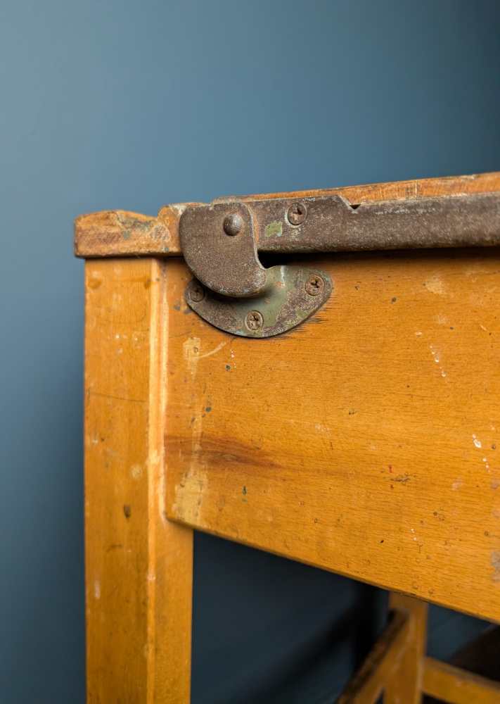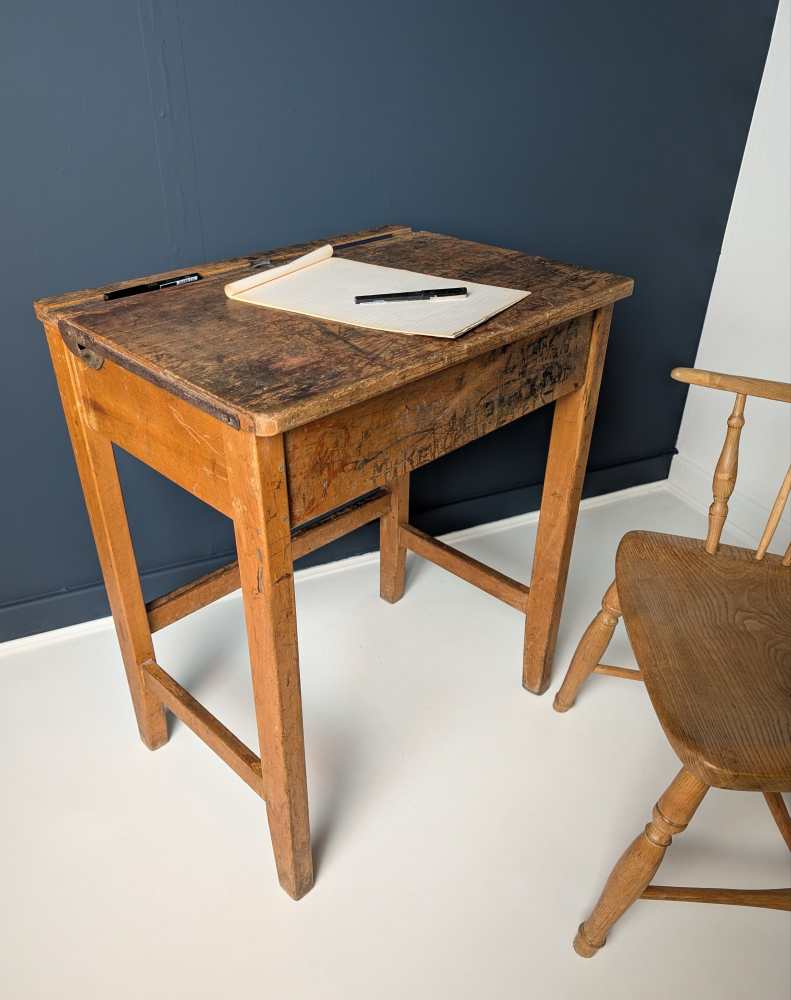 A great piece of teenage history in a midcentury beech wood school desk, in a classic style which will be known well by many, with pen recess at the back with a central inkwell, and a lift-up lid for books, sheets, maybe a poster of… Cliff Richard? Jane Fonda?