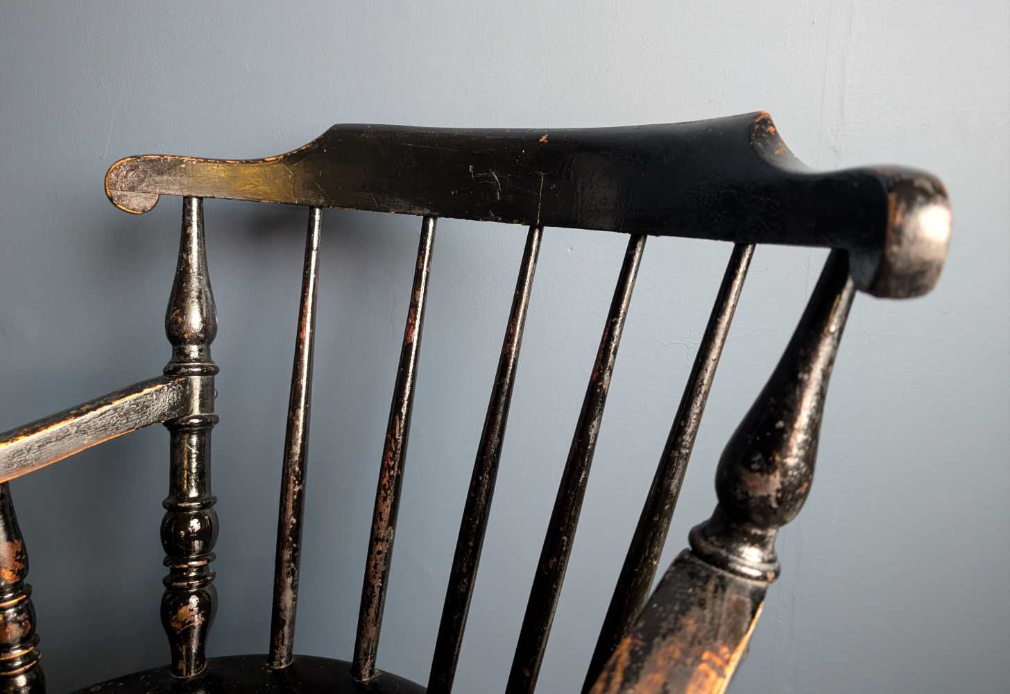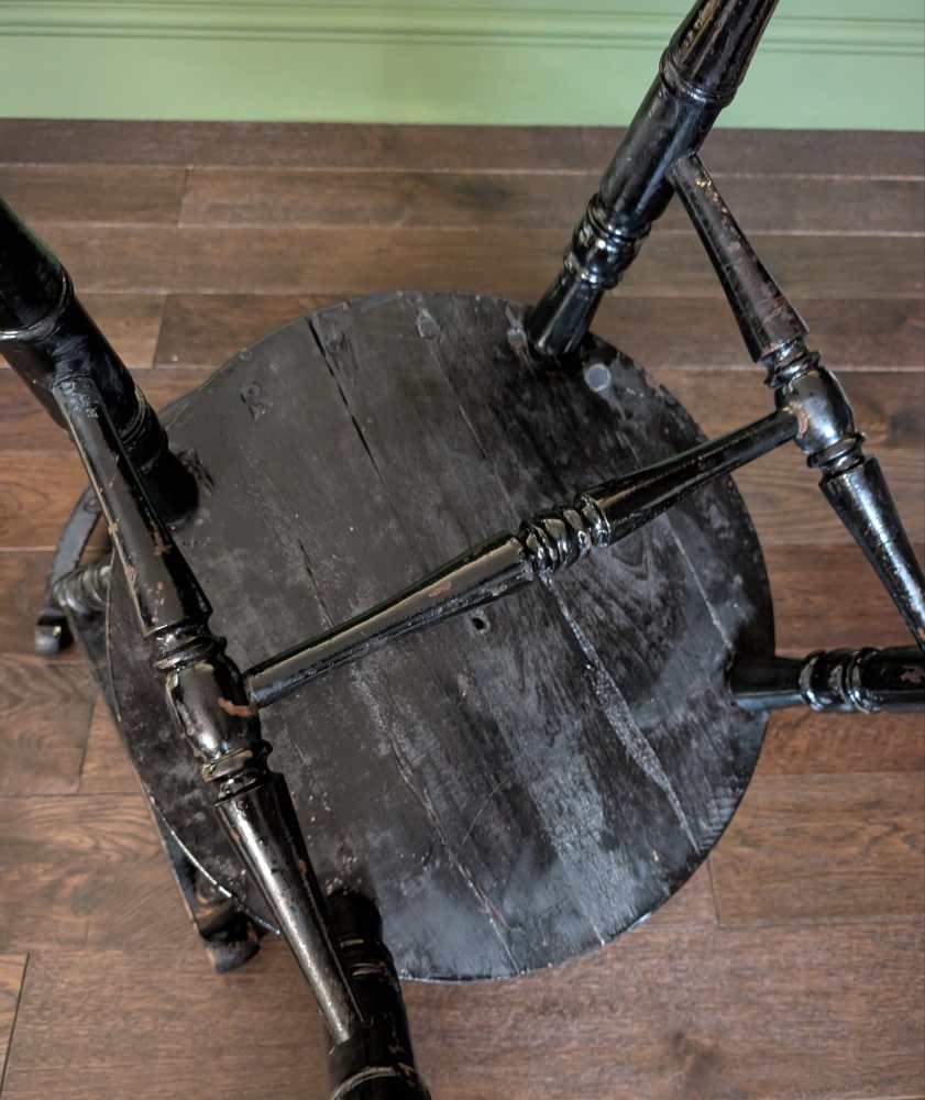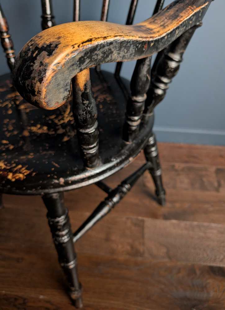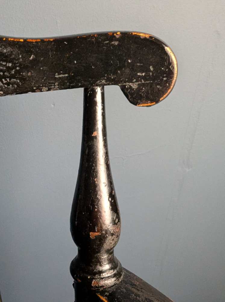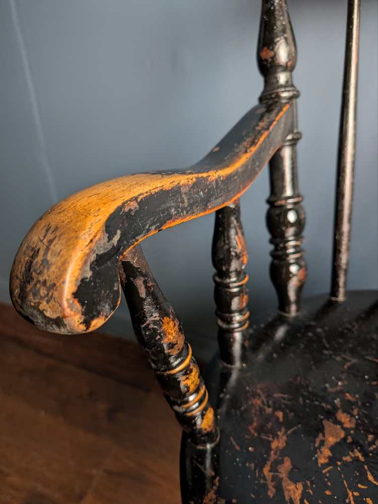 Beneath the seat are turned H stretchers echoing the side posts above. The back spindles lighten the piece, but the seat is larger than most, a round rather than common curved square. Known as a ‘penny’ seat due to the shape, this one has fantastic original paintwork, revealing the wood beneath in naturally worn places.