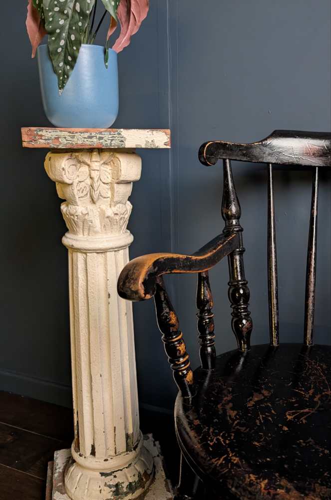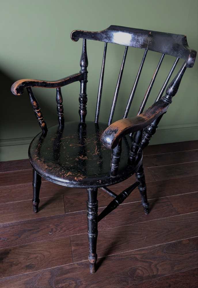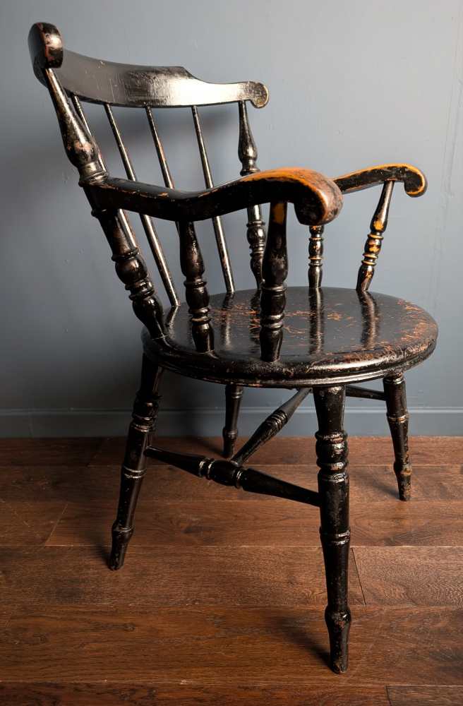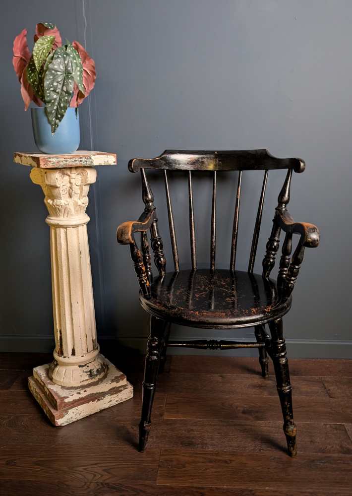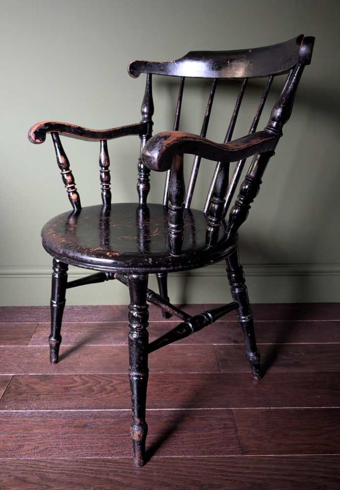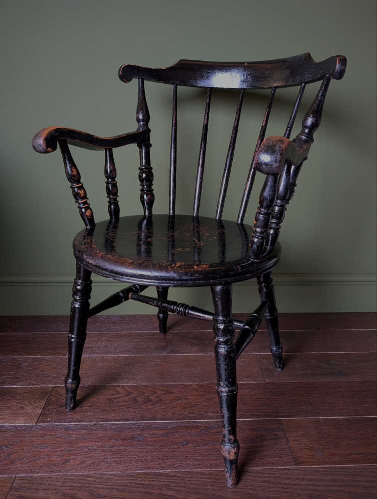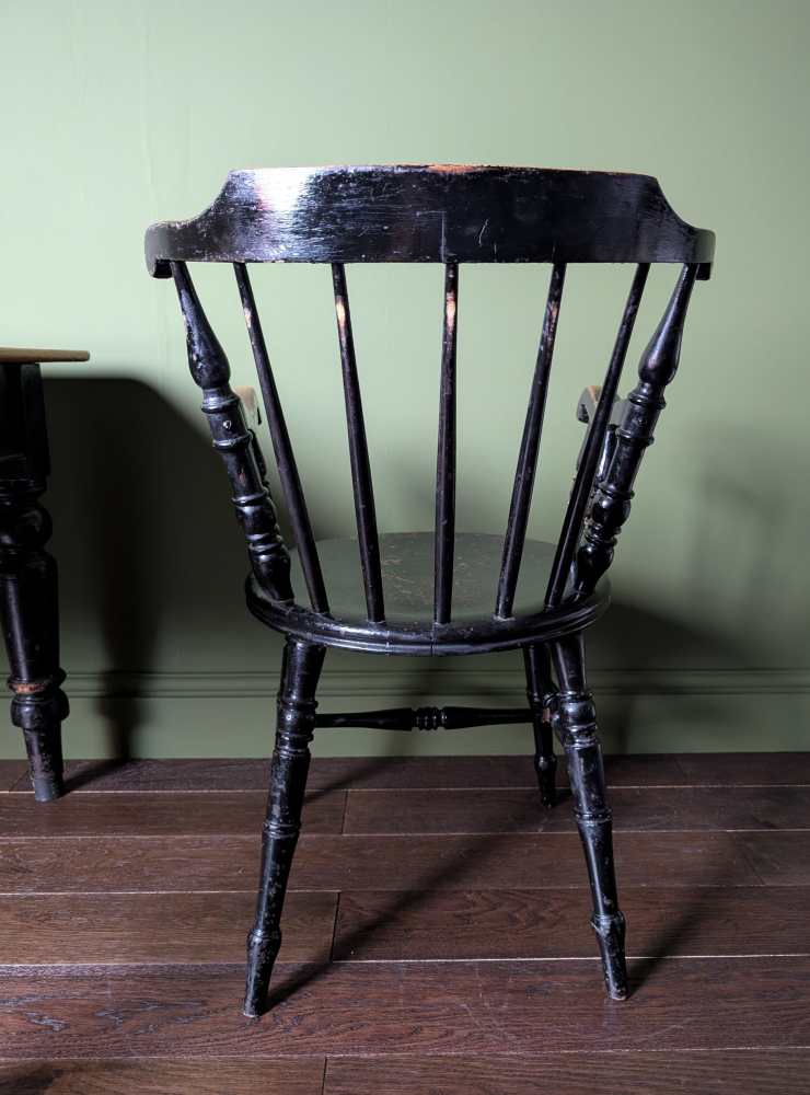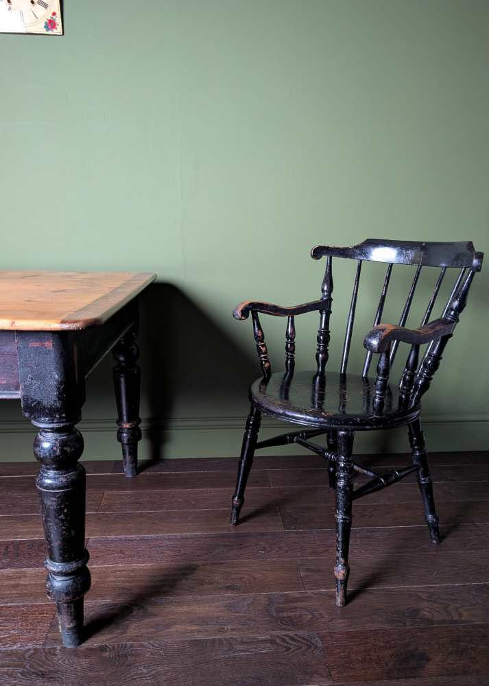 It’s of a similar period and had the same, fantastic worn black paint as the legs of this dining table which it would works brilliantly at the head of: