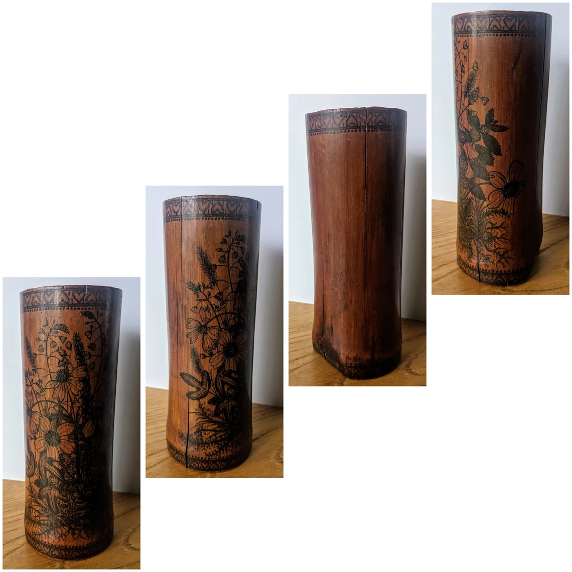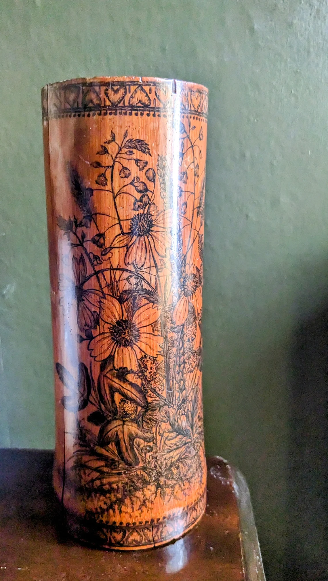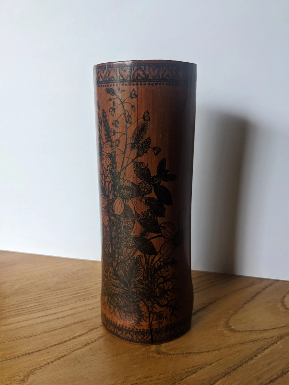 A 19th century bamboo Chinese paint brush pot, beautifully decorated with a lovely hand-painted floral design around the outside, with a circle of hearts to the brim.