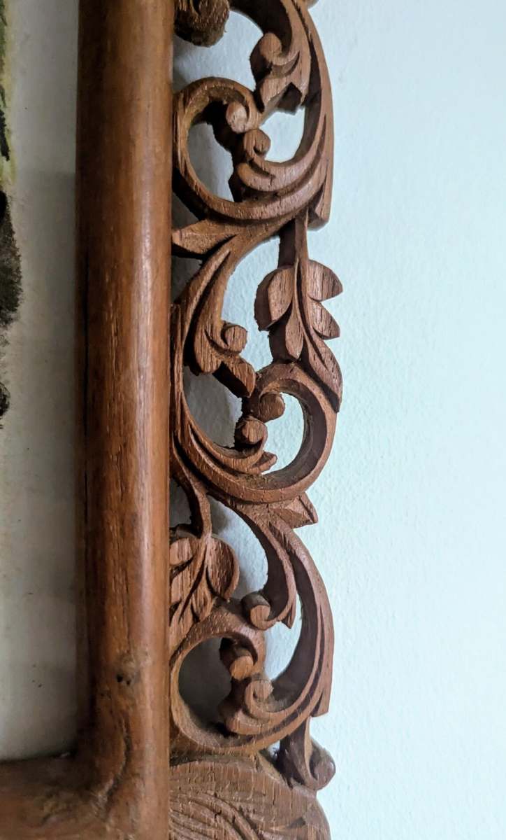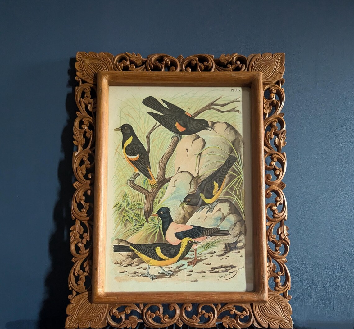 The ornate fretwork carved wooden vintage frame with its leaves pairs beautifully and fits perfectly with the birds in foliage.