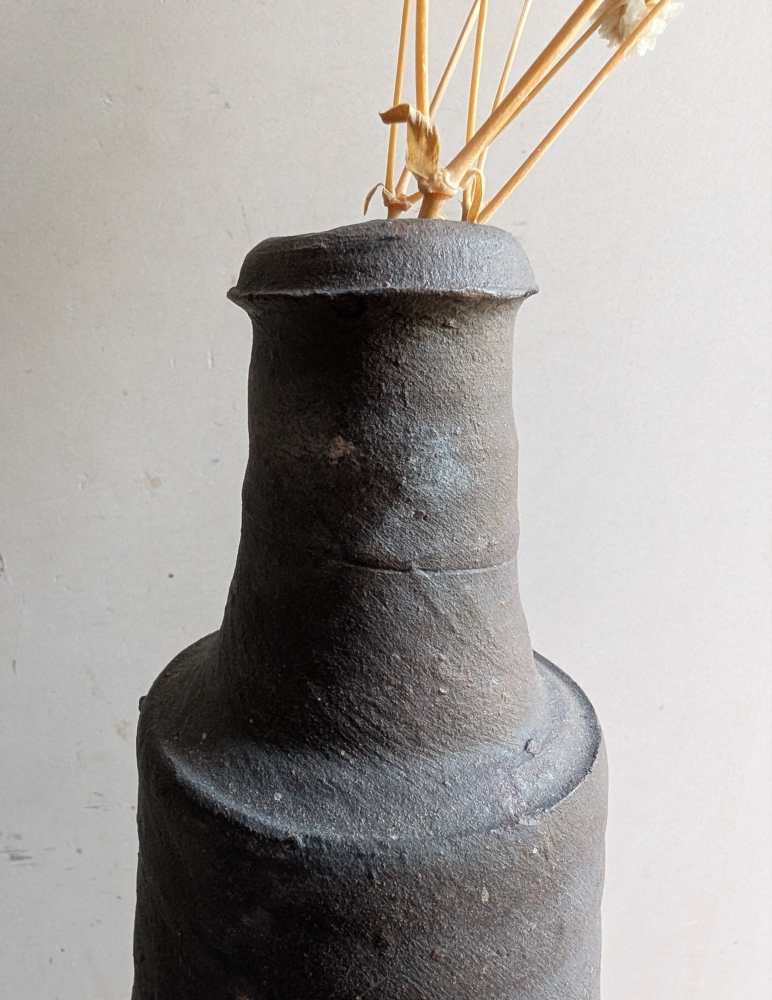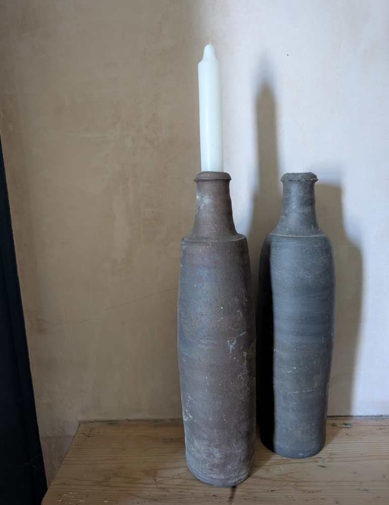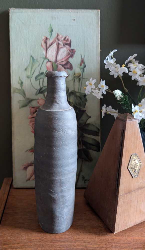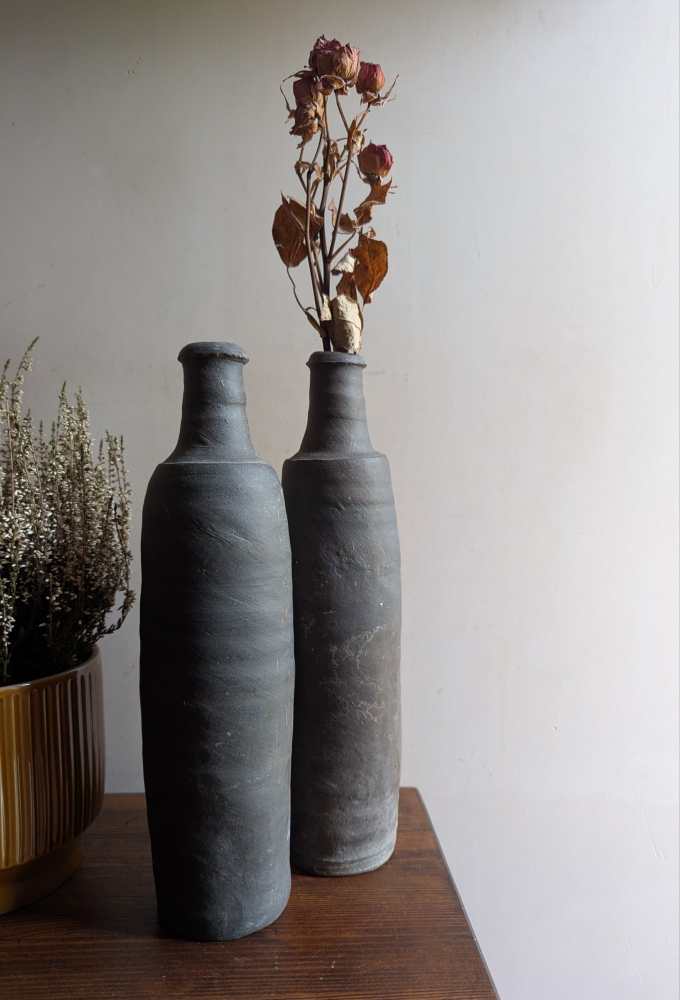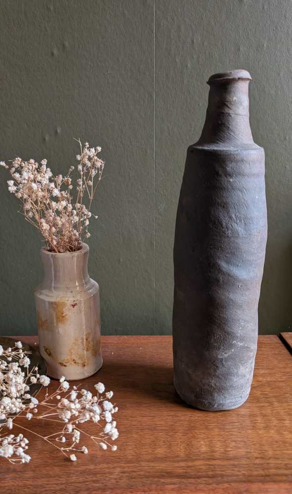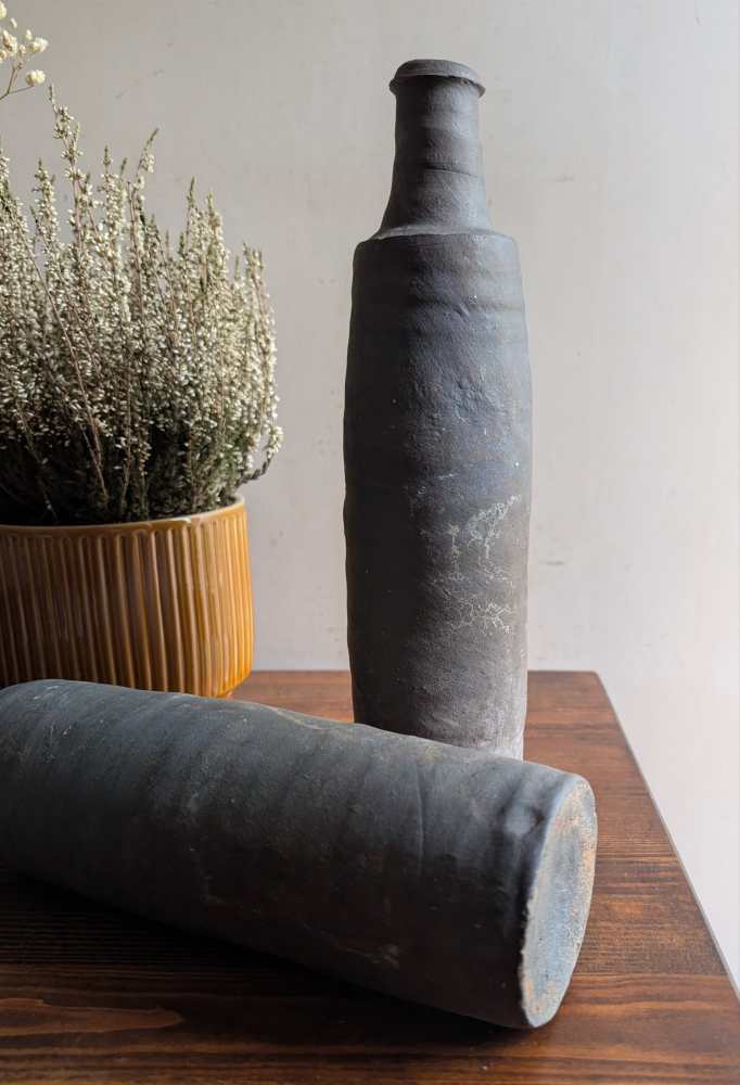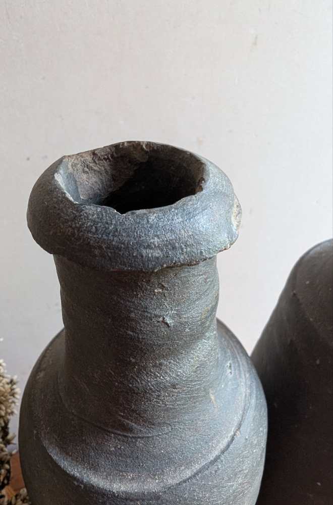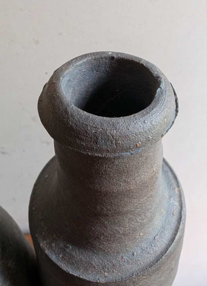 A wonderful pair of late 18th century stoneware bottles with a dark grey colour and charming handmade forms.