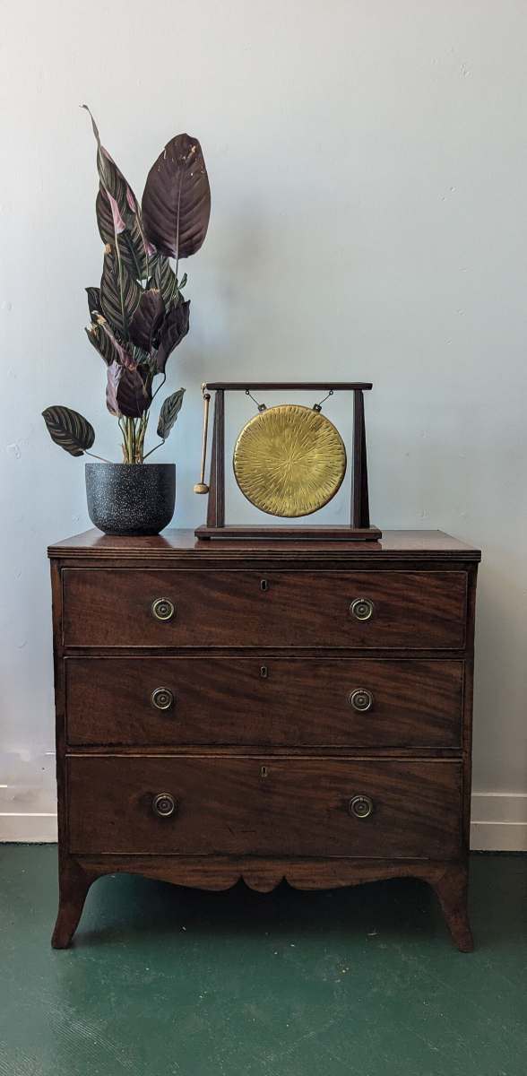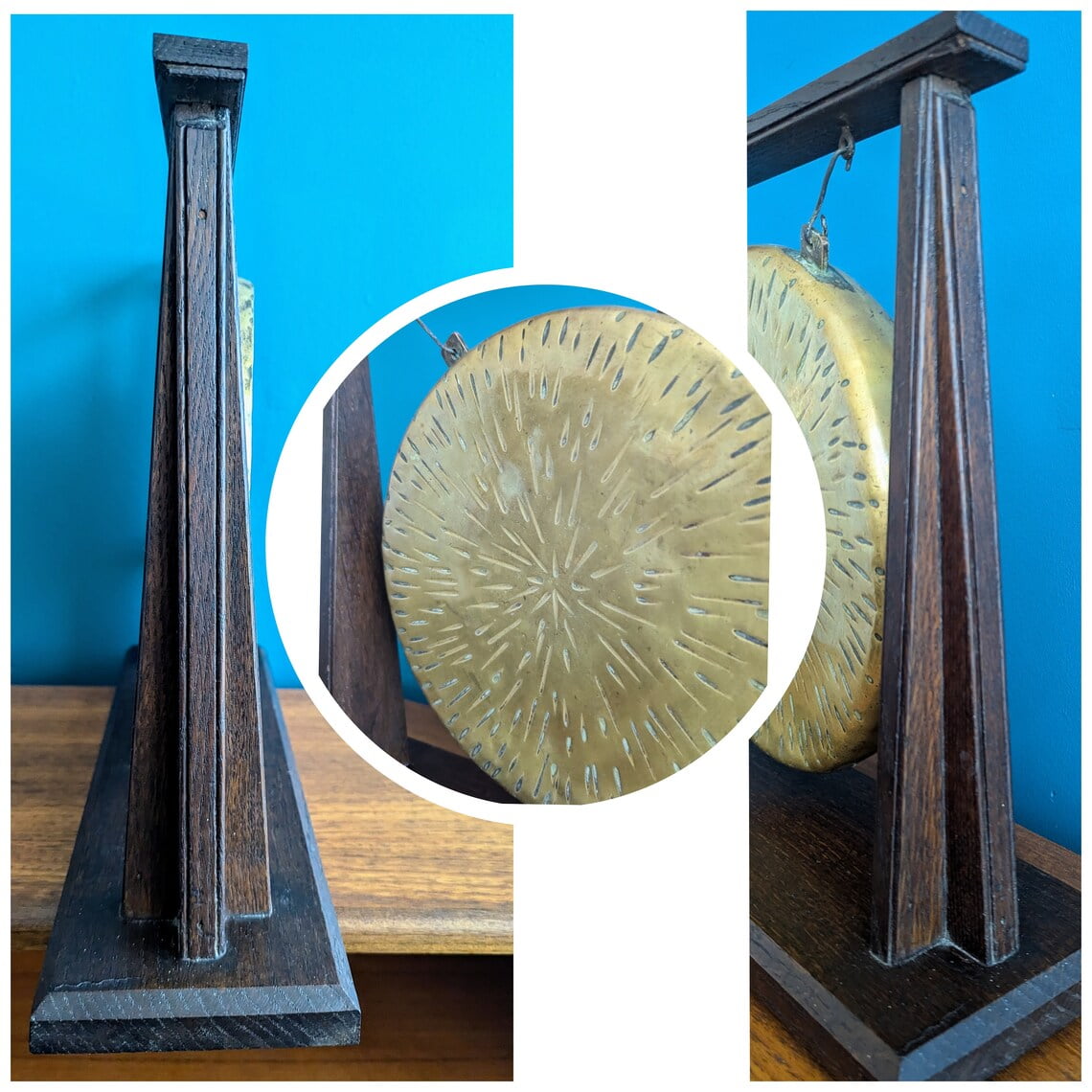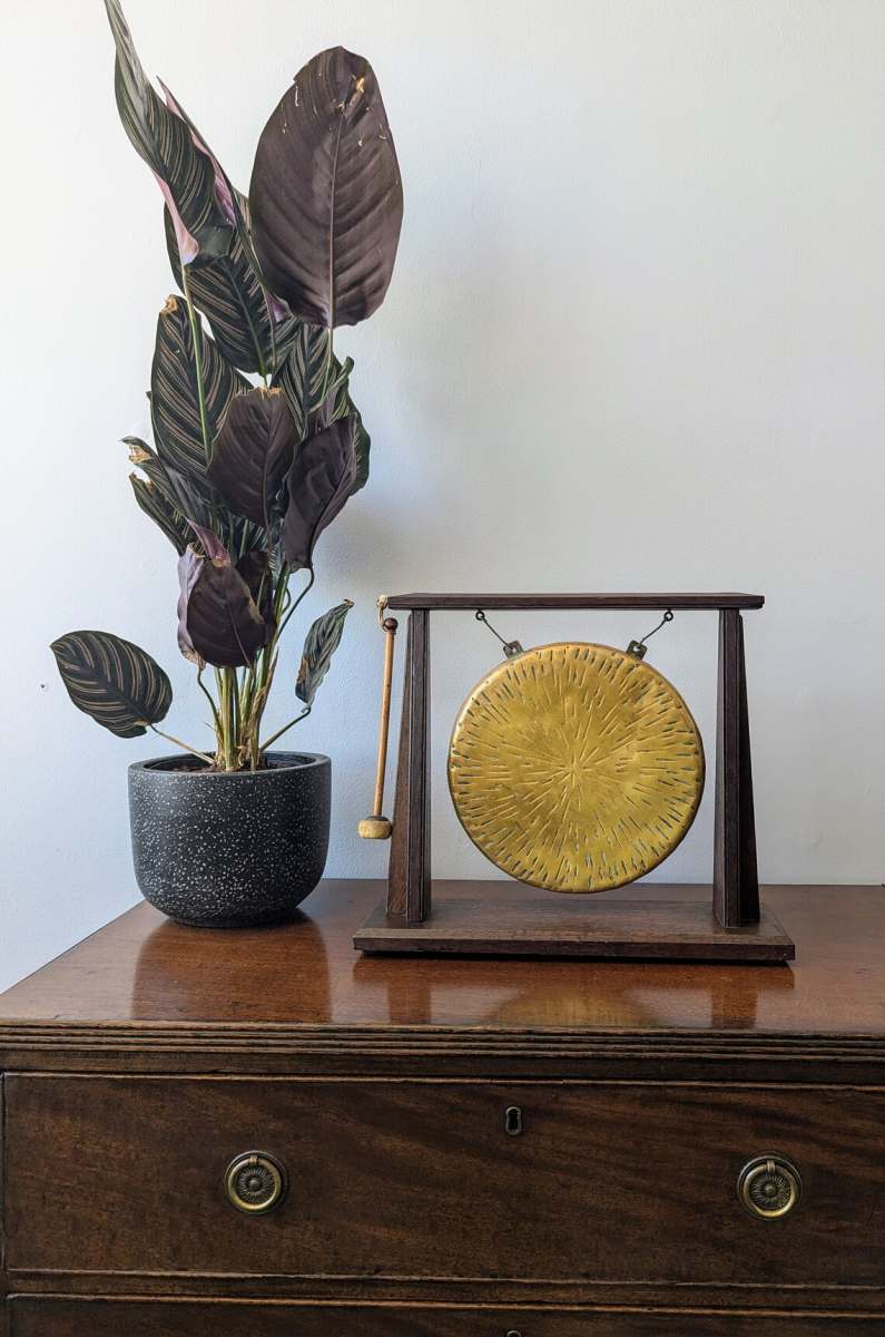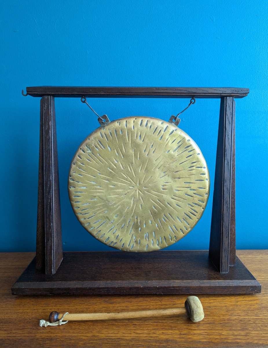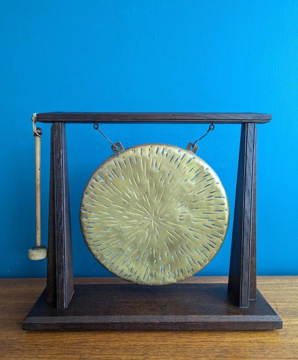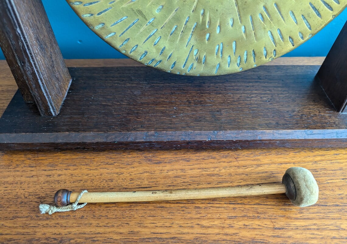 Antique 1920s brass dinner gong on oak stand with original beater