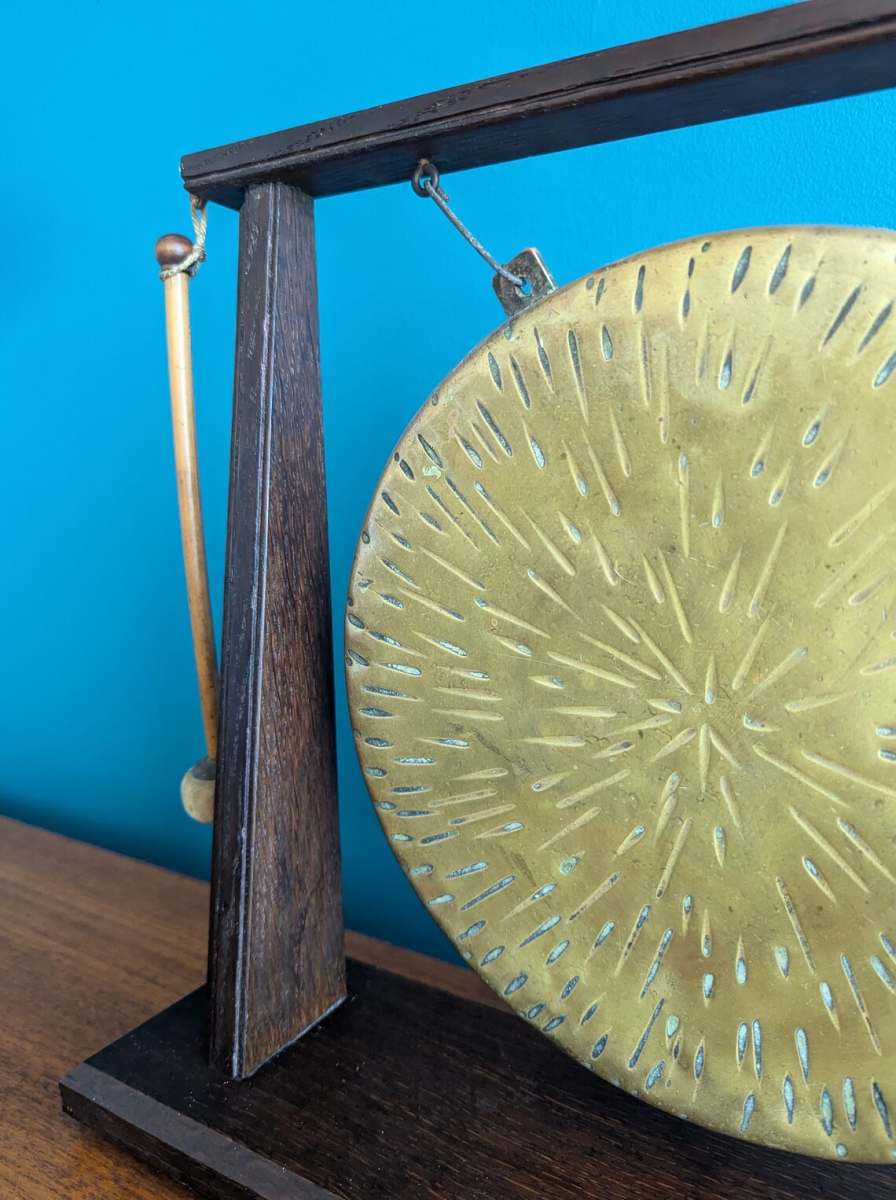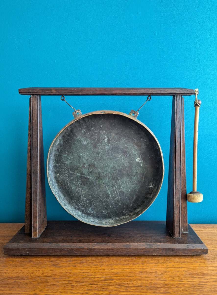 A wonderful antique brass dinner gong on solid oak Art Deco form frame, complete with original beater.