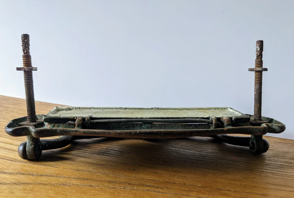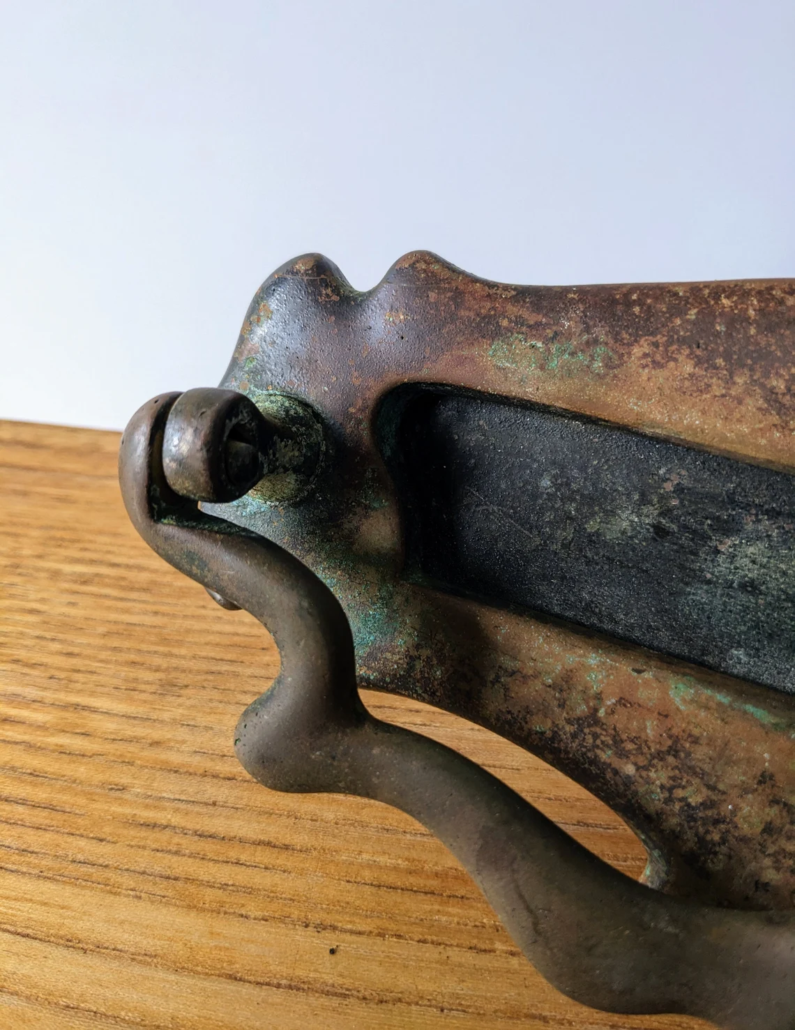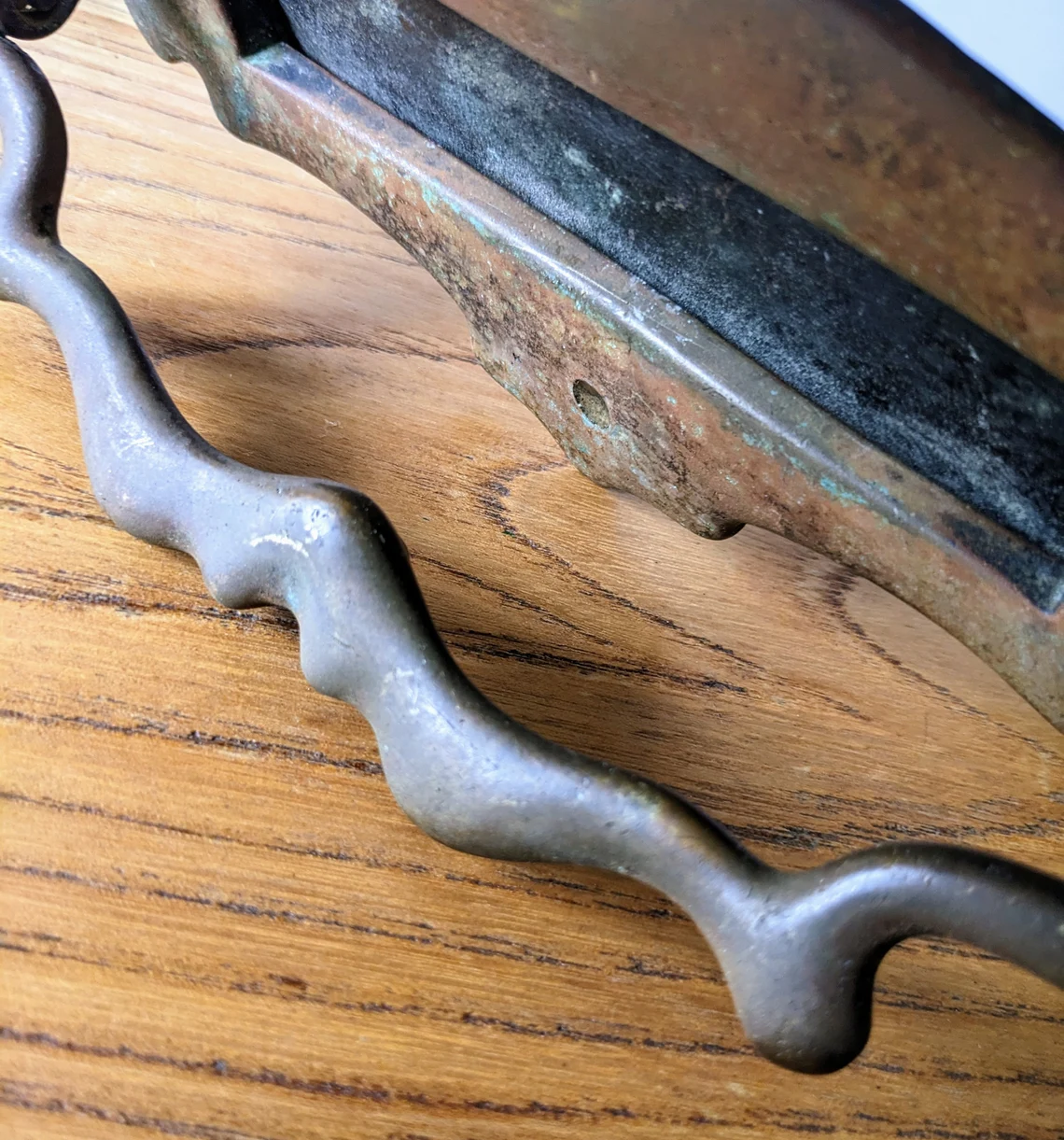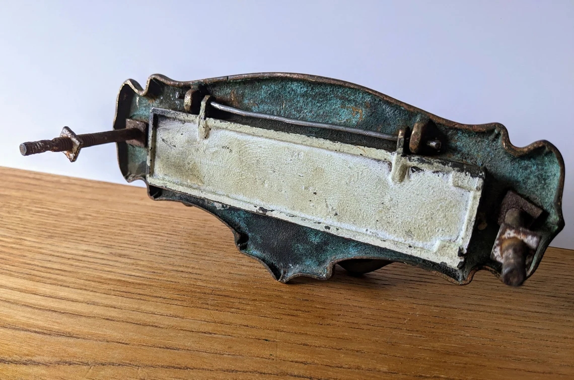 The rusted original pole on which the flap swings has been replaced with new. This is not seen when the letterbox is in situ.