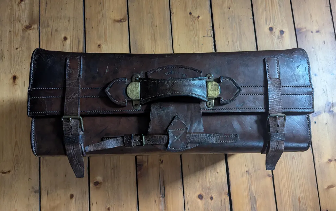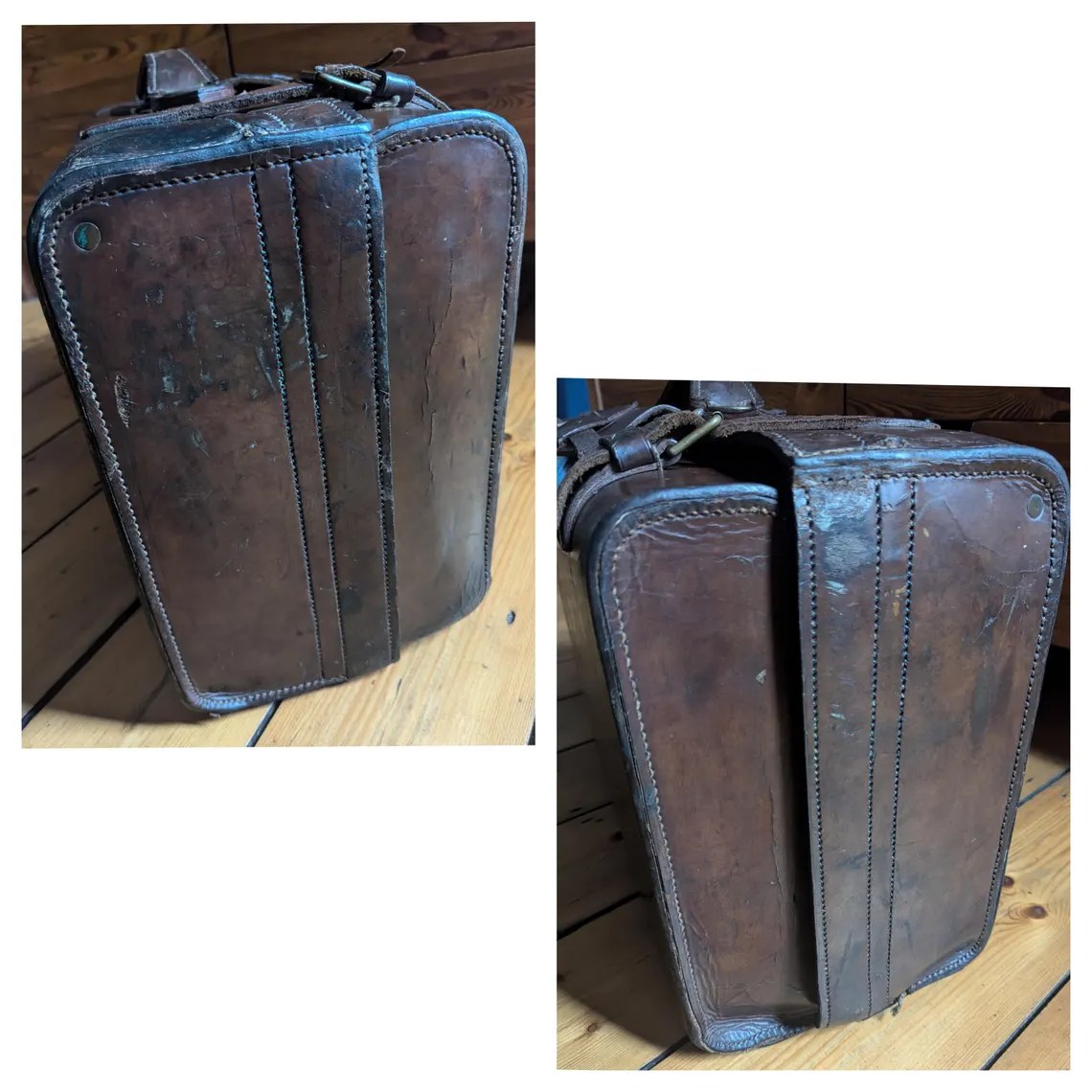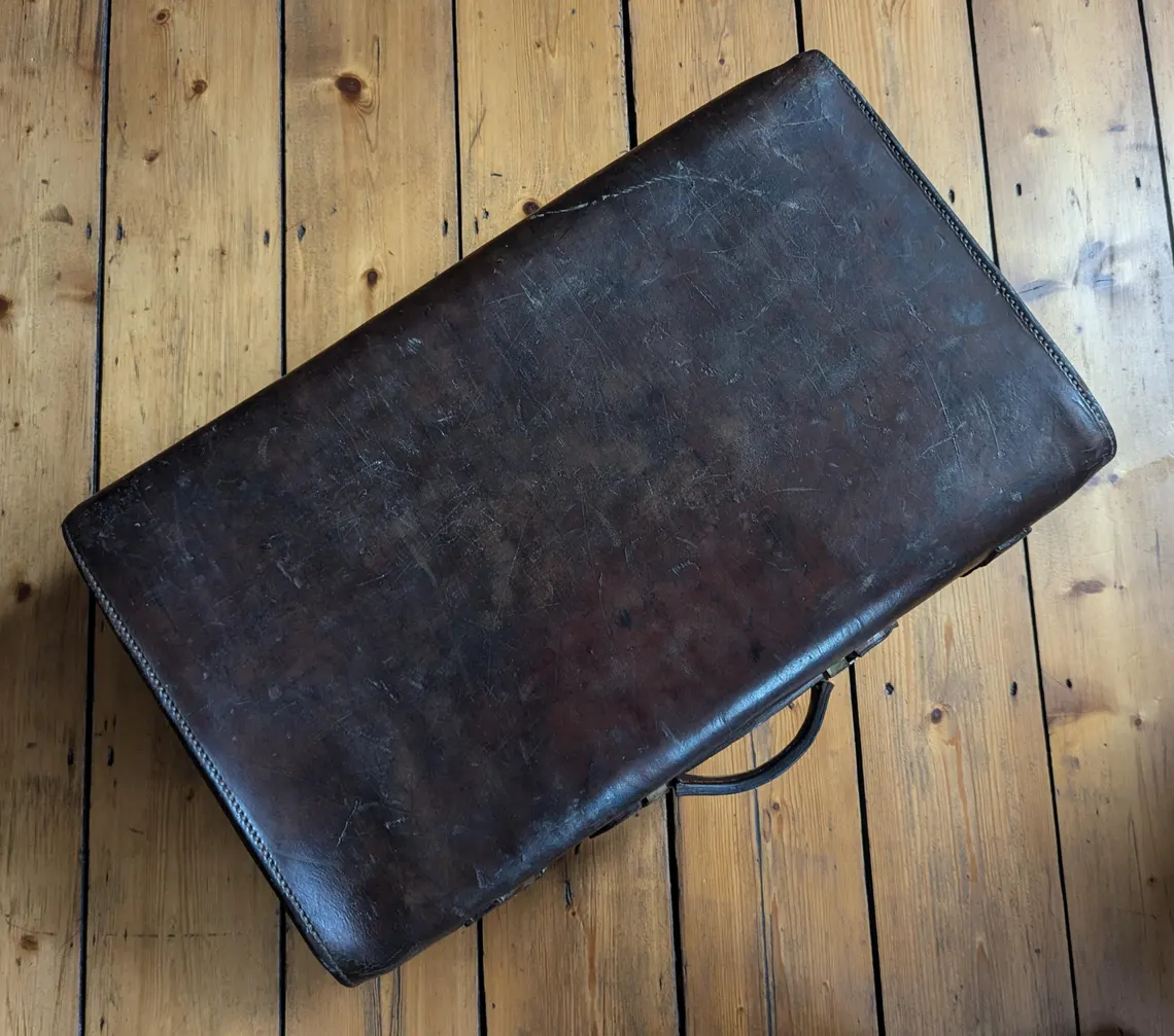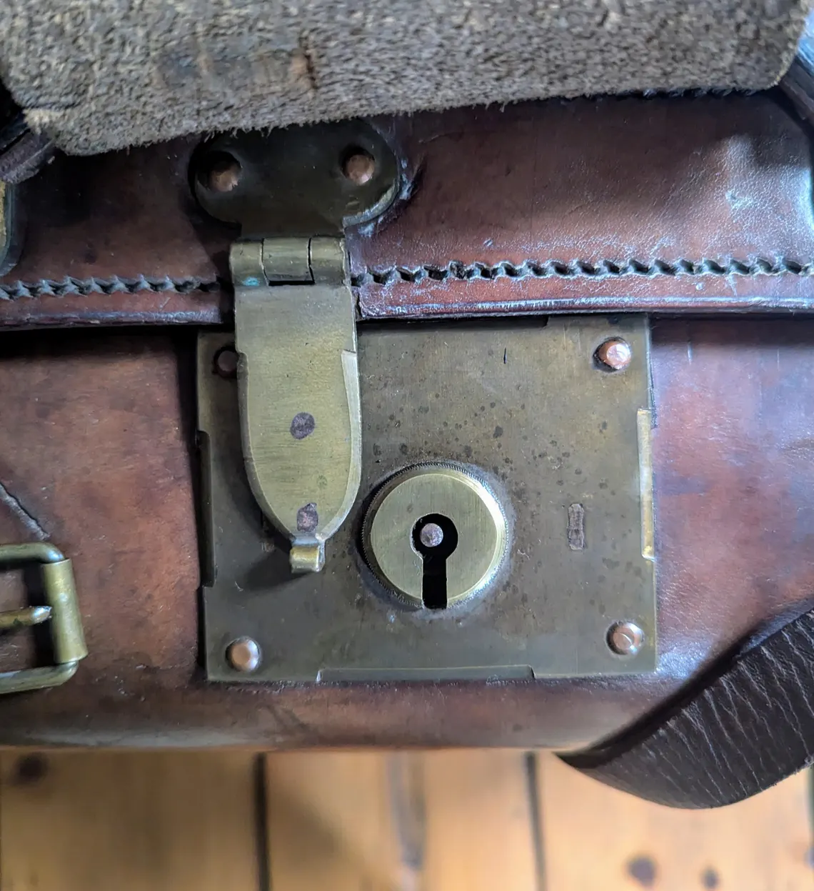 Several leather straps secure the case. The latches on vintage cases are most commonly steel or gold colour metal, but these are of a chunky strong solid brass.