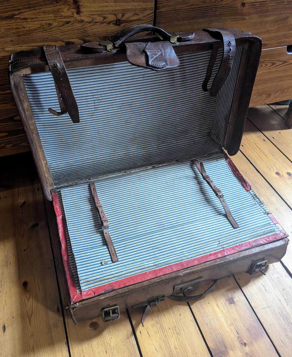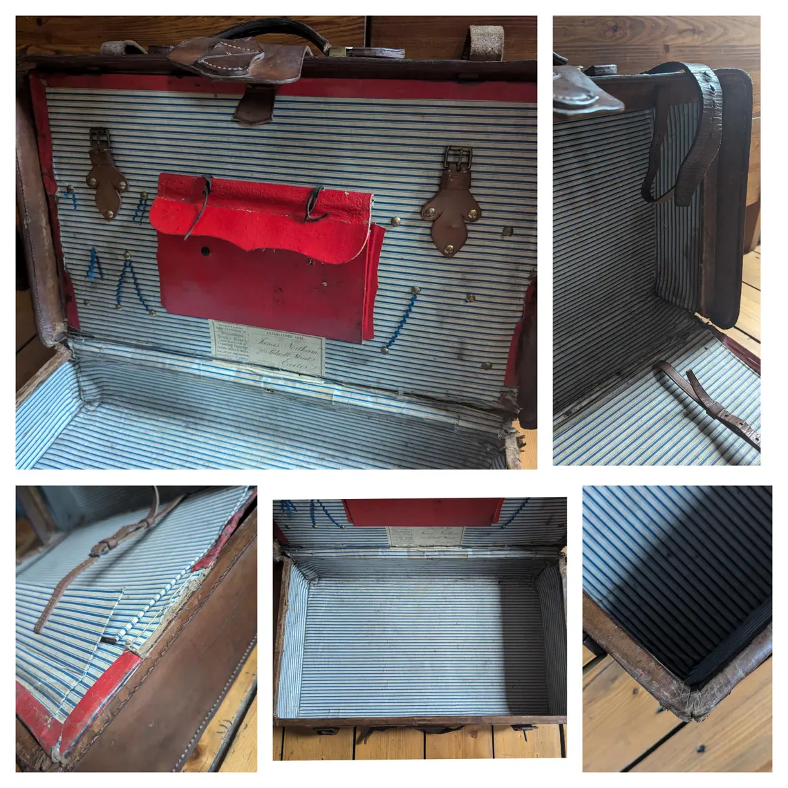 The edges of the case are strengthened with timber. The lining is a classic blue and white stripe on linen. The portmanteau case is divided into two halves by a solid panel which has a red leather pocket and blue string which has come apart.