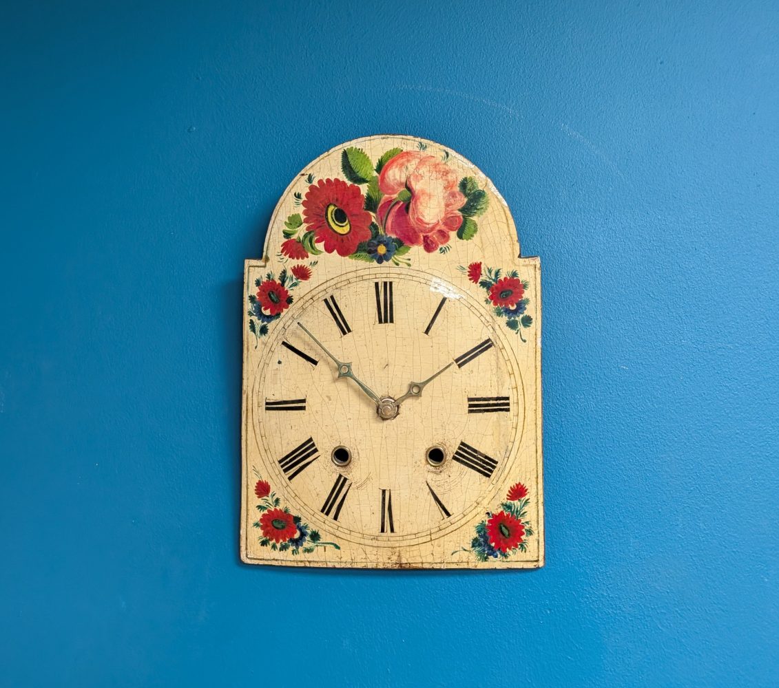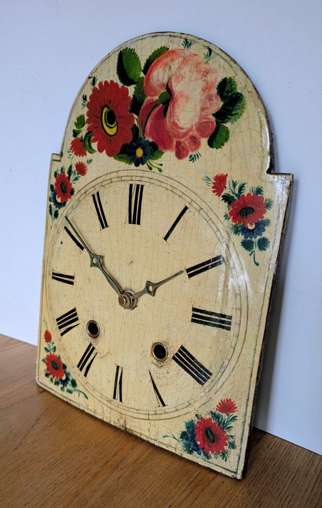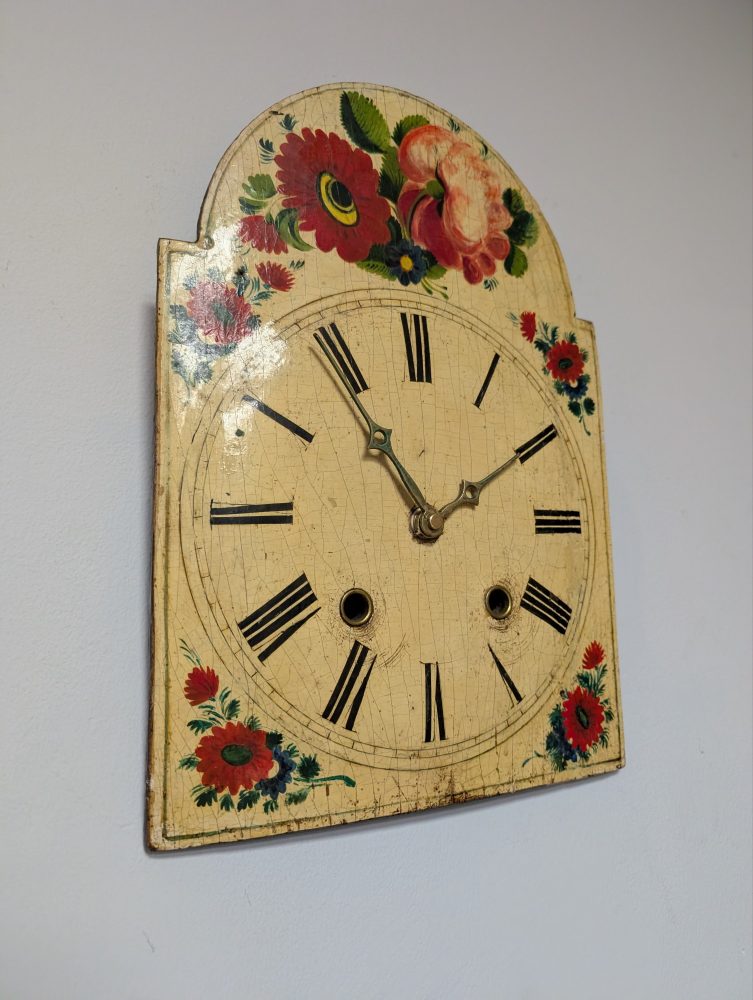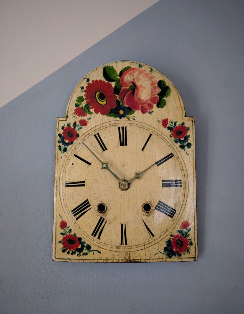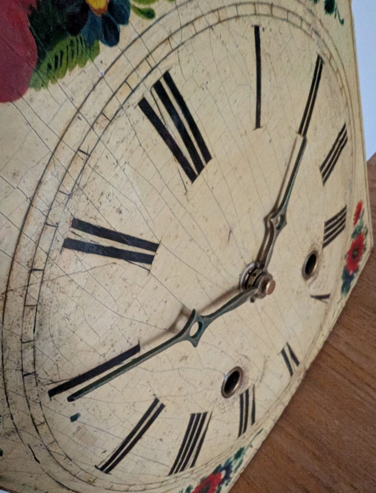 The clock, made some time around the late 19th – early 20th centuries had its original movement with wooden moving parts believe it or not, which according to my professional clock restorer was sadly well beyond saving, but he has managed to keep the hands in place with a brand new battery powered movement behind, so it keeps all its original beautiful looks, but needs no winding and runs silently.