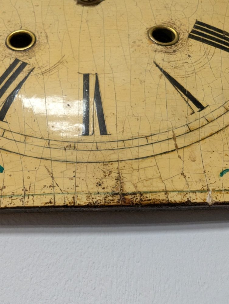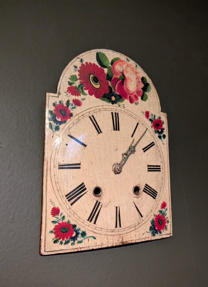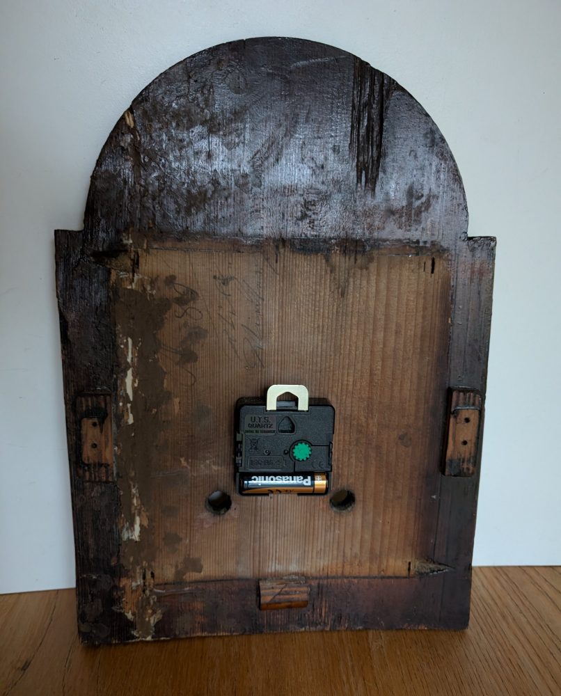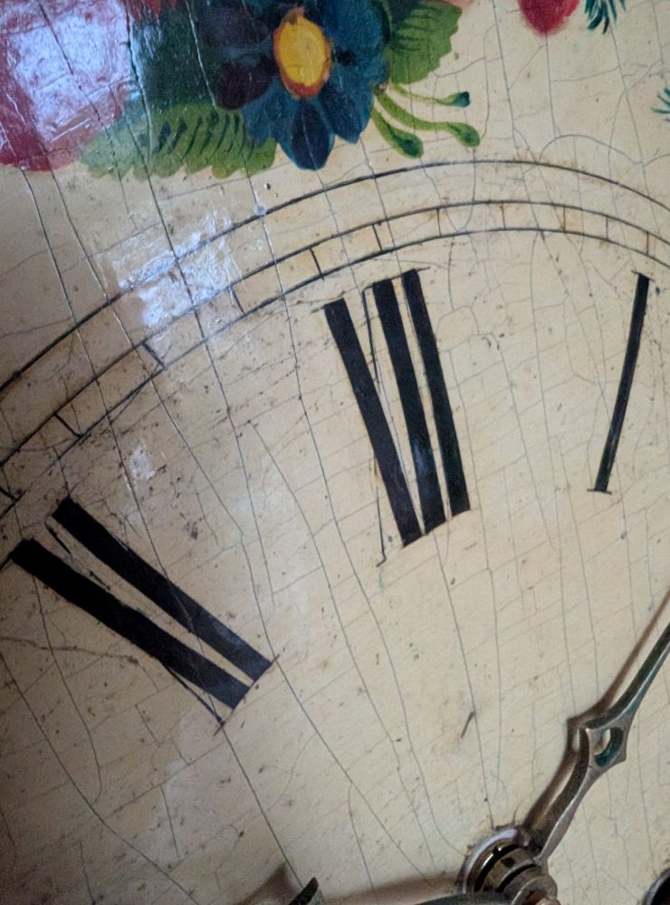 The clock, made some time around the late 19th – early 20th centuries had its original movement with wooden moving parts believe it or not, which according to my professional clock restorer was sadly well beyond saving, but he has managed to keep the hands in place with a brand new battery powered movement behind, so it keeps all its original beautiful looks, but needs no winding and runs silently.