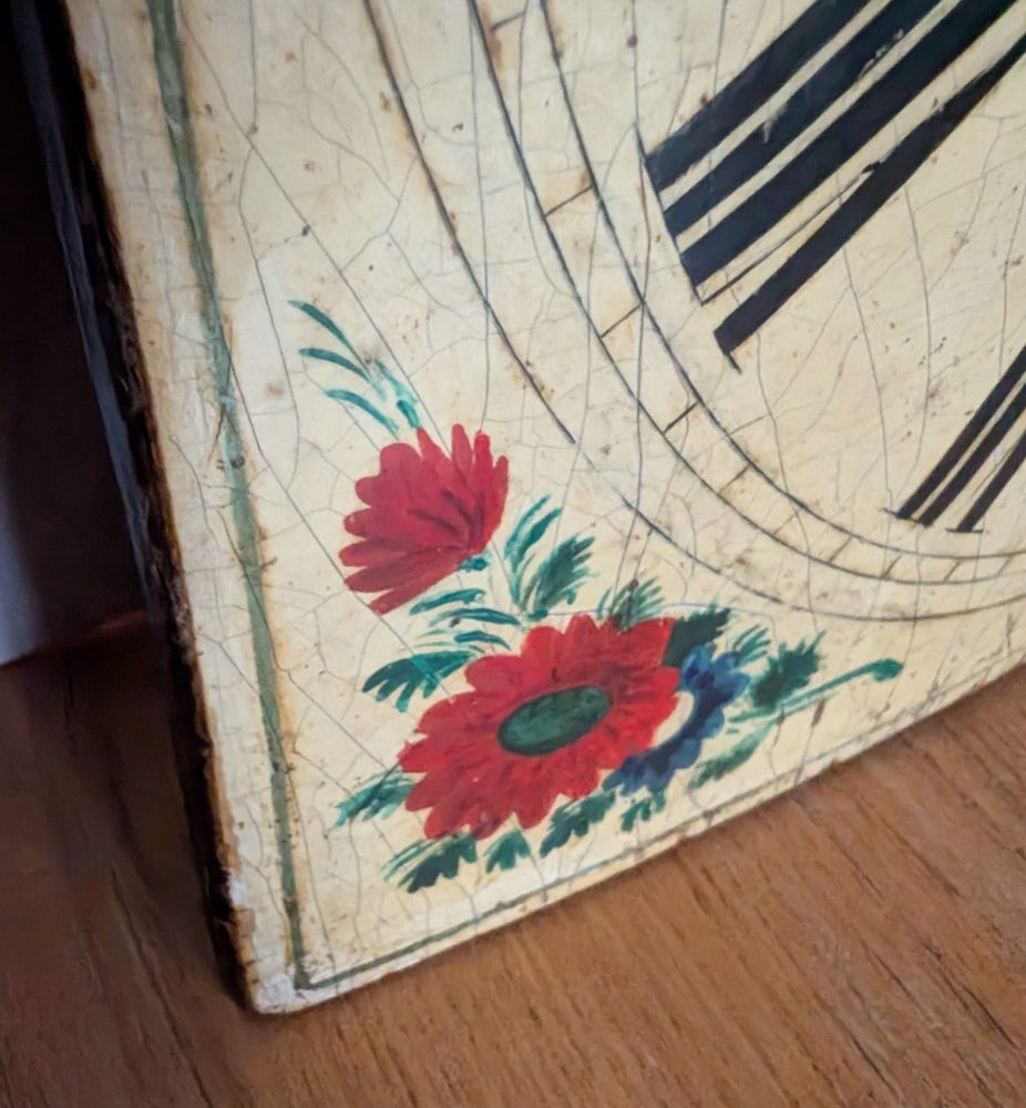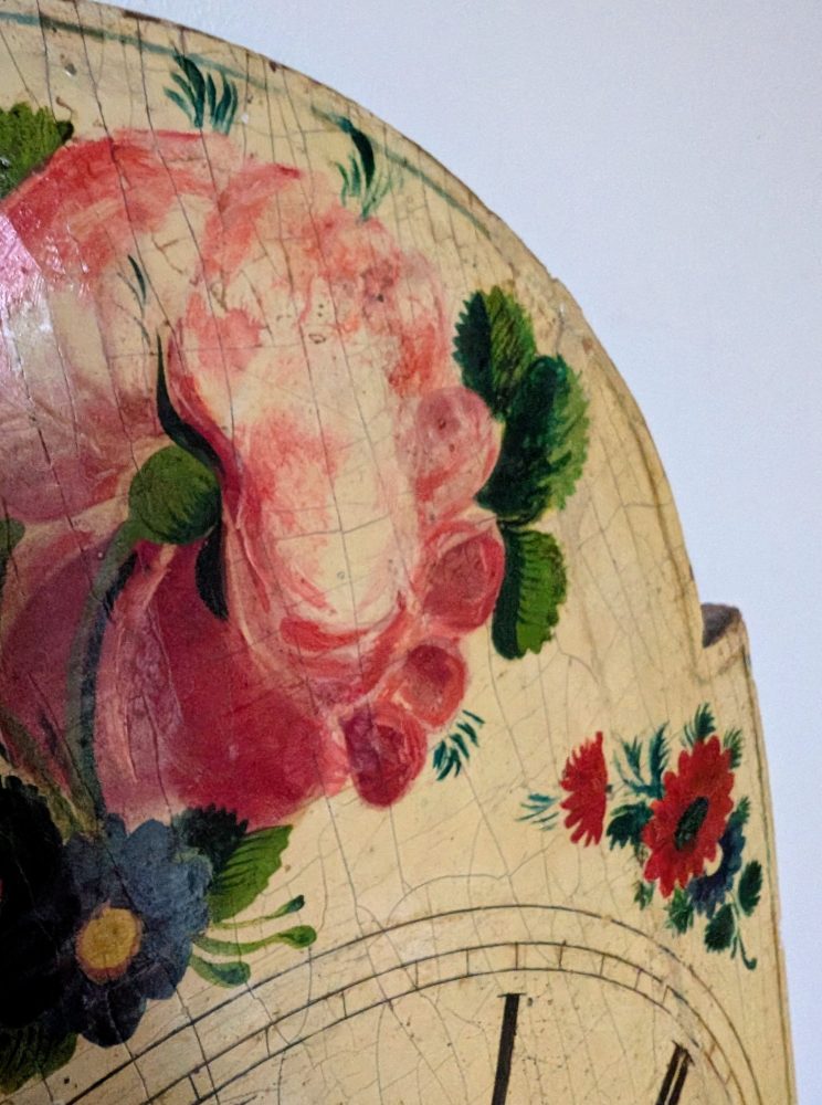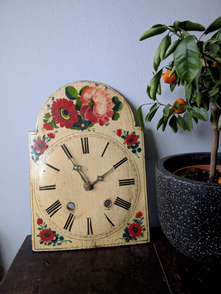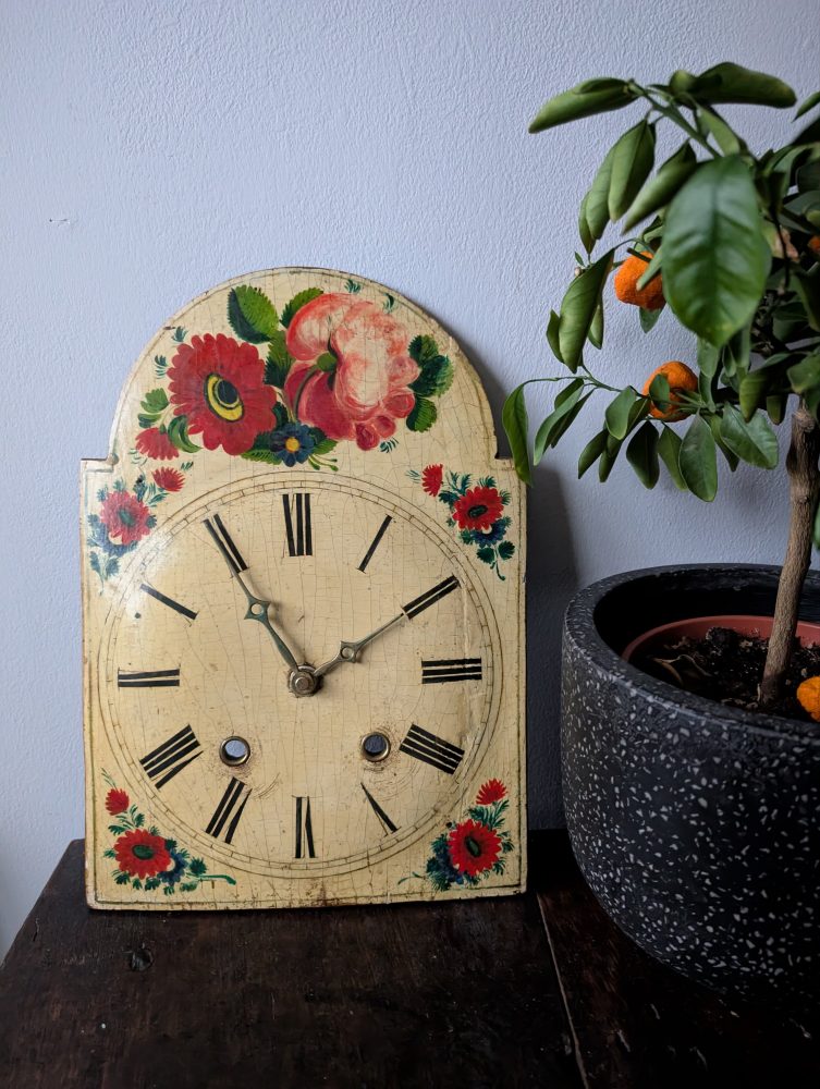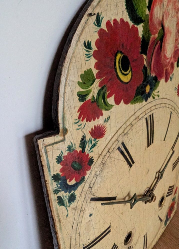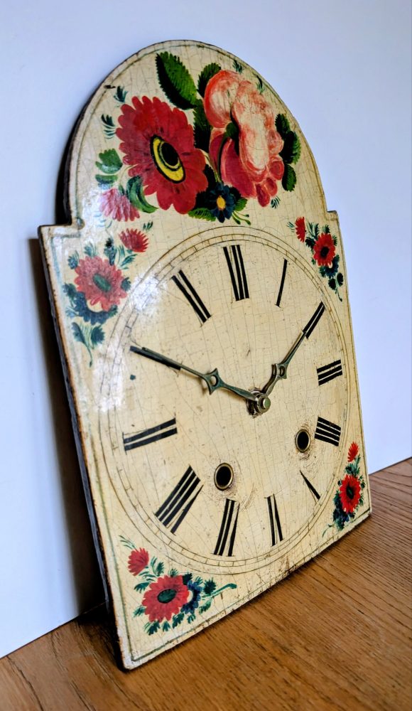 A beautiful antique French Turret clock face, handpainted with flowers and Roman numerals.
