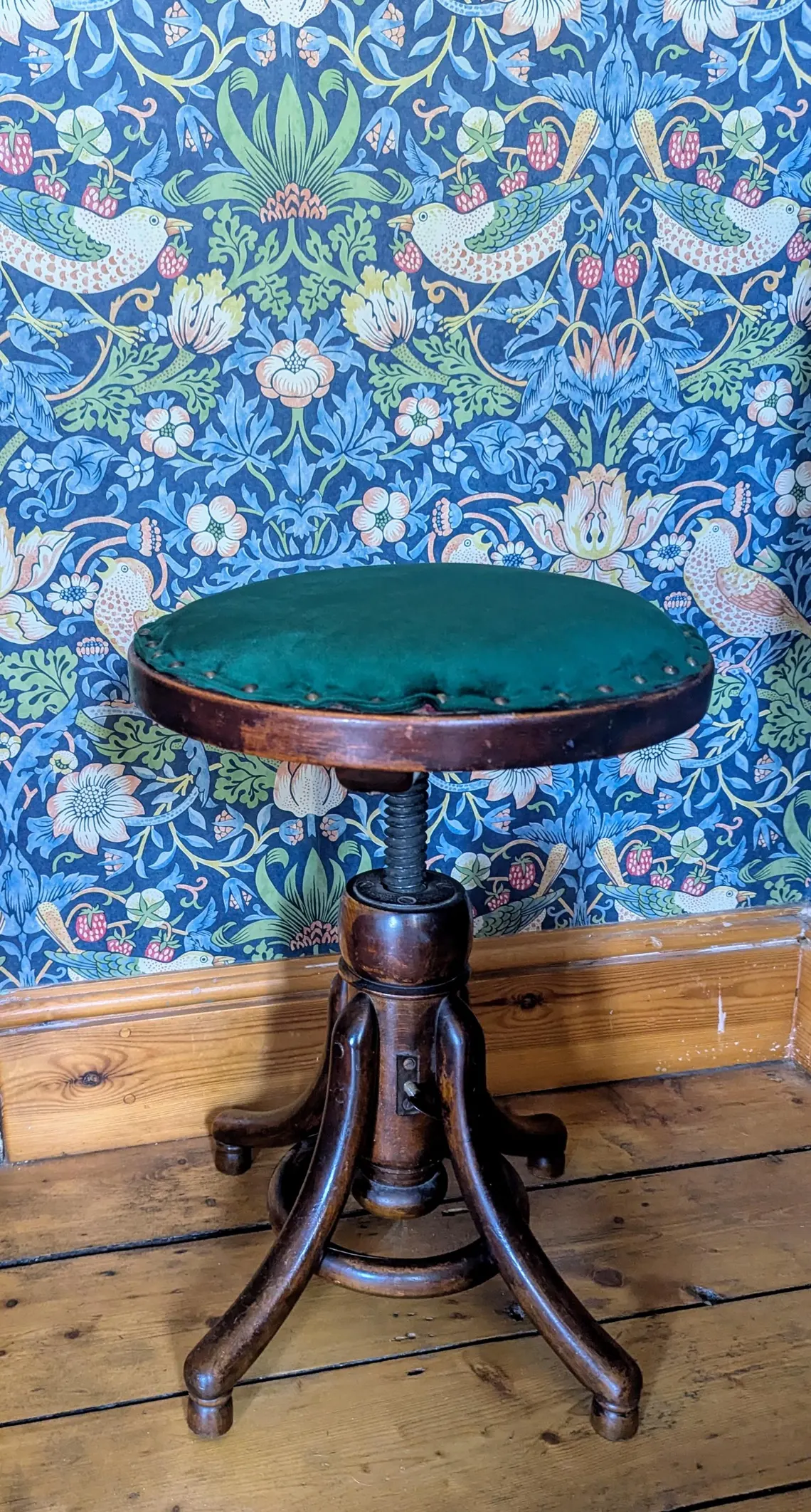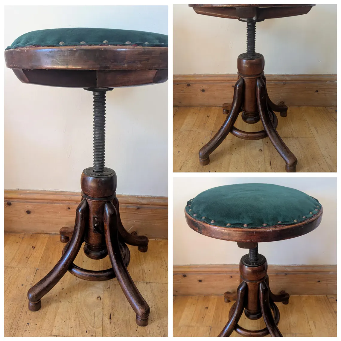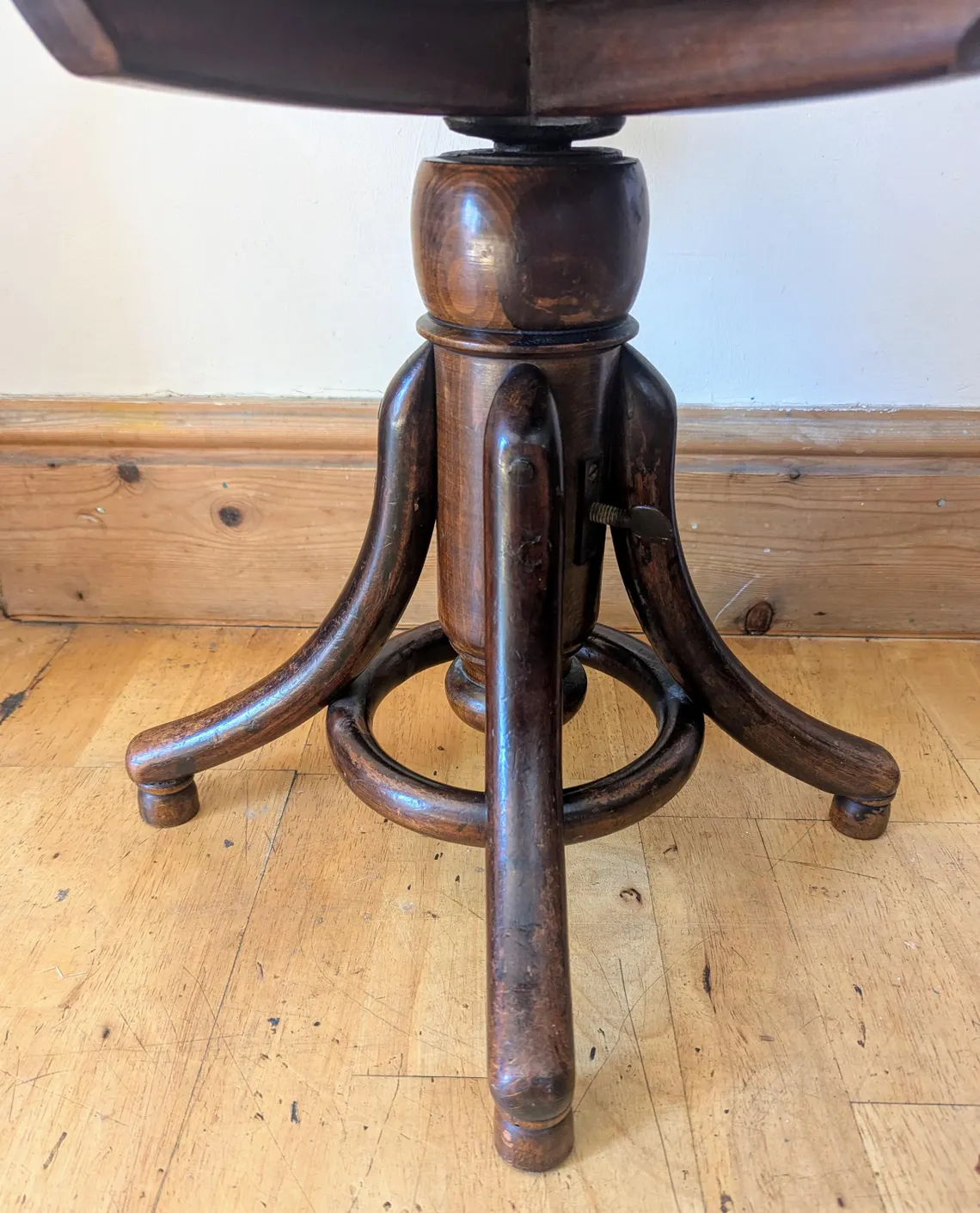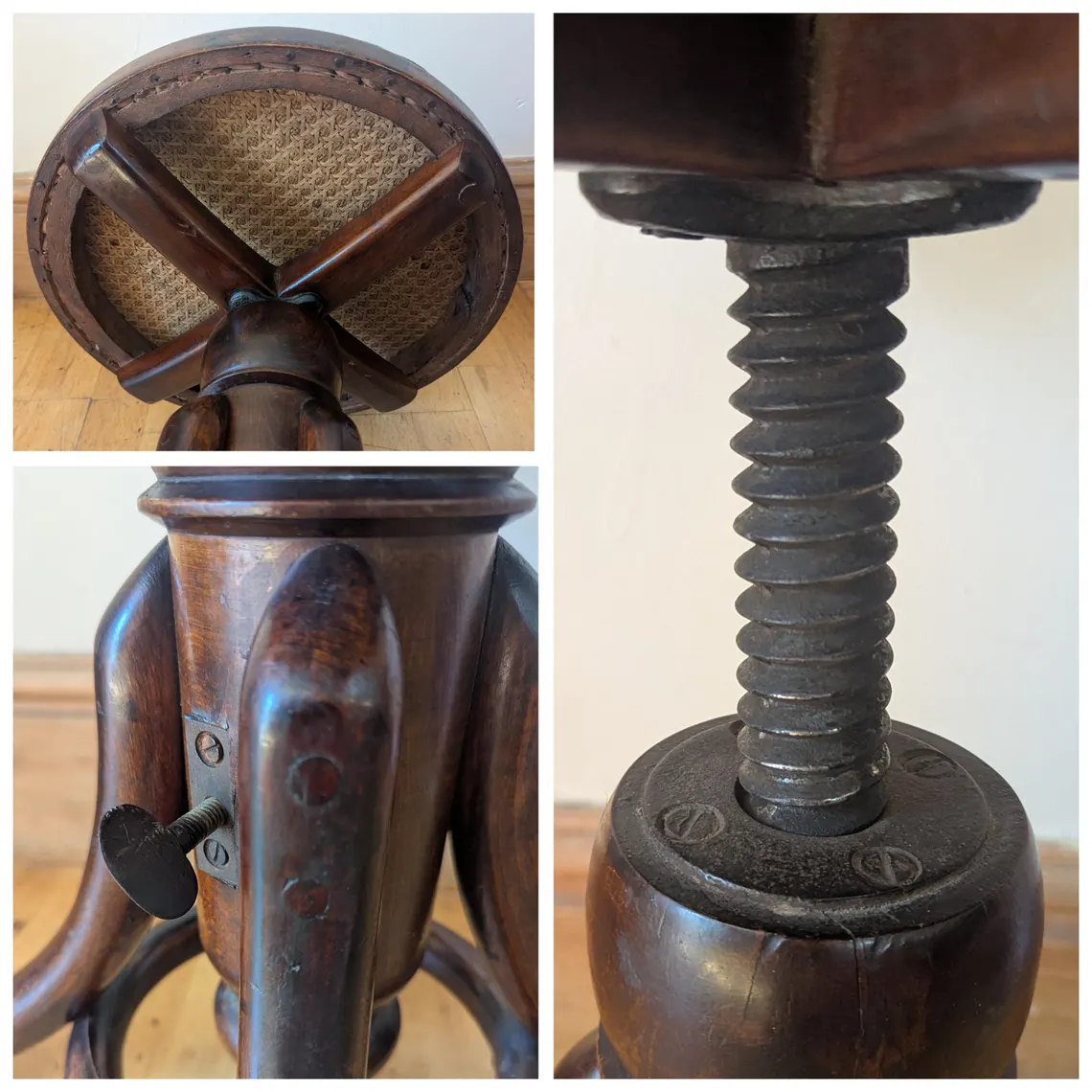 With stylish rounded bentwood legs and a threaded iron central support, which when the seat is rotated clockwise will take the seat as far as it can go, with an approximate 42cm in height, and rotated fully the other way out will go as high as approximately 62cm, though with some slant and wobble. It is fully stable raised at least to 52cm in height. There is a tightening key to secure the seat in place.