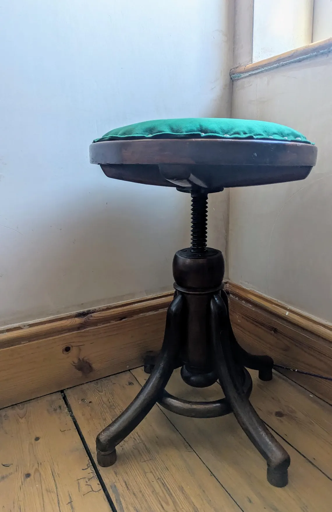 An attractive early 1900s adjustable oak stool with dark green velvet seat.