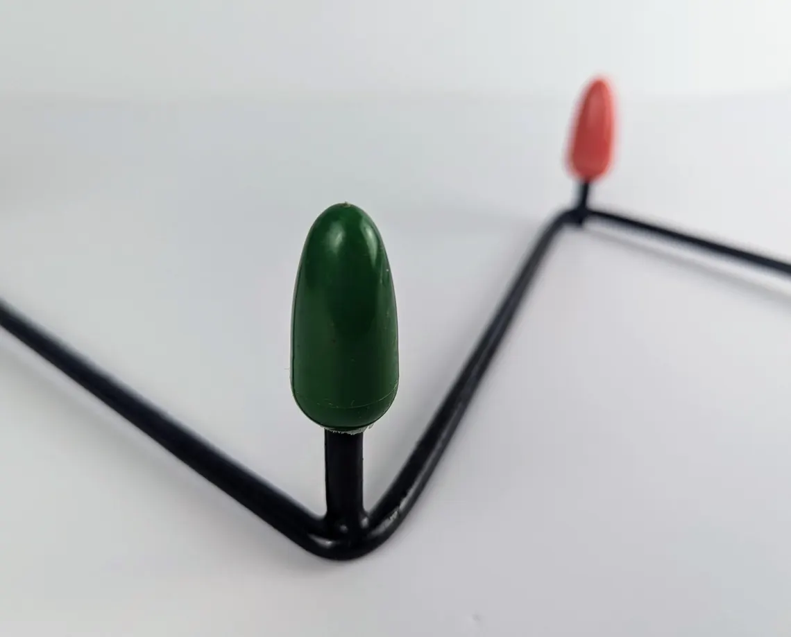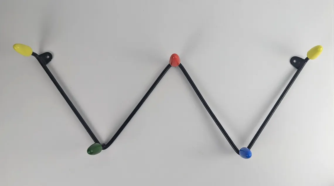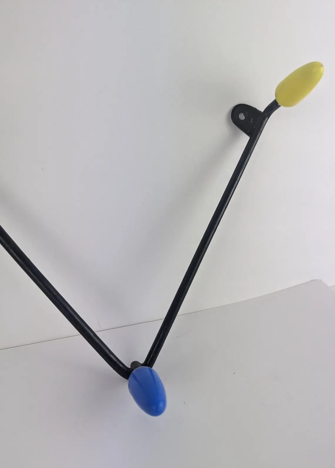 Atomic midcentury coat rack, vintage coat hooks with multicoloured pegs