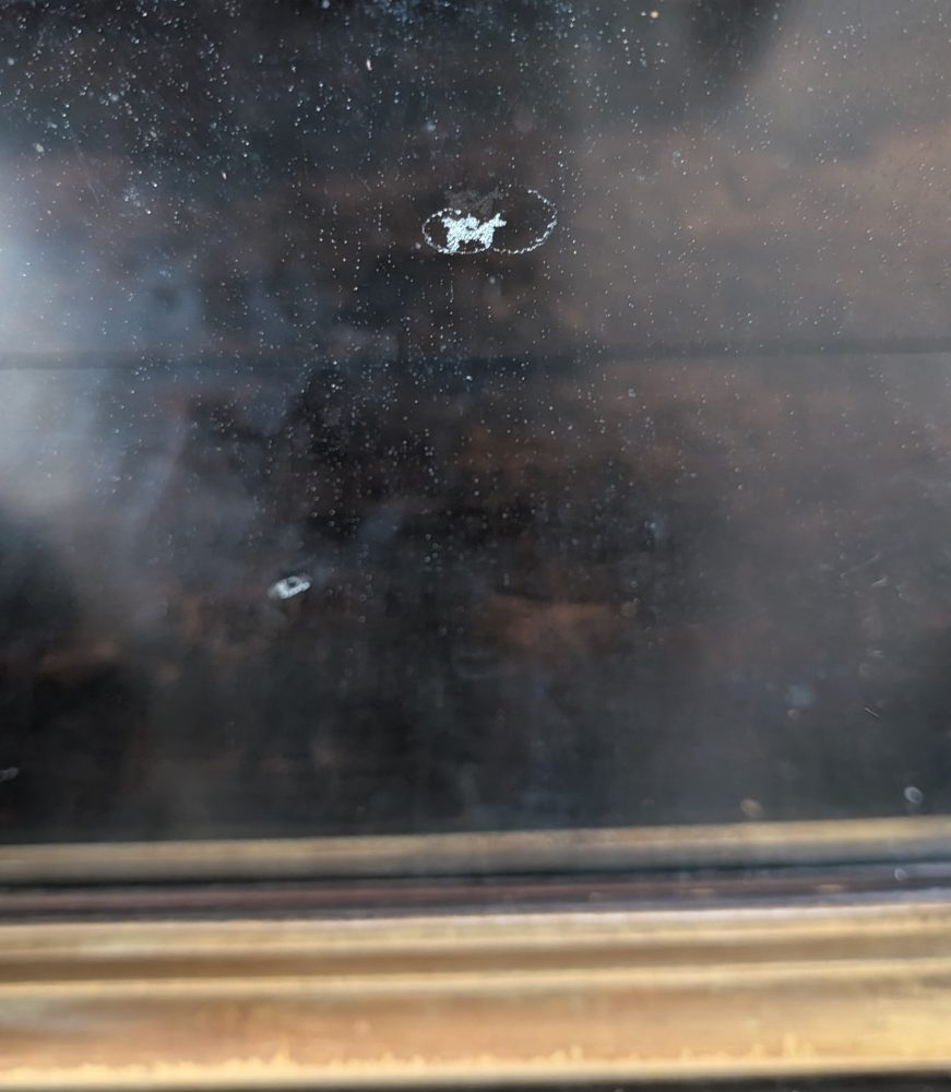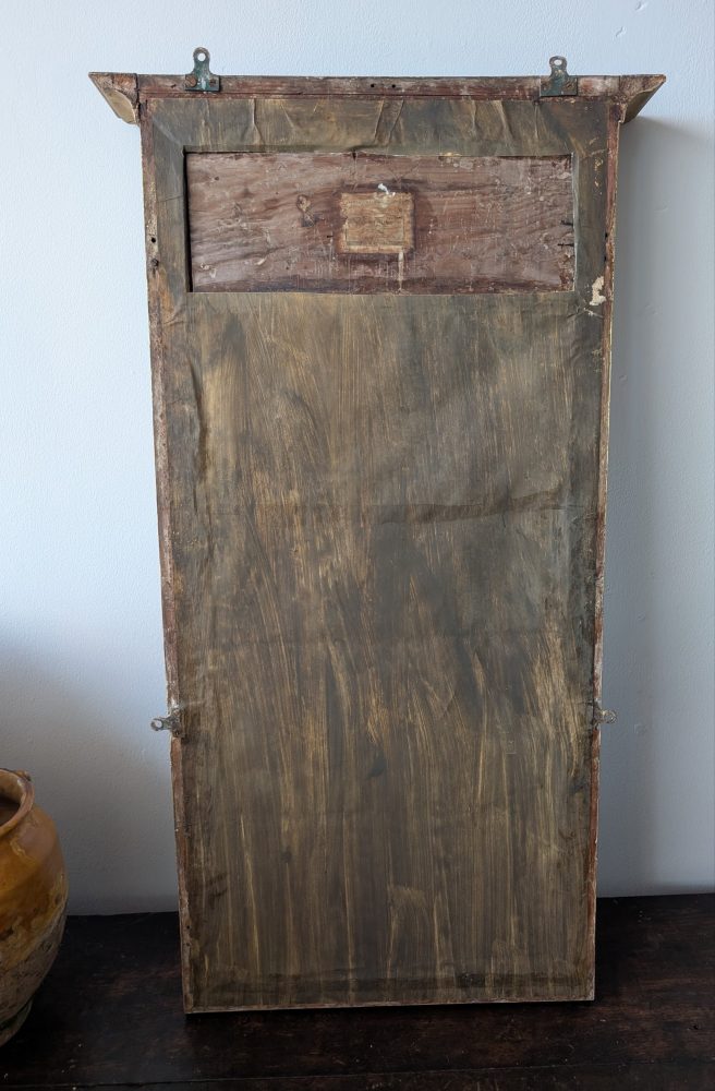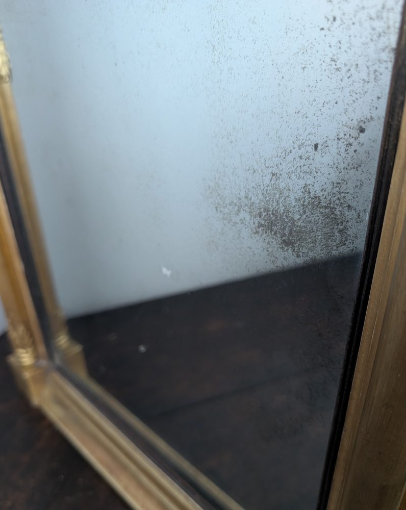 There was some rubbing to the lower horizontal and outer sides from cleaning (do not use water on gilding – use meths if cleaning is necessary) which has been professionally restored with 20 carat gold leaf. The back paper was hanging off so has been replaced. Otherwise the mirror is entirely original, the gilding with a lovely natural wear, a little darker in corners, and a little duller than the bright gold it once would have been. The faded charm giving it such understated beauty.