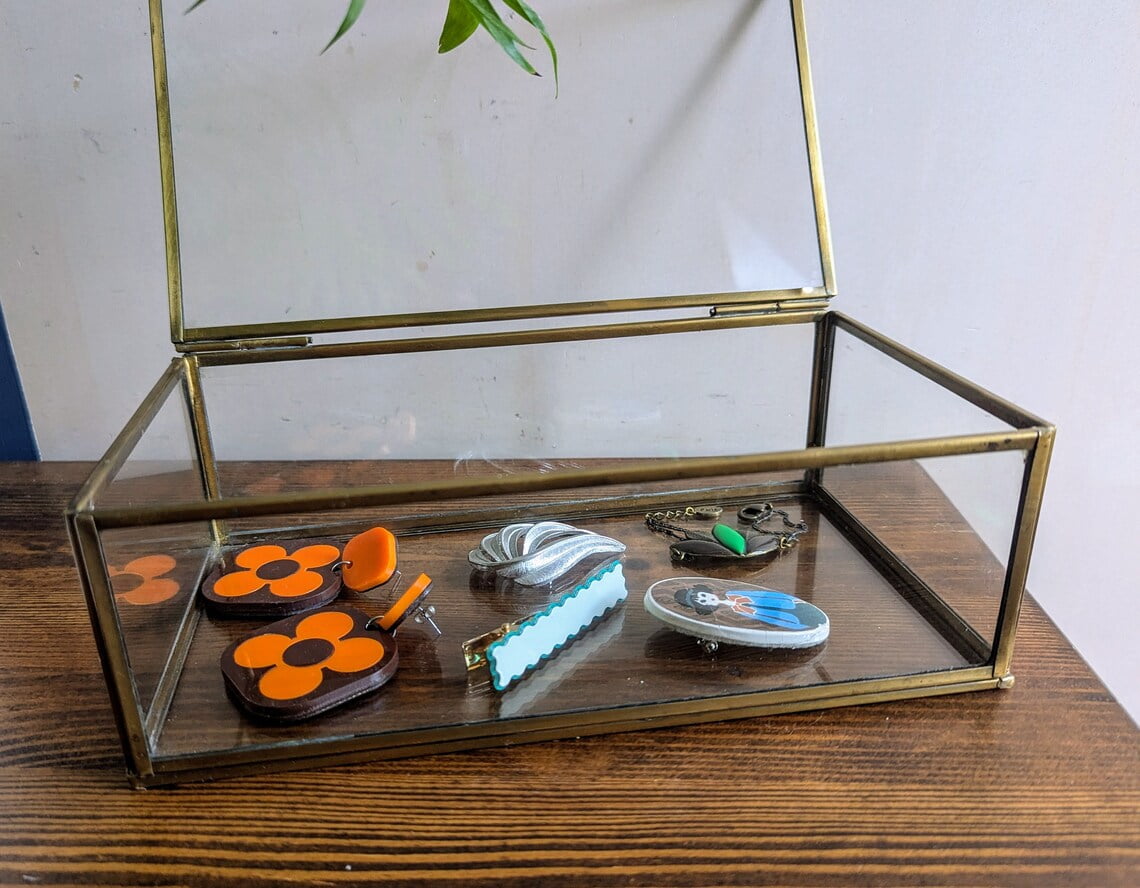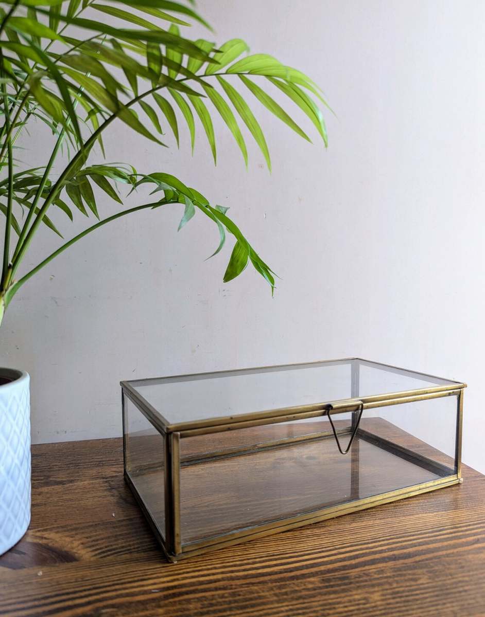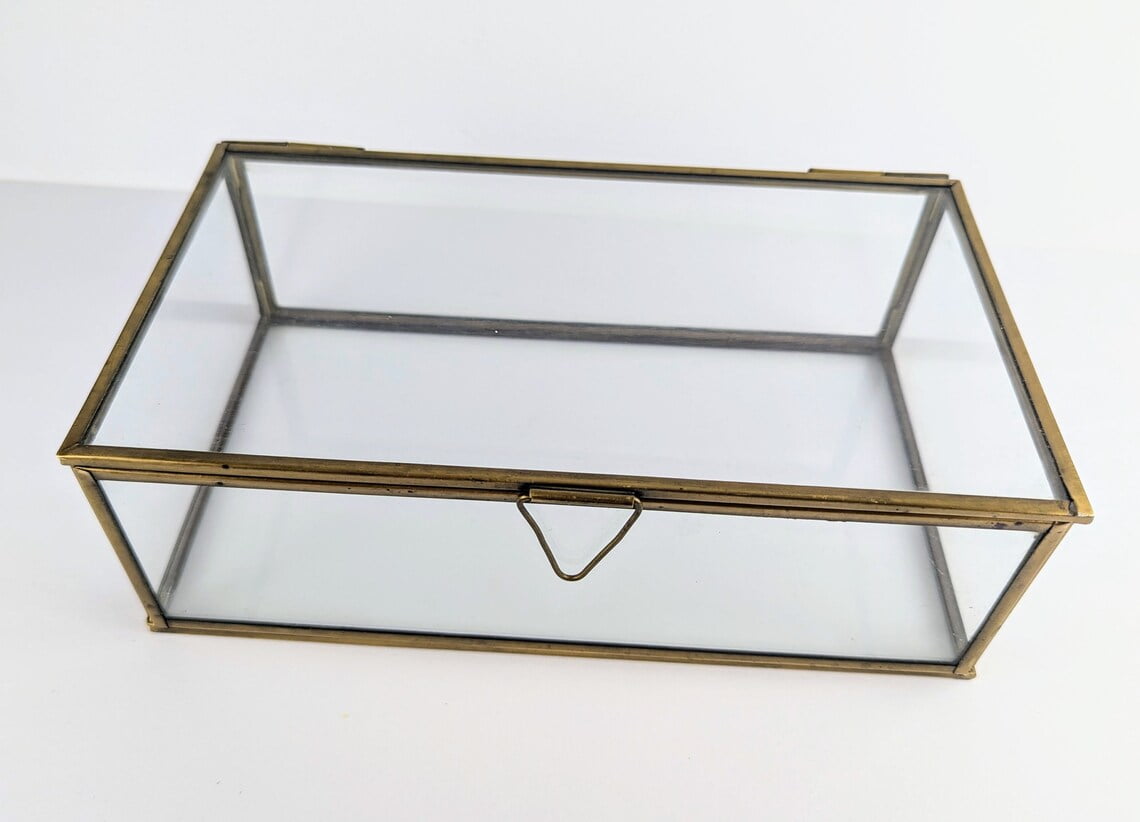 A lovely way to keep your favourite little items visible, accessible and dust free in a very attractive glass and brass display case with a hinged lid.