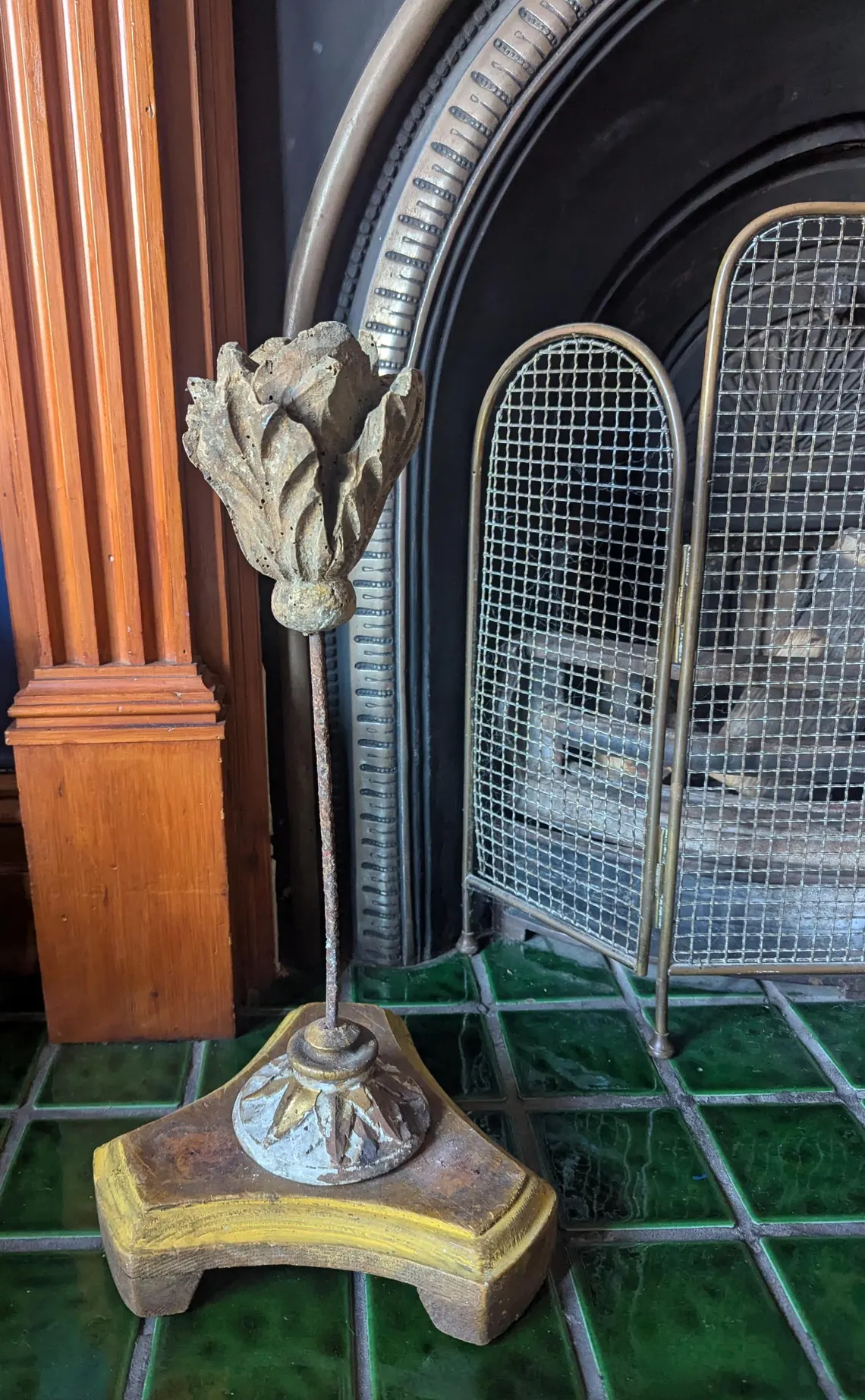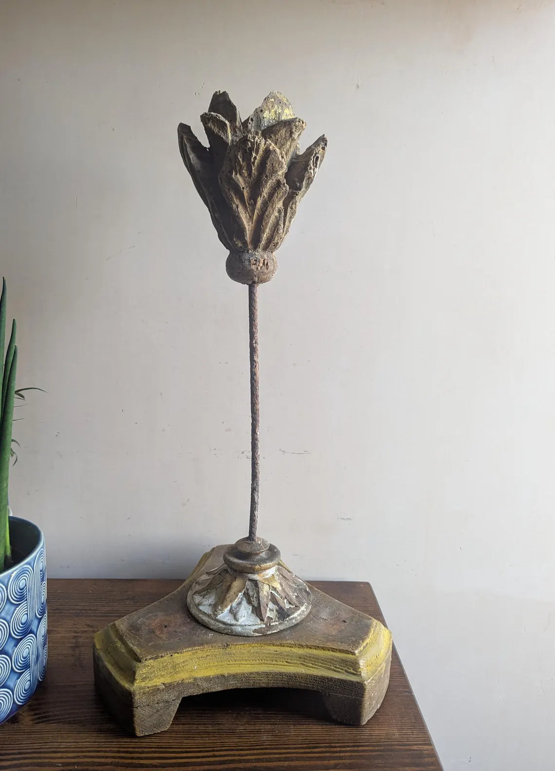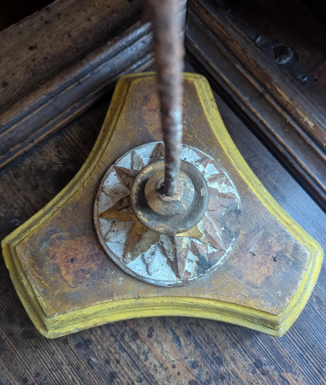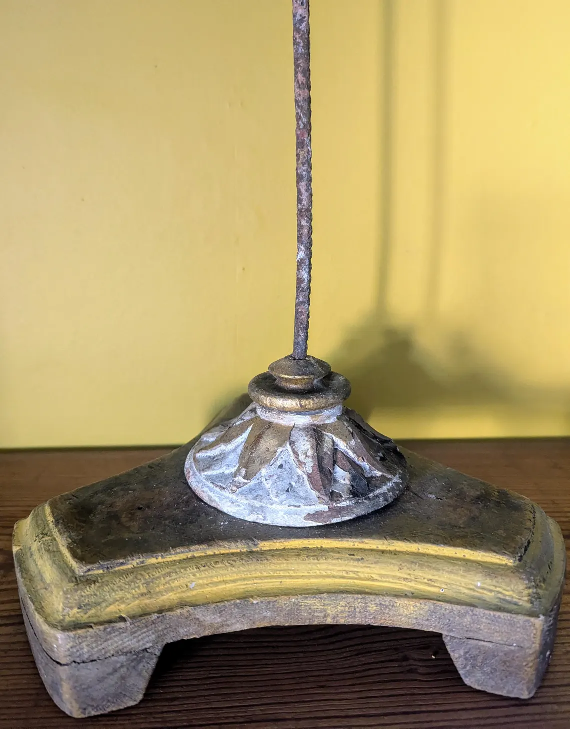 At some stage it has been mounted on a metal pole going into a triangular footed base, painted with now faded yellow, white and gold, it has a wonderful leaf design and patina.