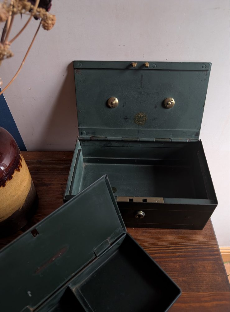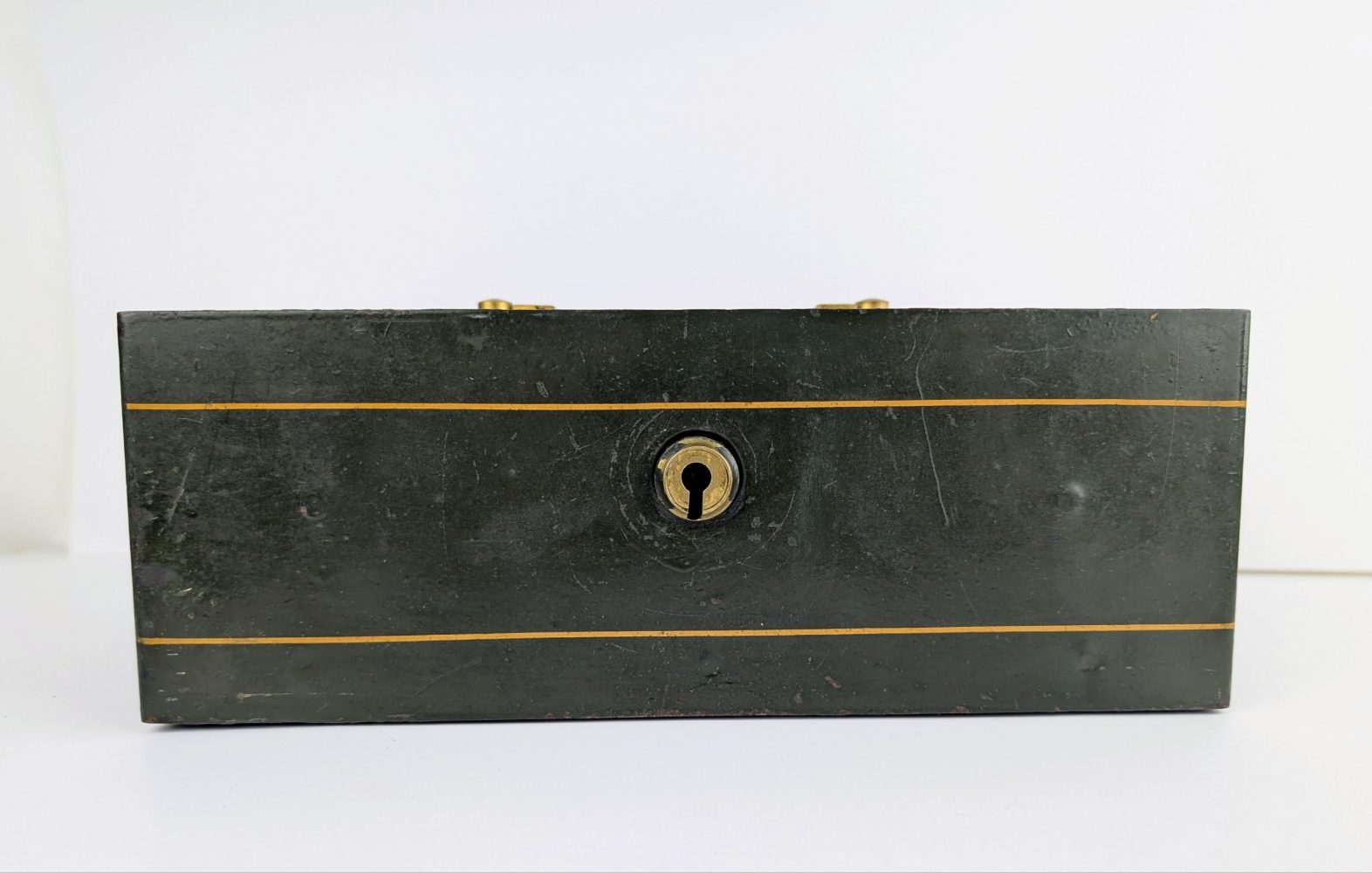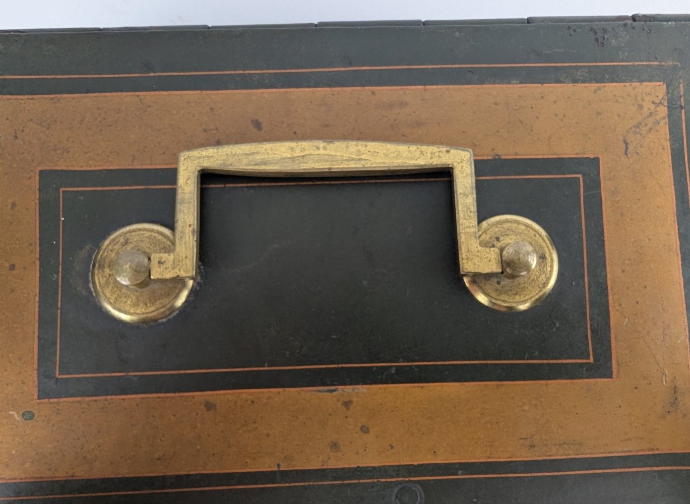 An antique, late 1800s cash tin in dark green with gilt decoration, cast brass handle and twin tray insert.