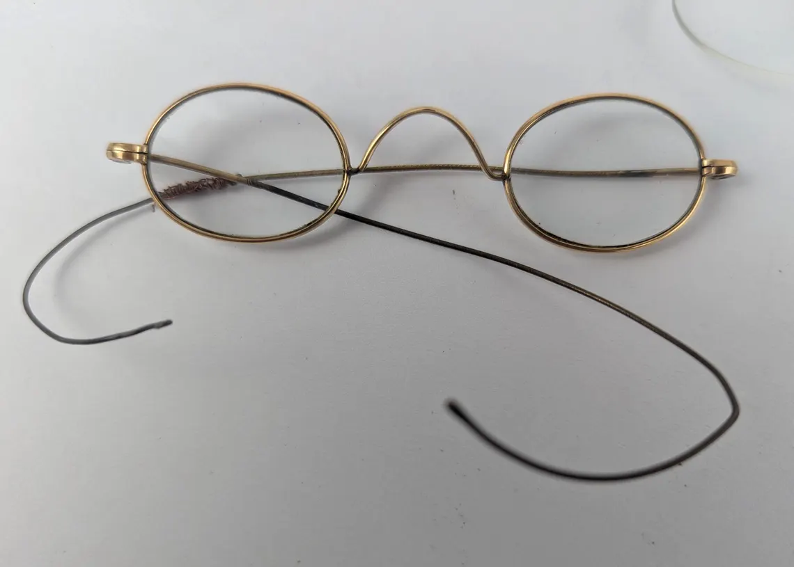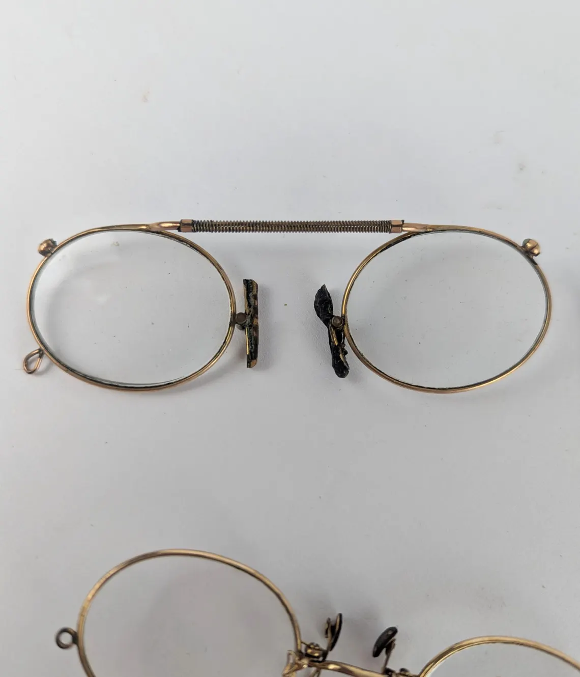 Designed to pinch onto the nose with the clips between the lenses, these came into popular use in the late 19th century and beyond.