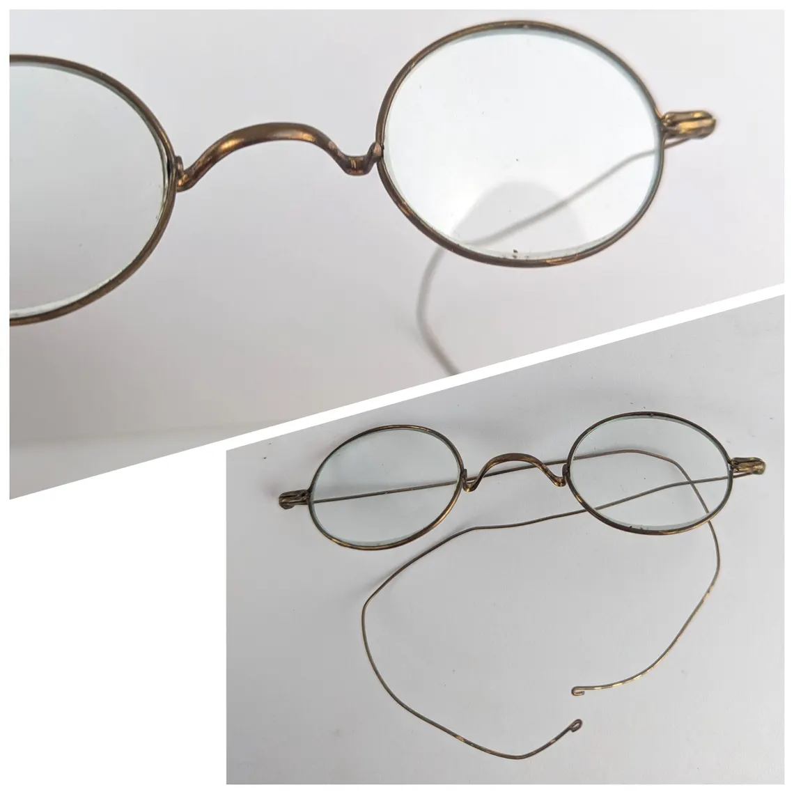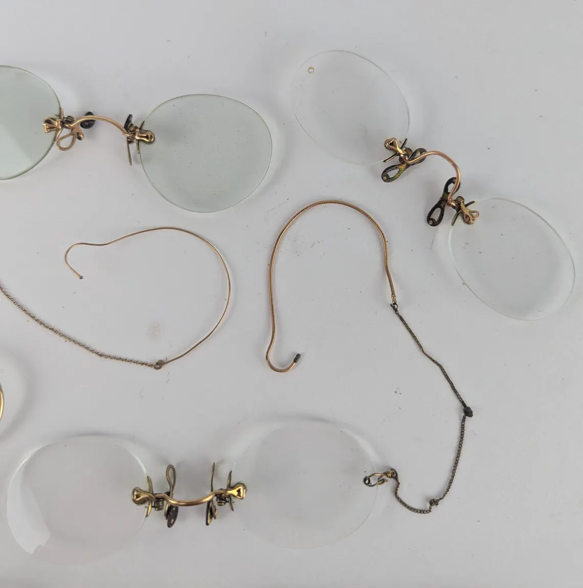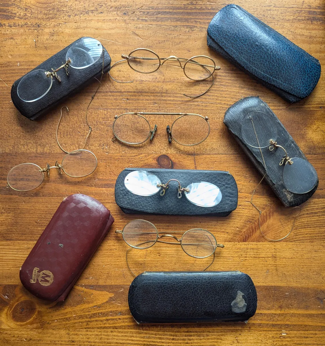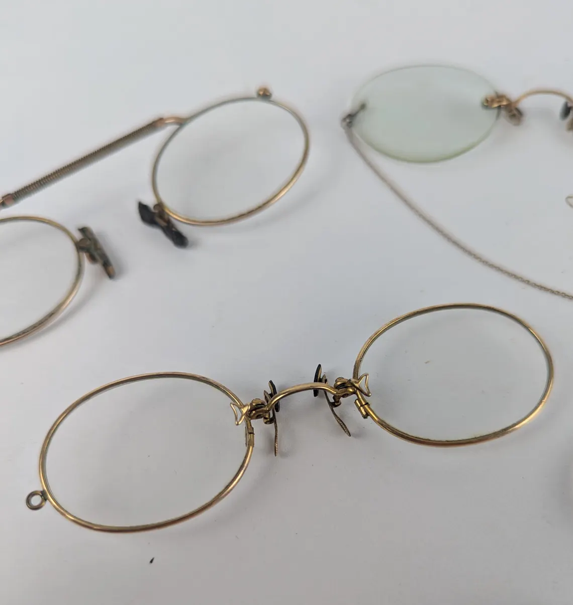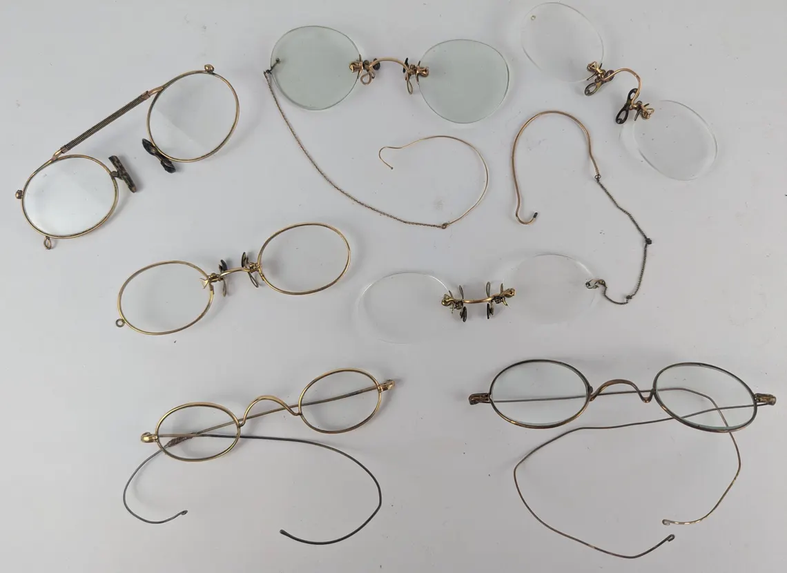 A collection of 7 pairs of antique spectacles with hook over arms, and pince nez.