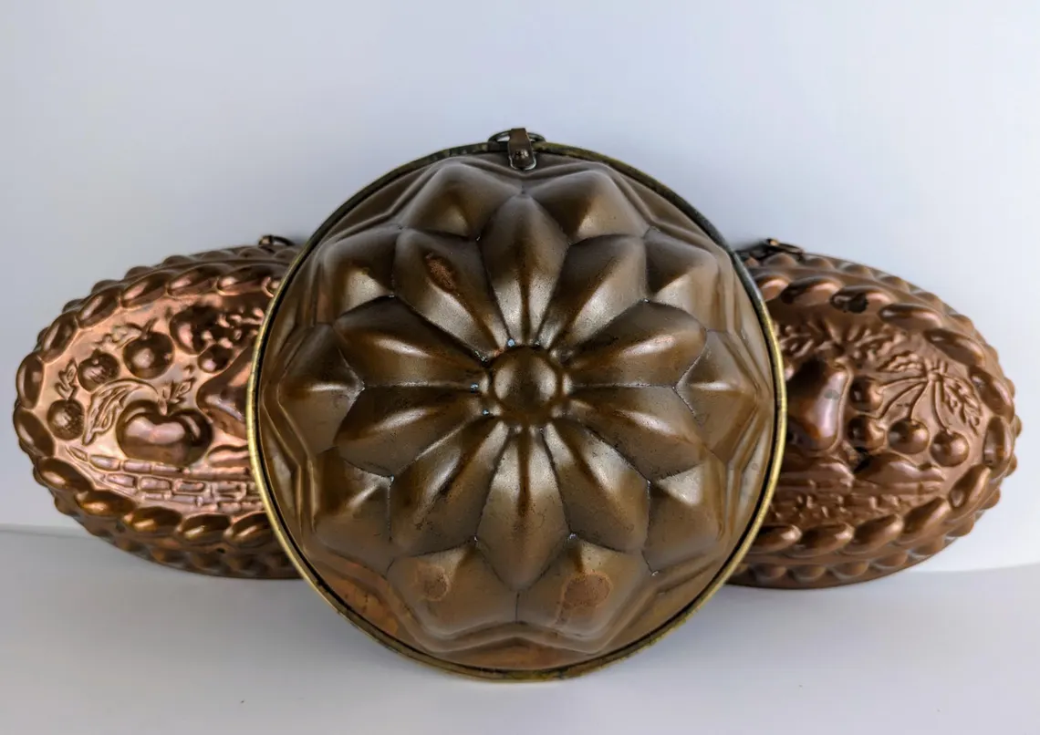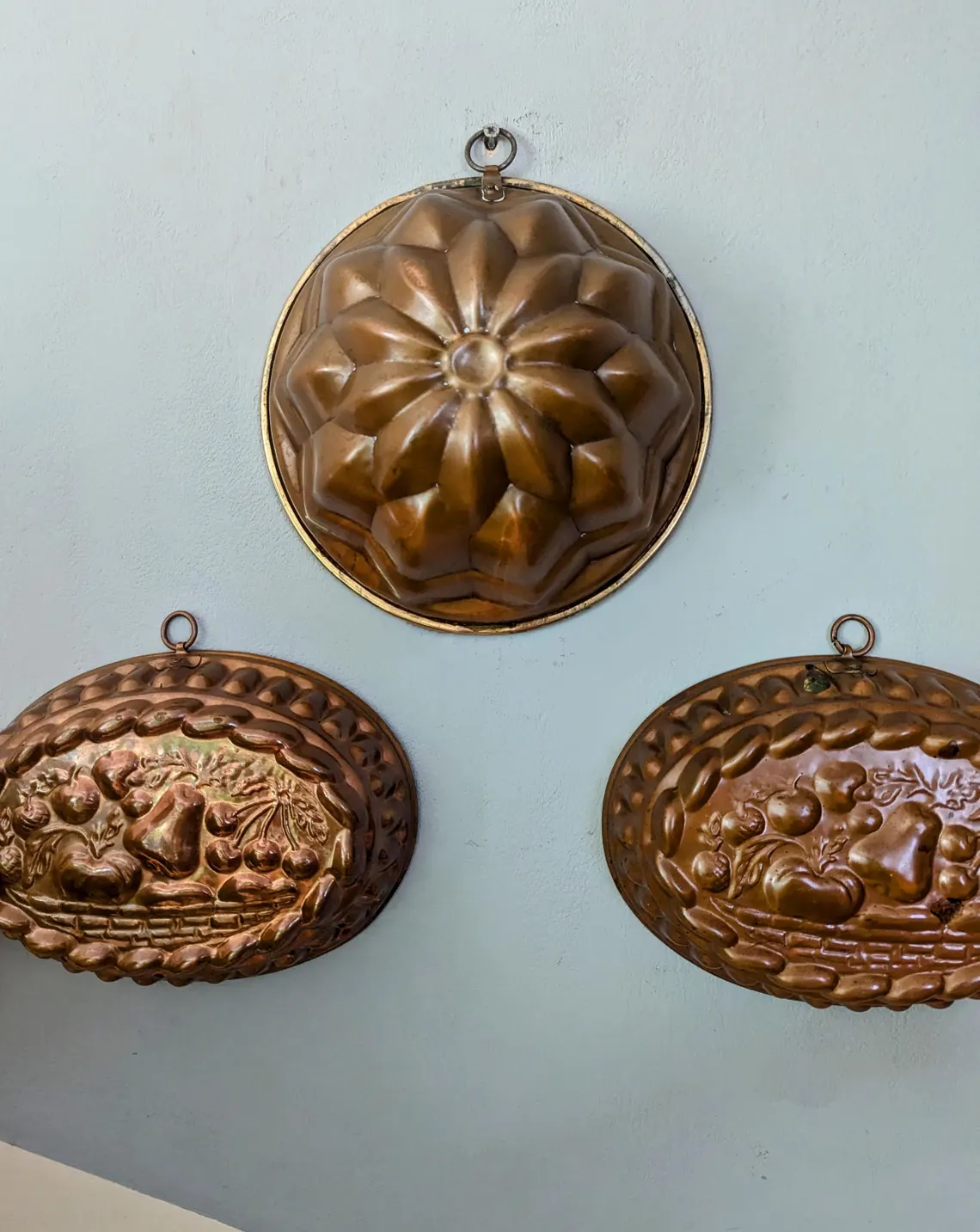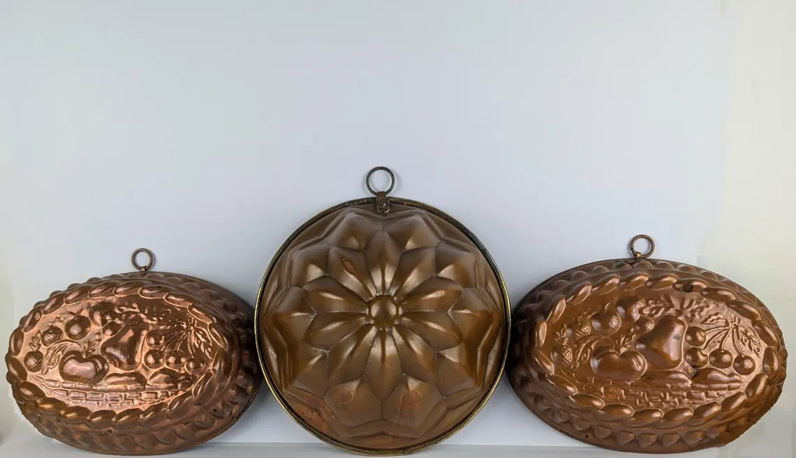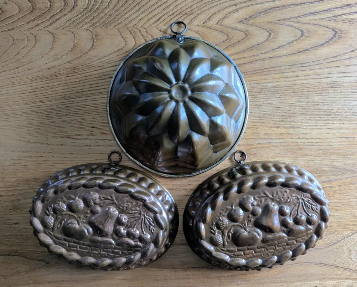 A wonderful set of three antique copper jelly or blancmange moulds.