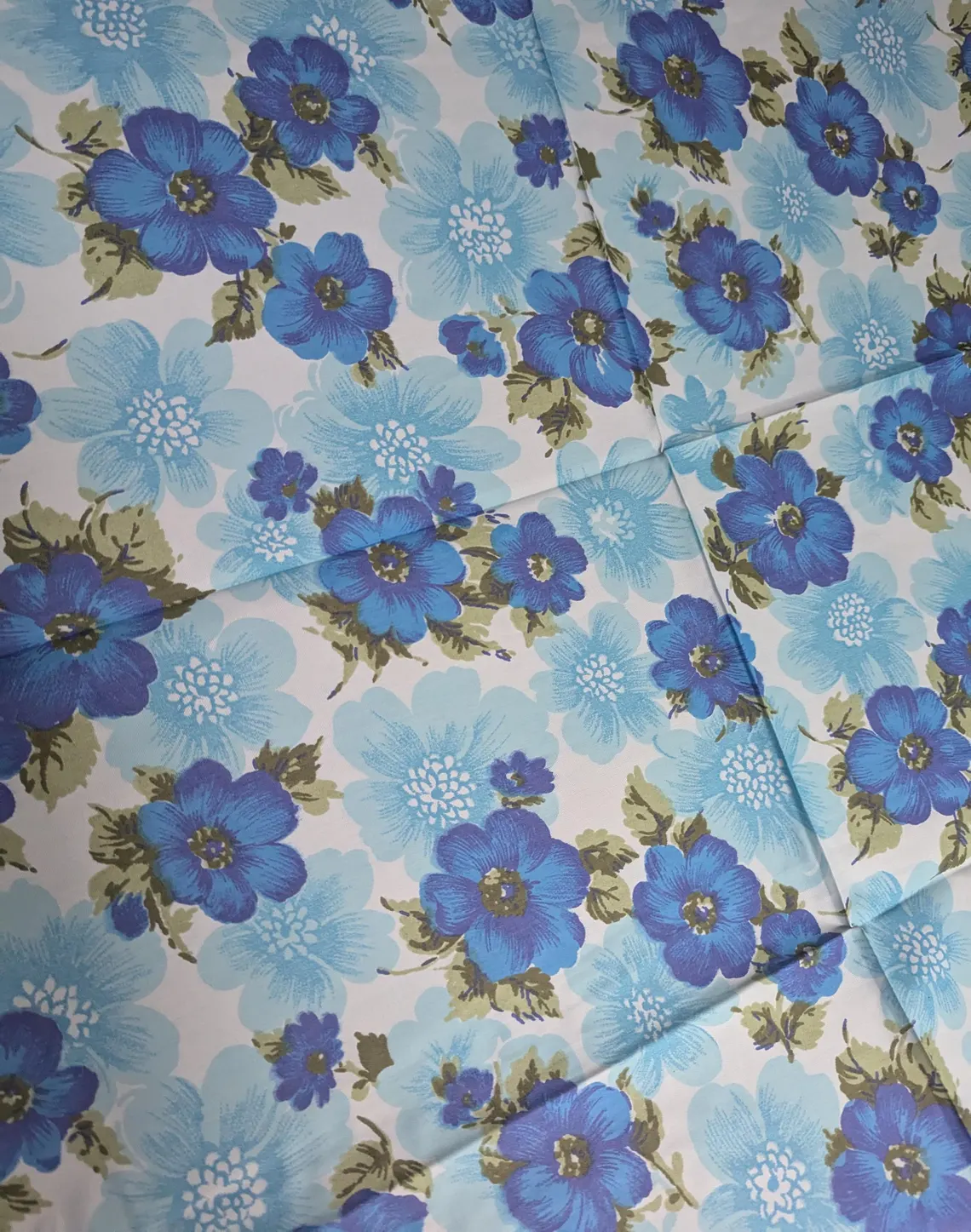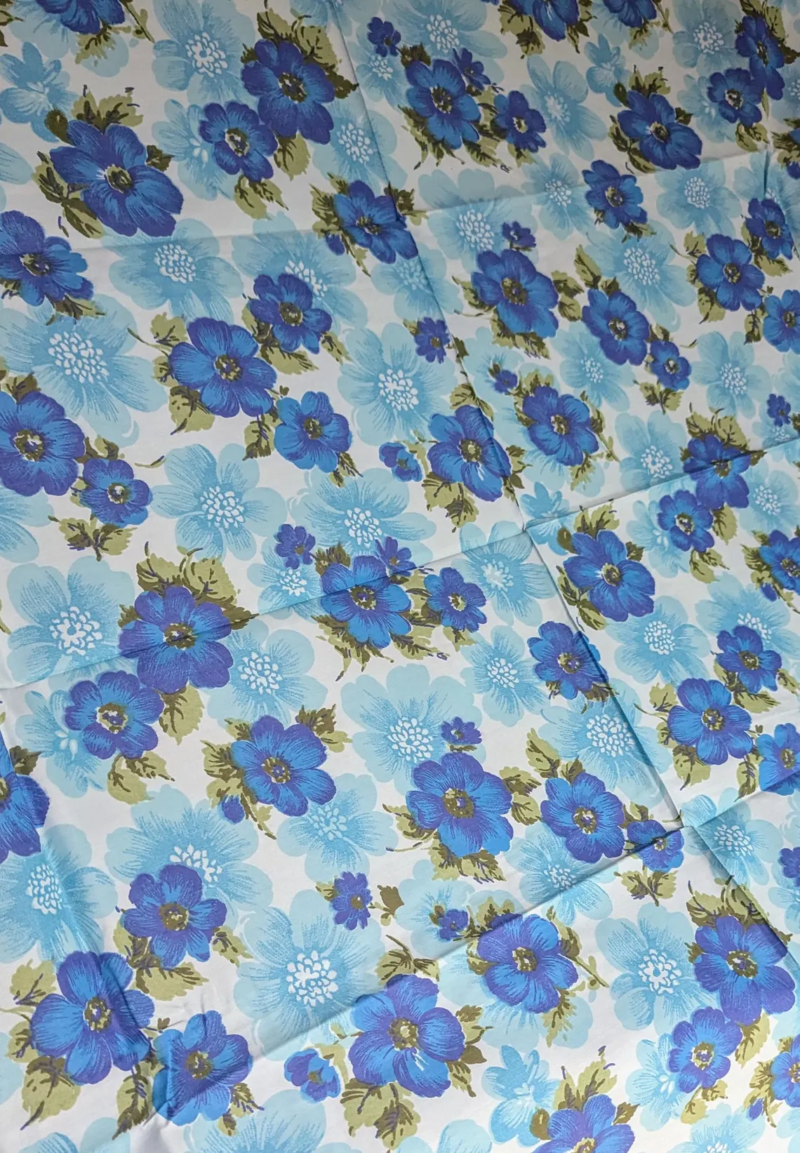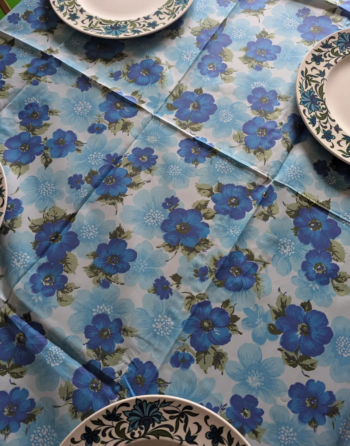 Floral 1970s vintage blue and white tablecloth