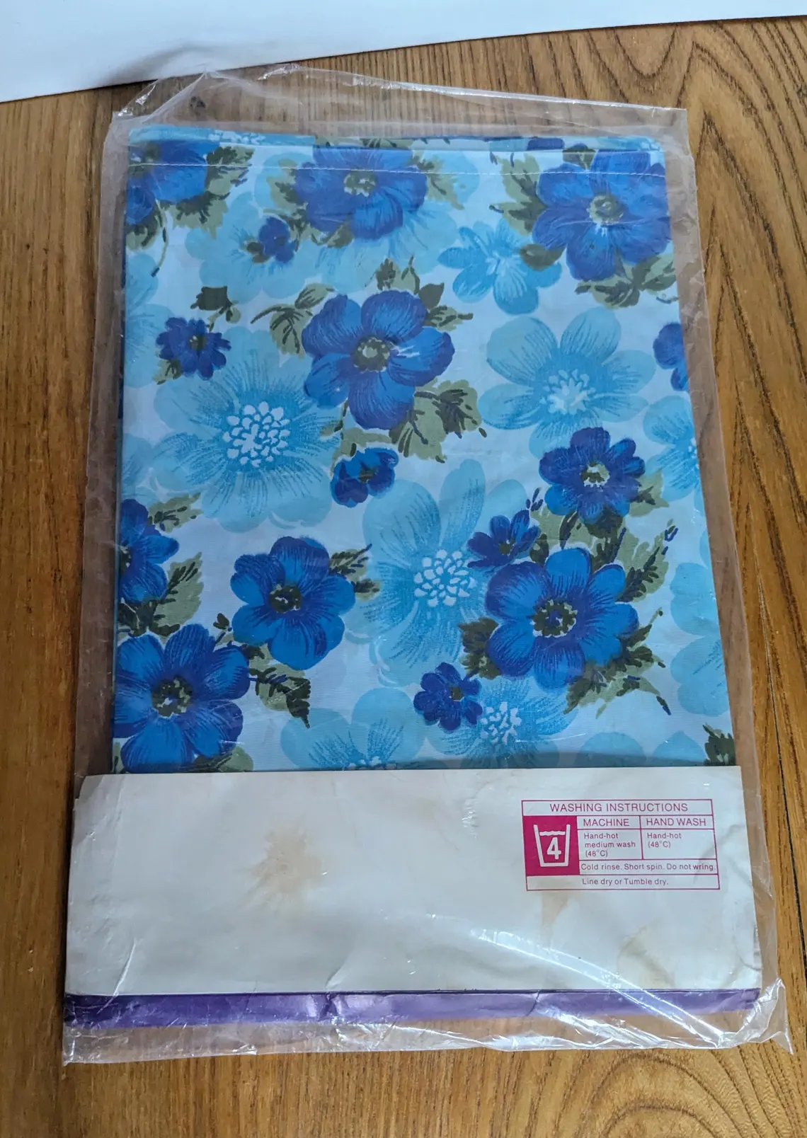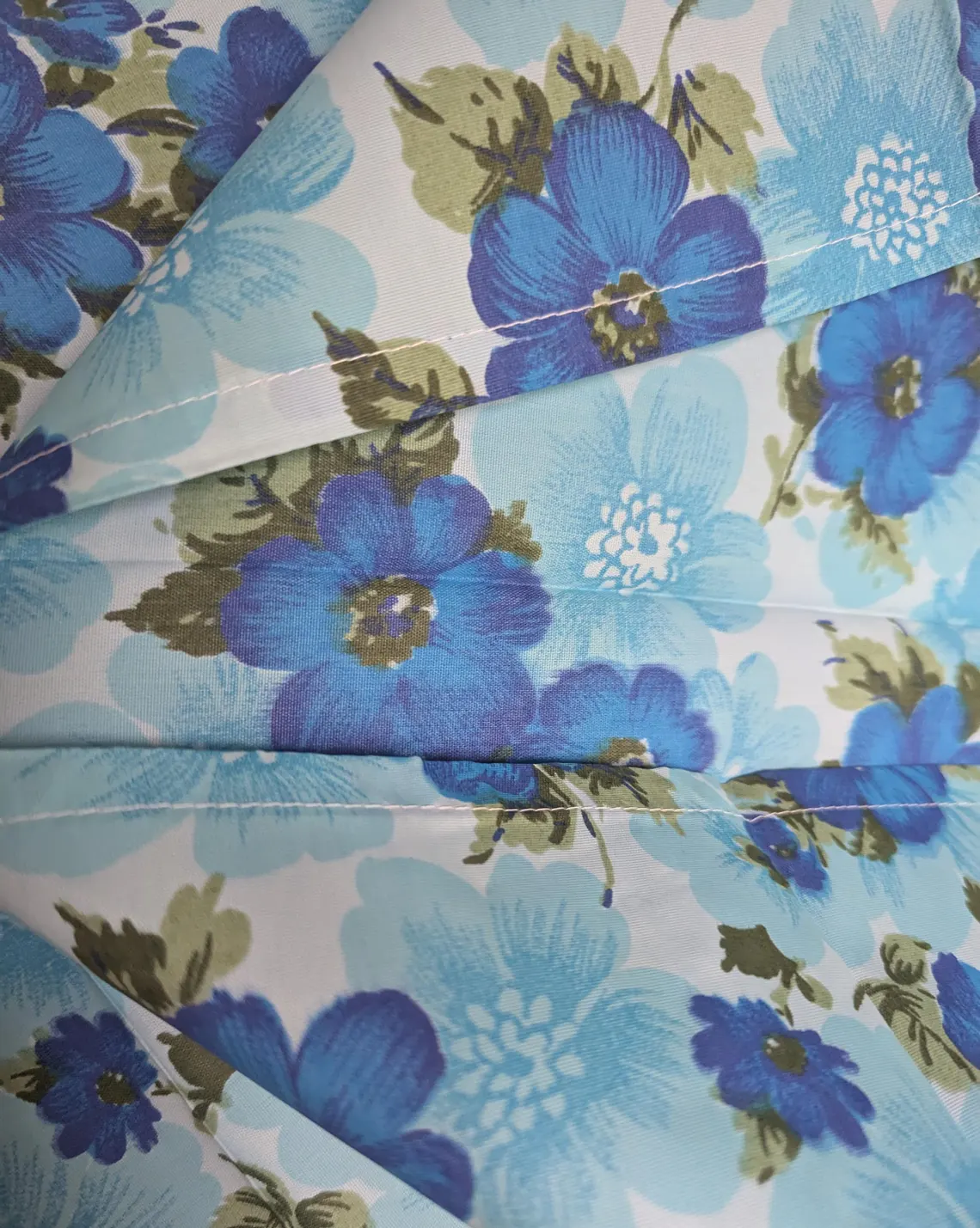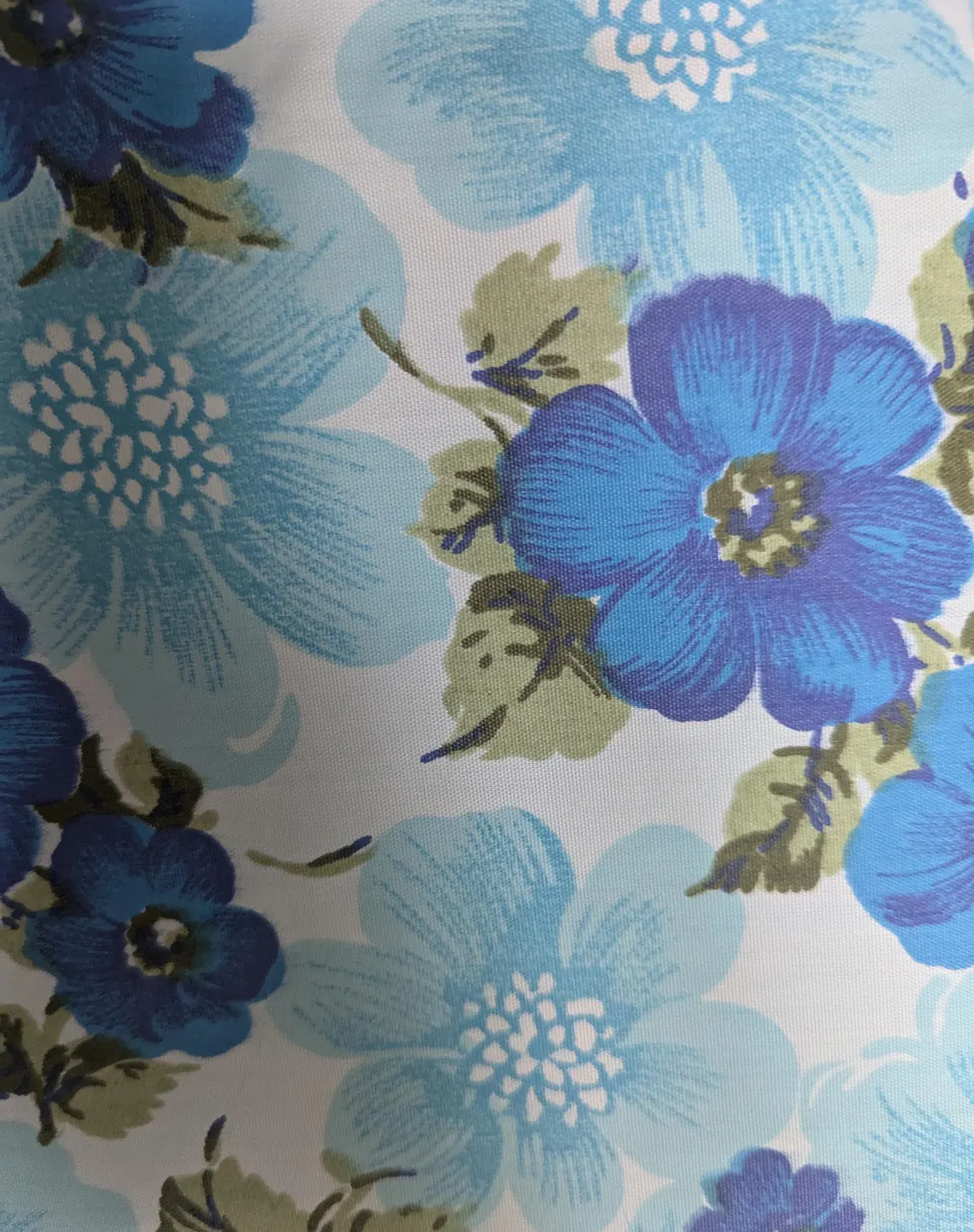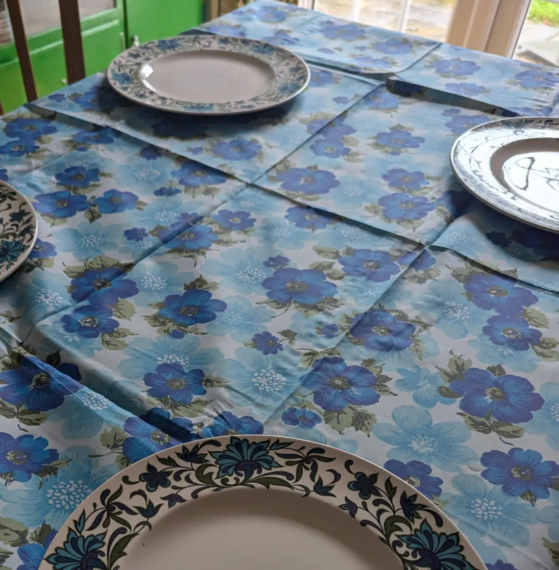 Floral 1970s vintage blue and white tablecloth