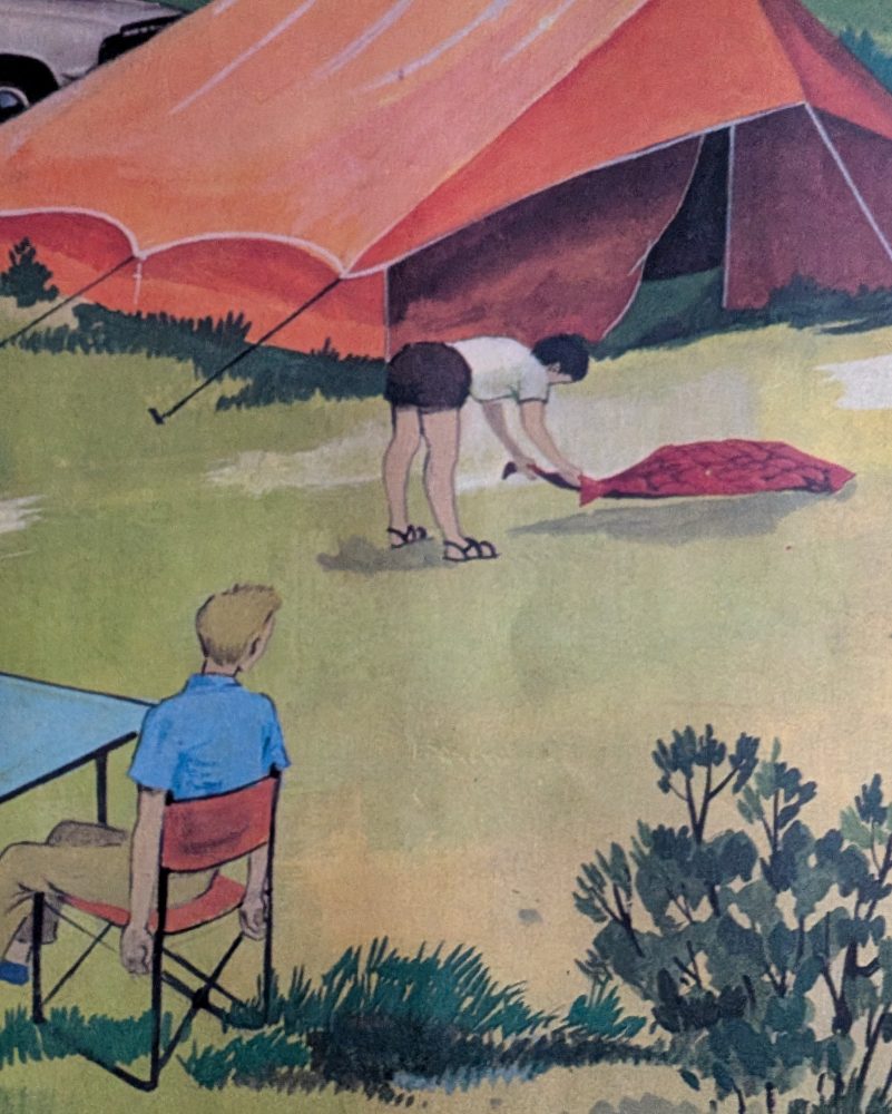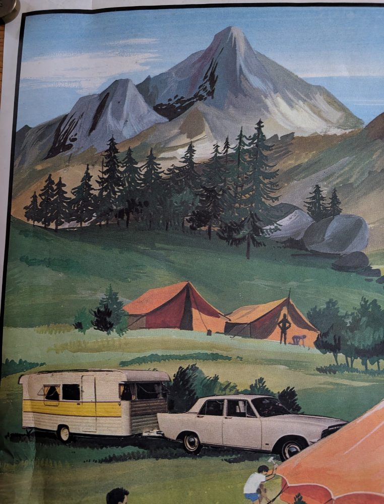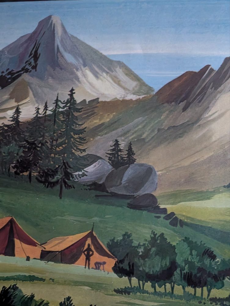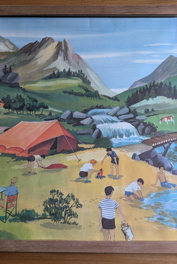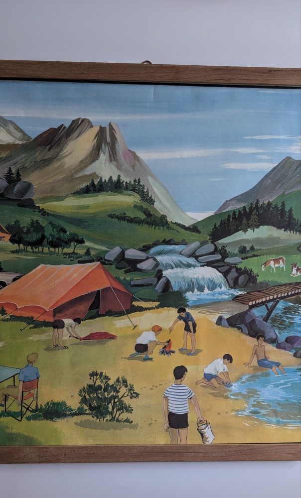 ‘Le Camping’ features a busy mountain scene with a campsite and lots going on, with a river running through. A joyful and relaxing picture.