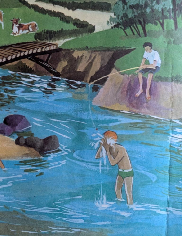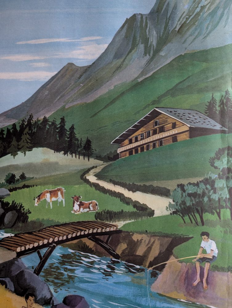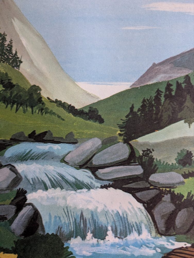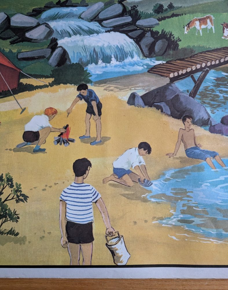 ‘Le Camping’ features a busy mountain scene with a campsite and lots going on, with a river running through. A joyful and relaxing picture.