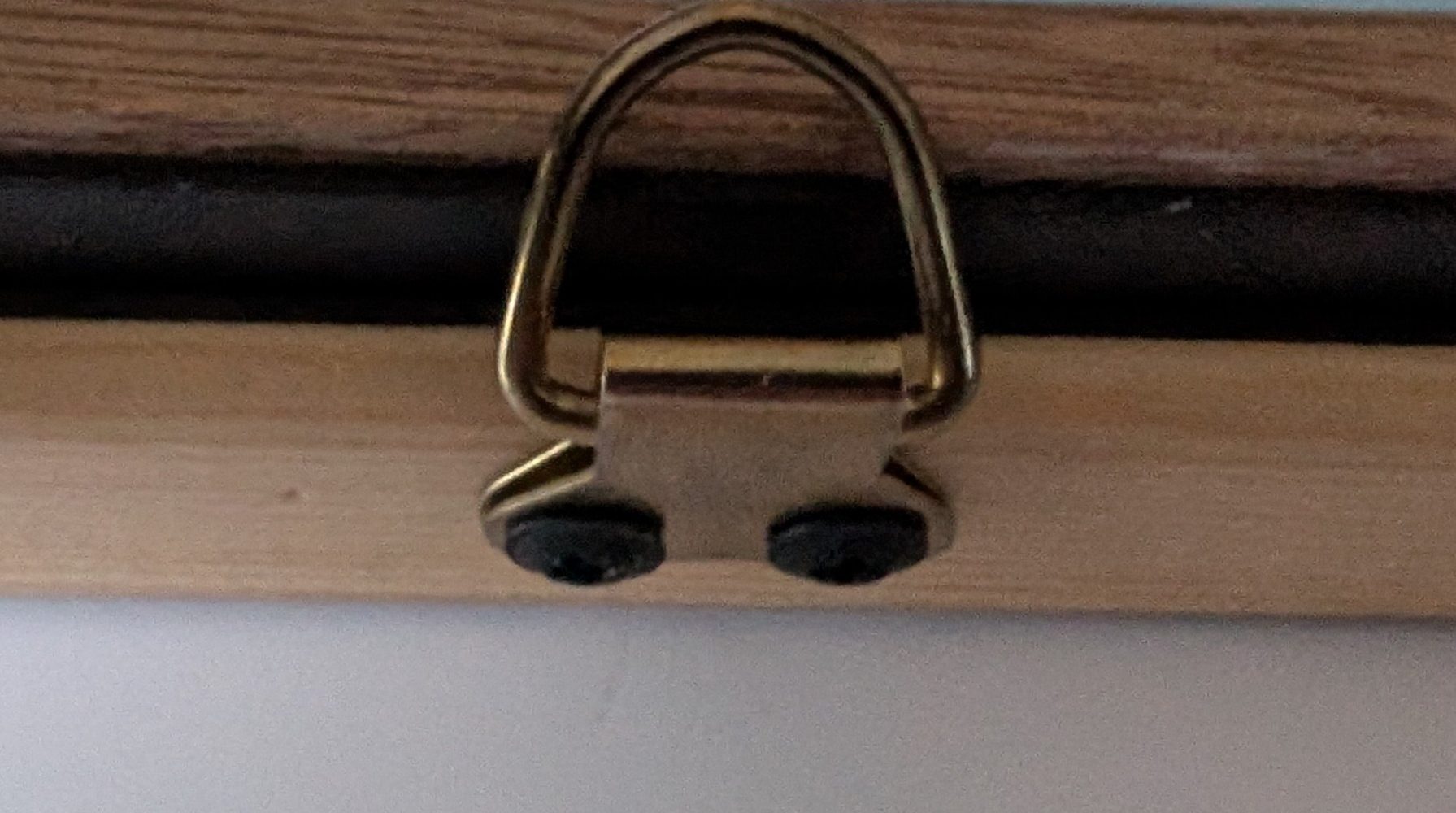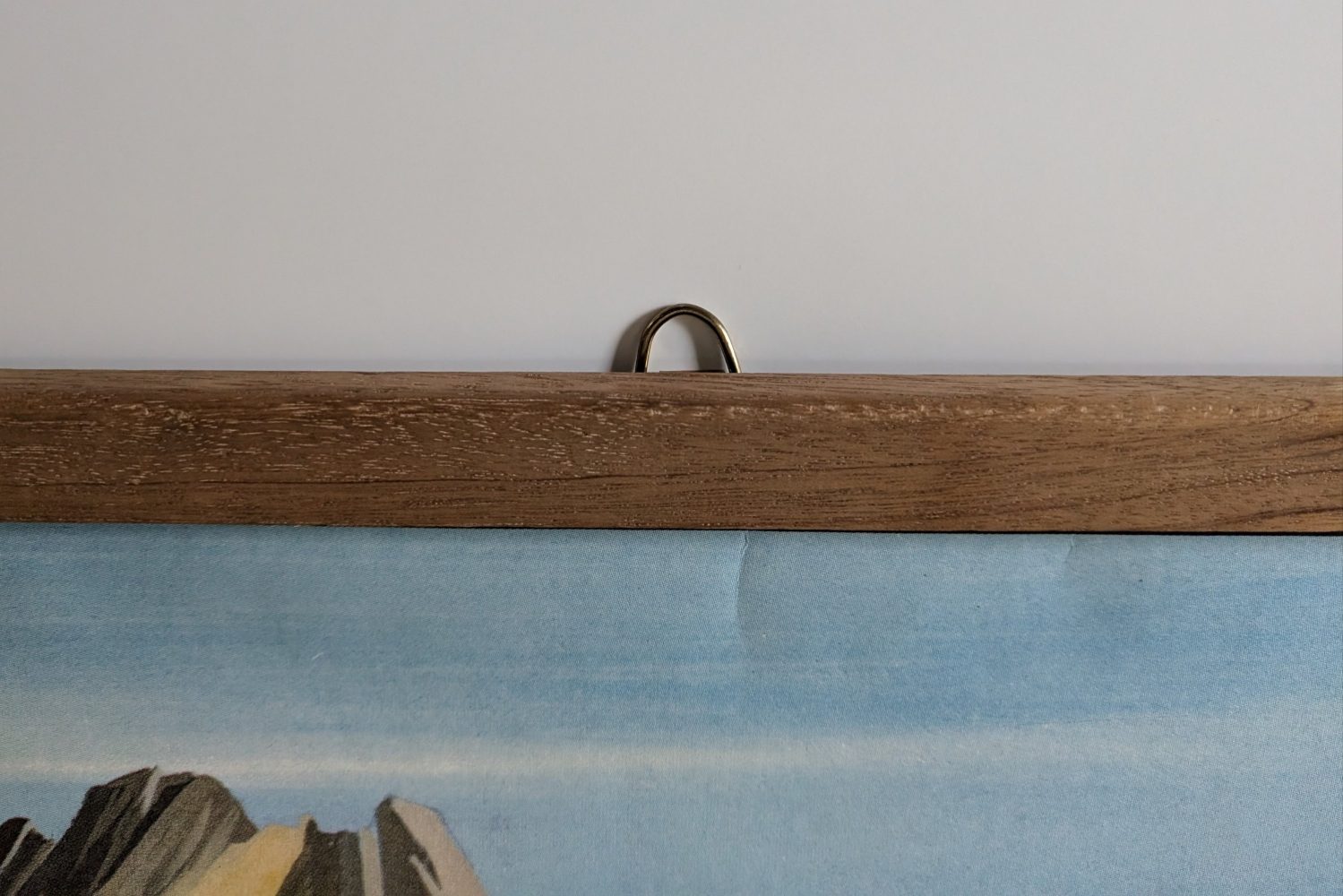 These are made from strips of chamfered oak to the front (pine to the reverse) and magnetic strips holding front and back together with the poster in between. A brass hook will be included to the reverse of the top.