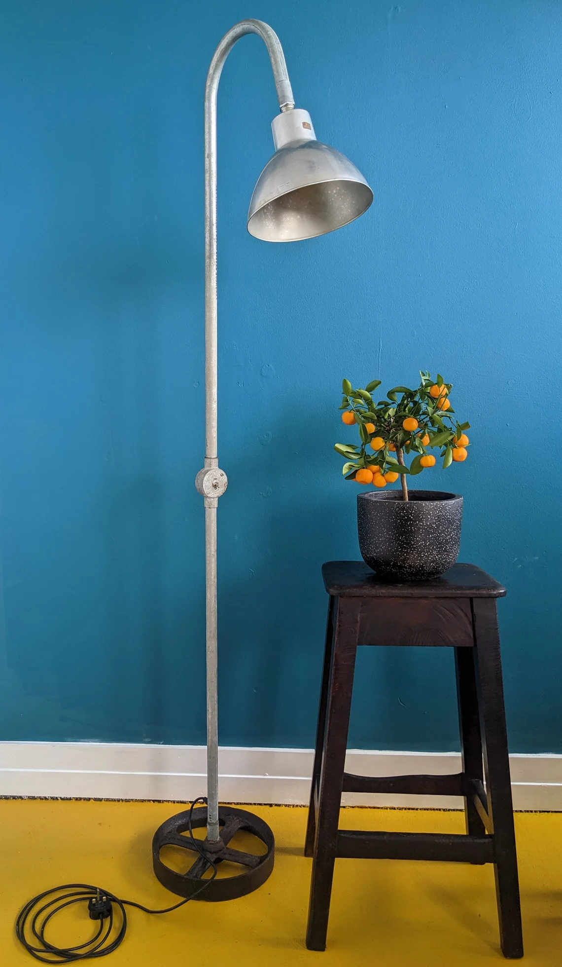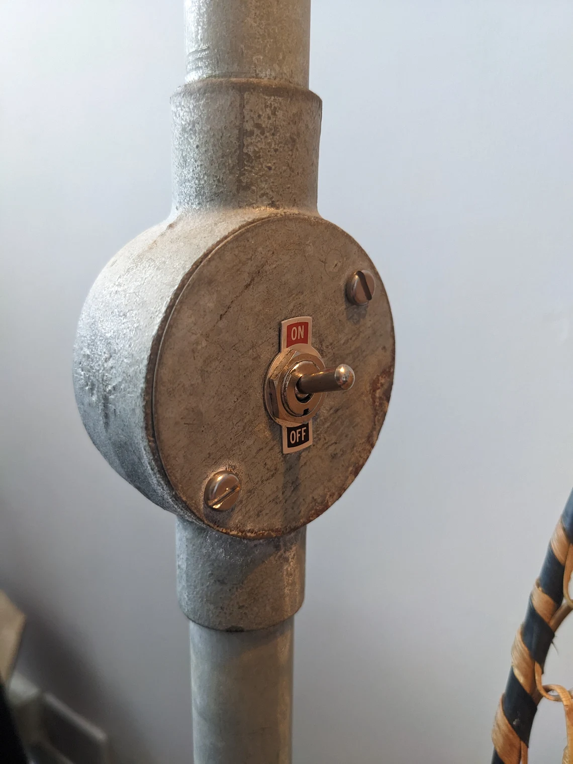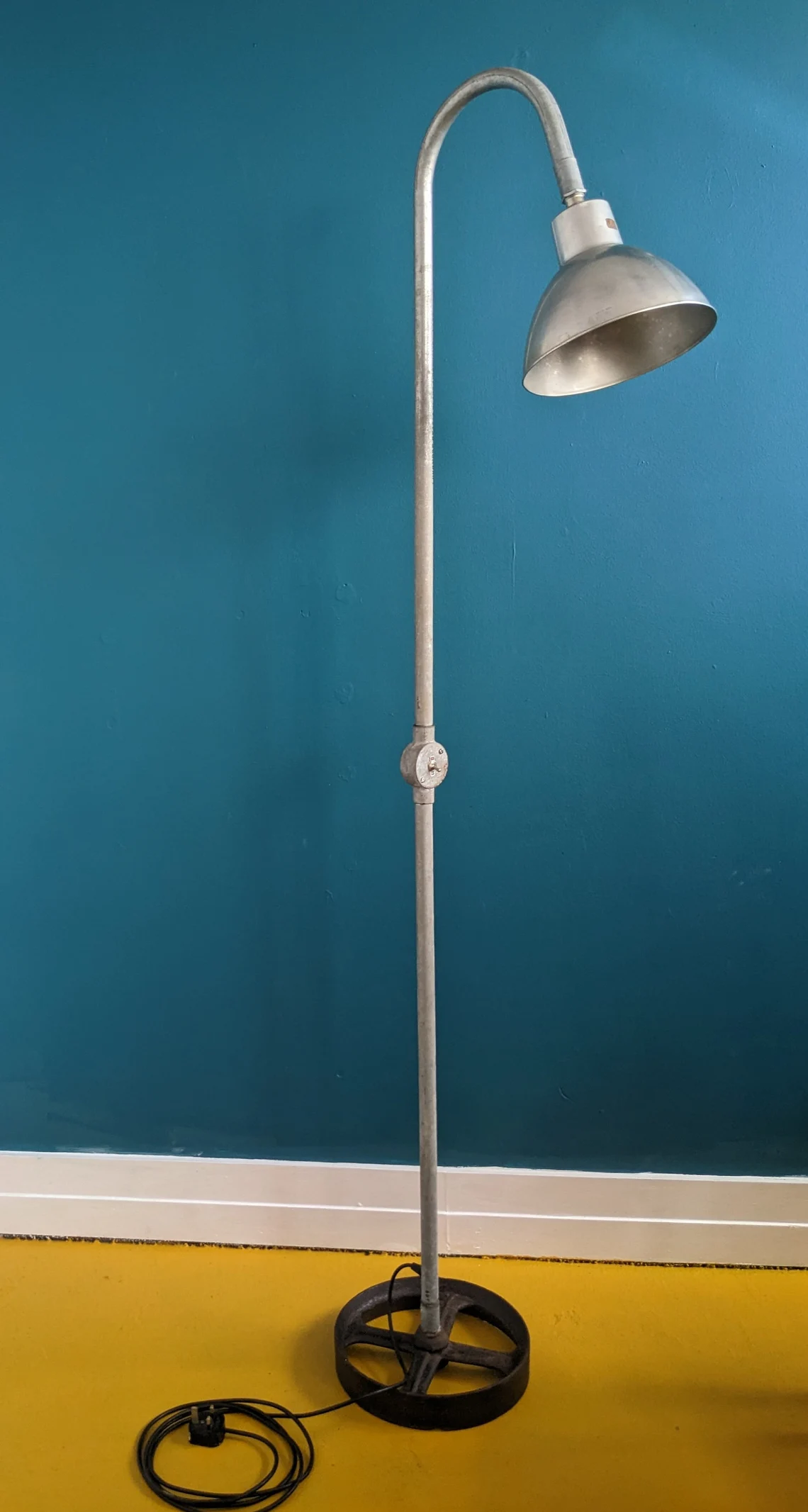 A unique, tall industrial standing lamp with steel piping, a vintage photographer’s light shade and factory-type toggle switch.