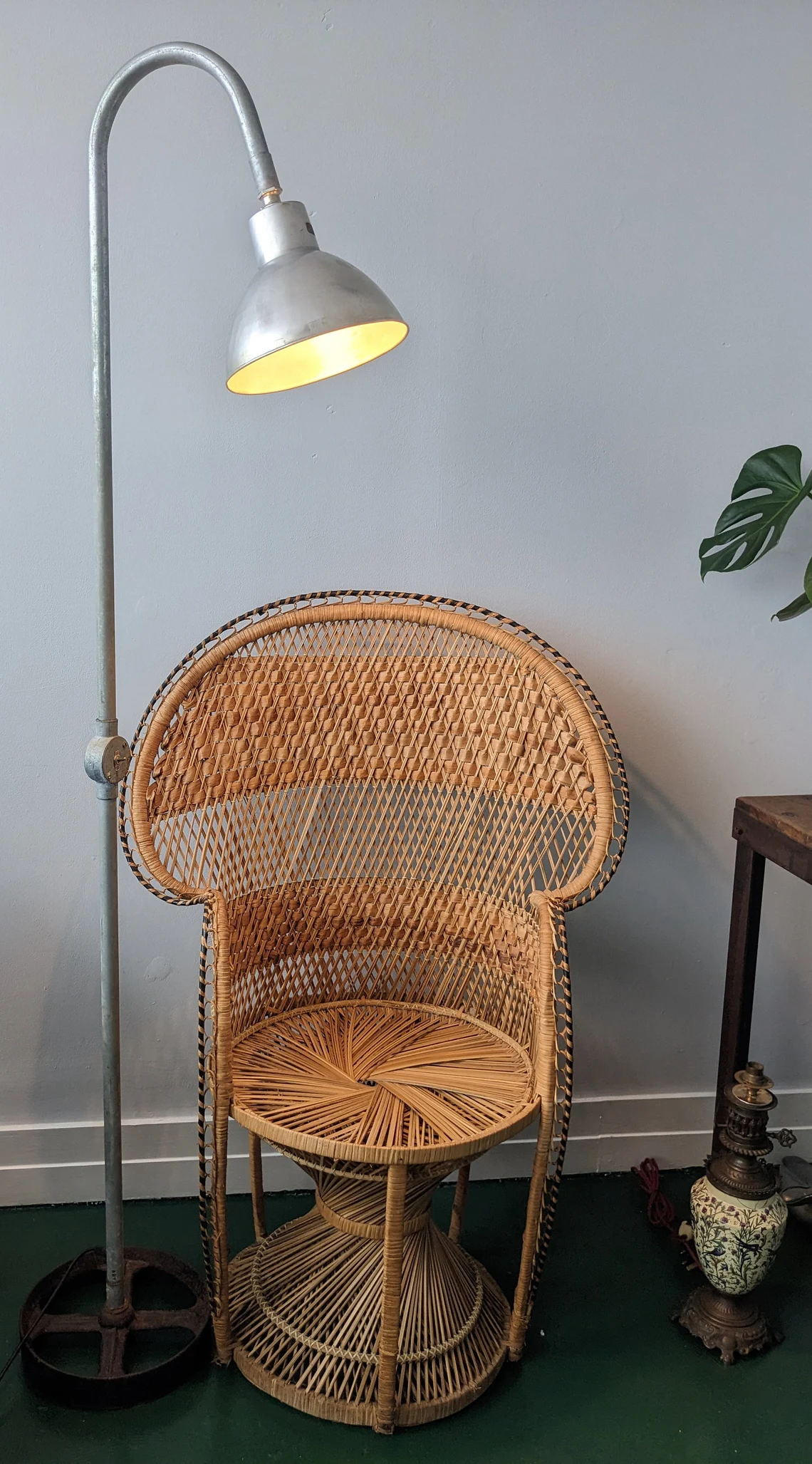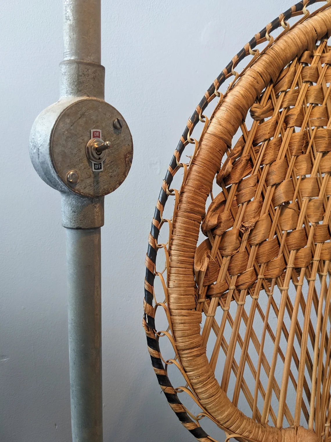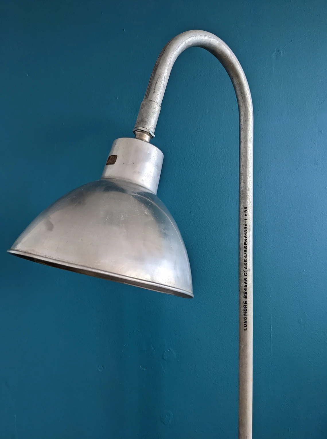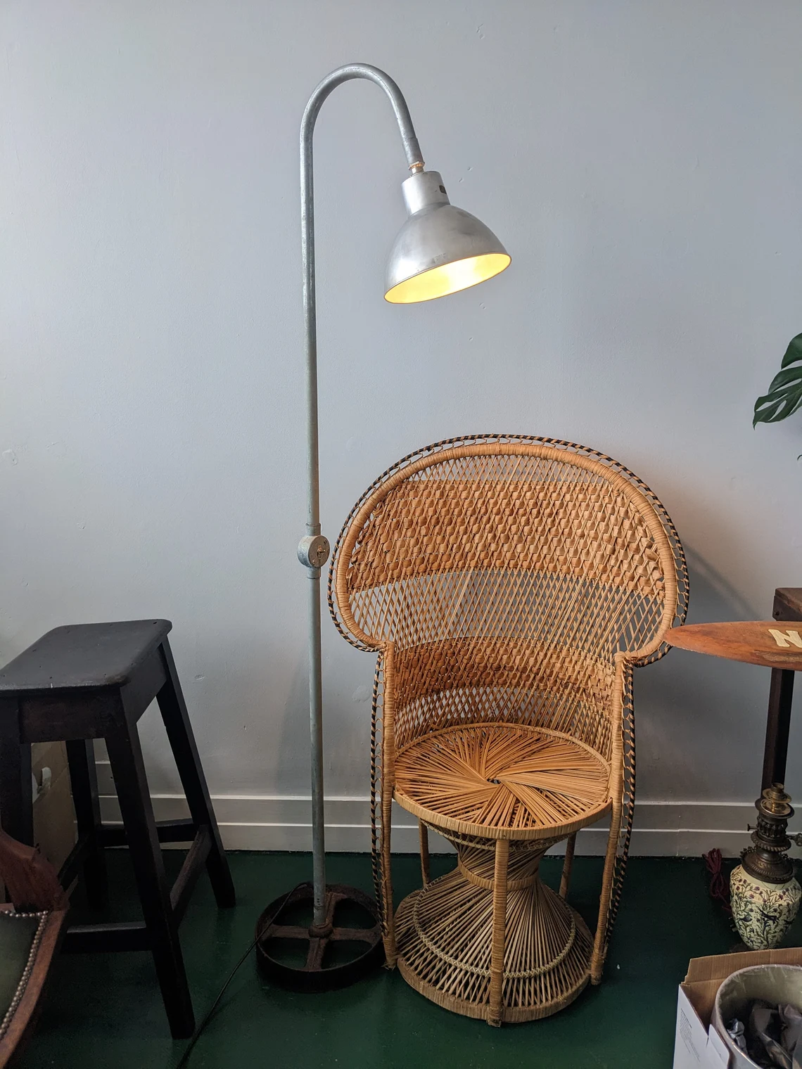 A unique, tall industrial standing lamp with steel piping, a vintage photographer’s light shade and factory-type toggle switch.