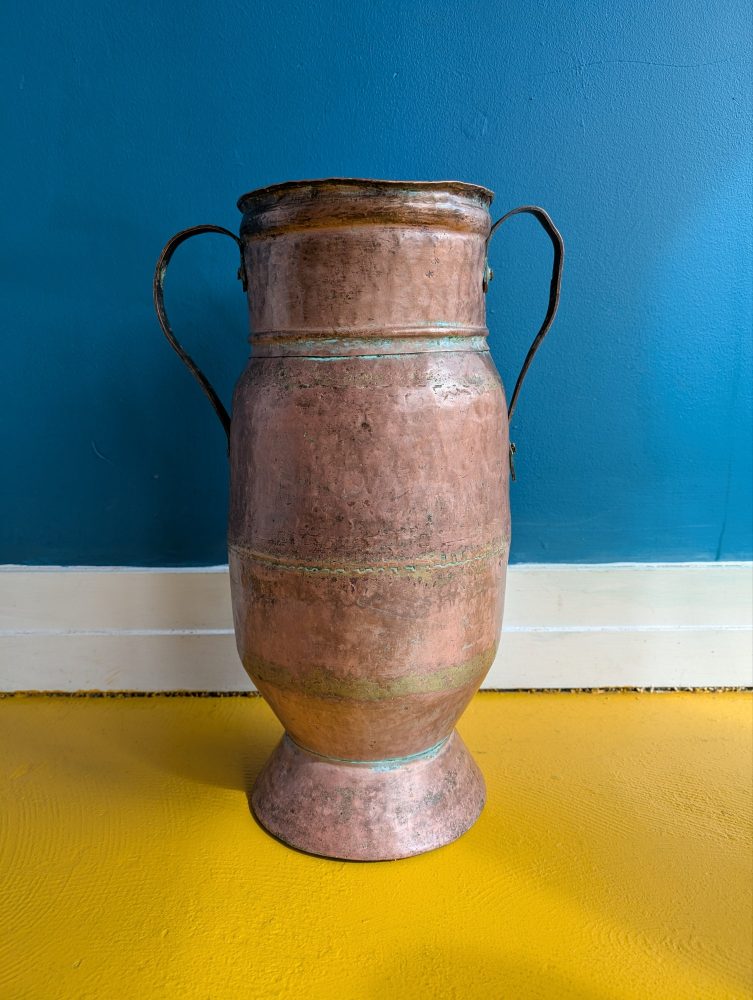 A very large handmade brass urn with two handles.