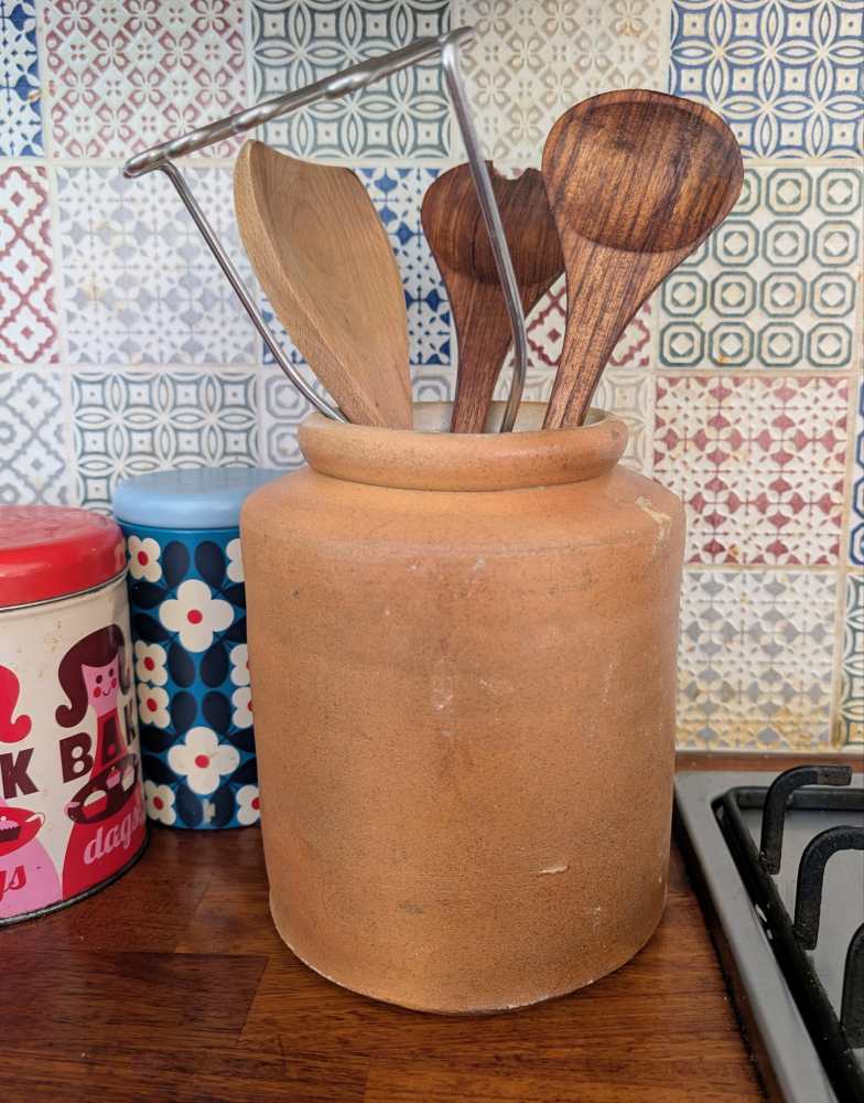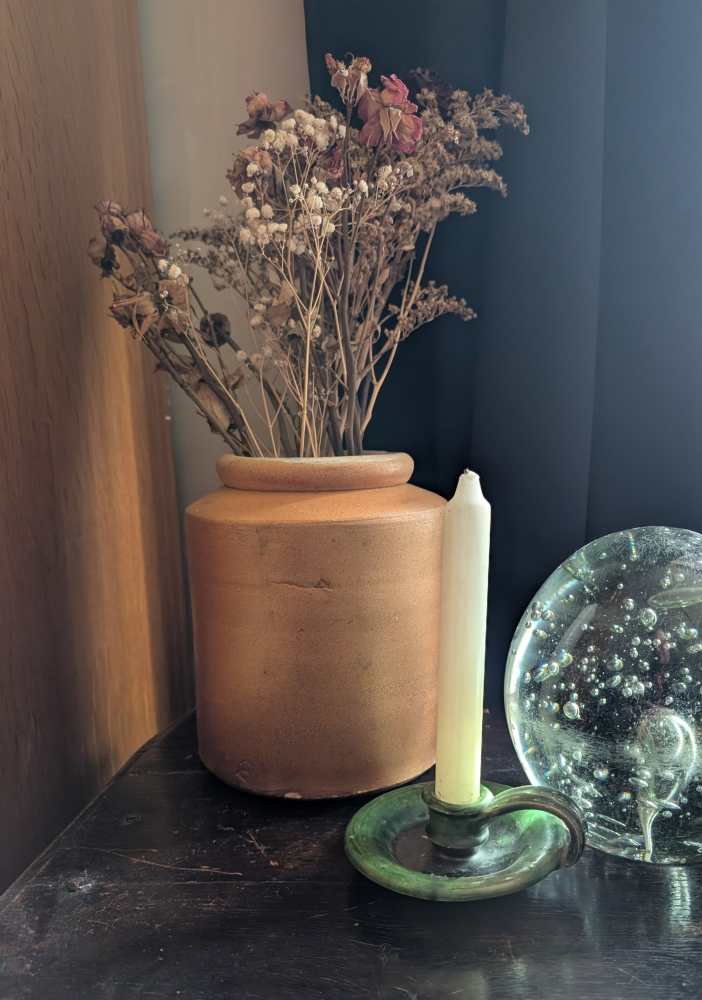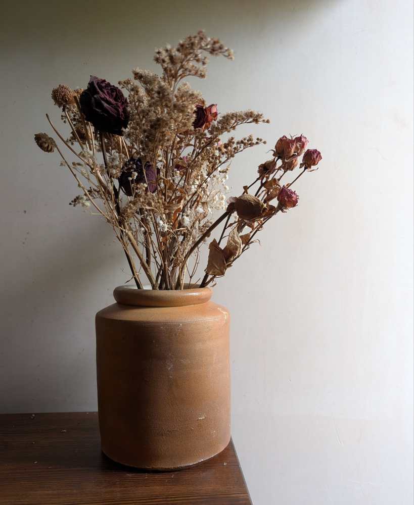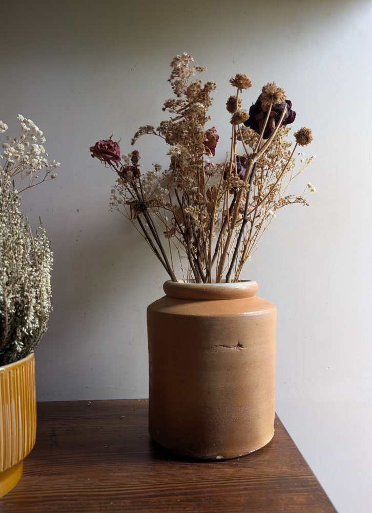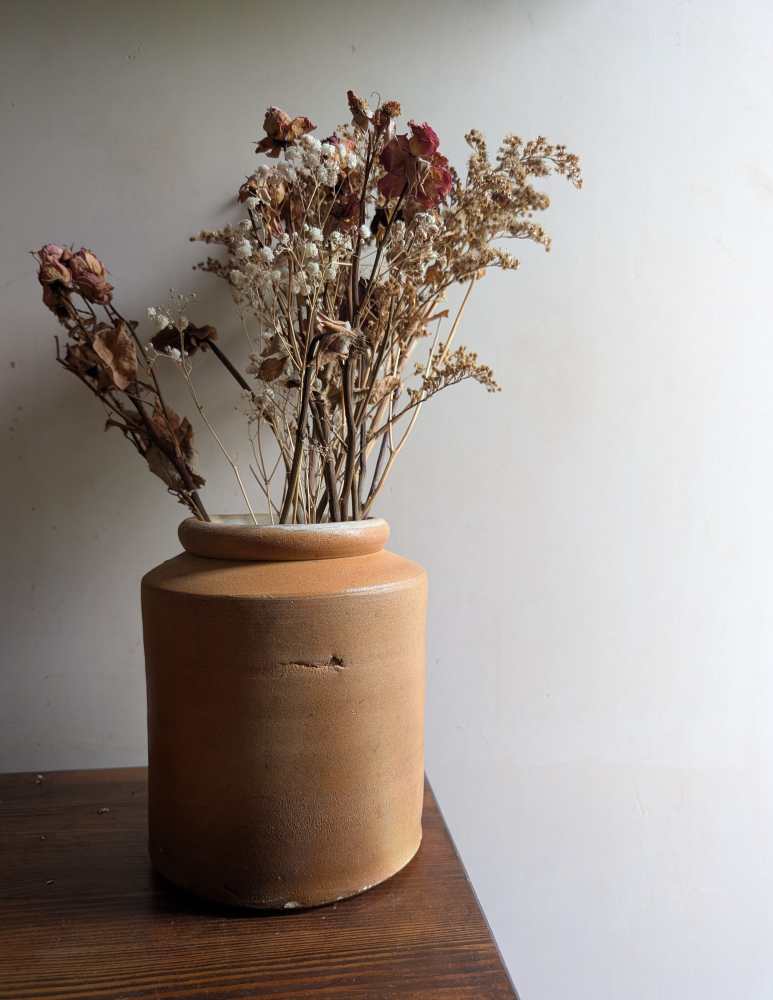 Great as a vase for dried or fresh flowers, a pot for kitchen utensils or a large brush pot or decorative shelf piece.