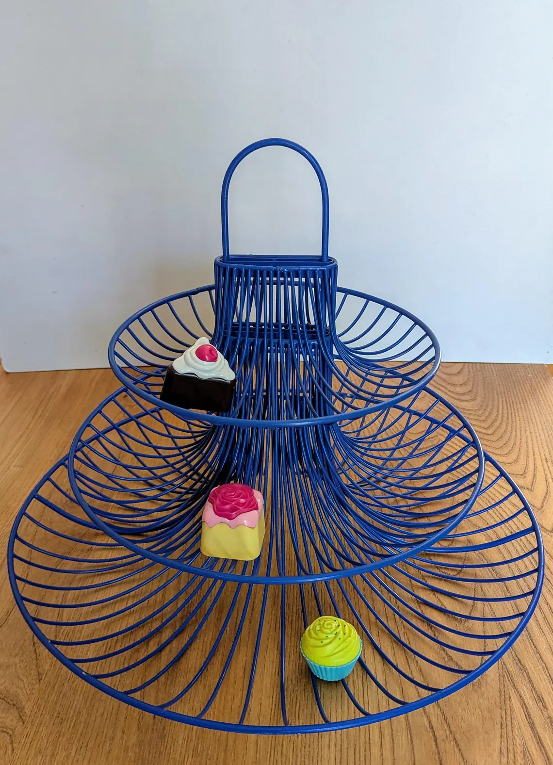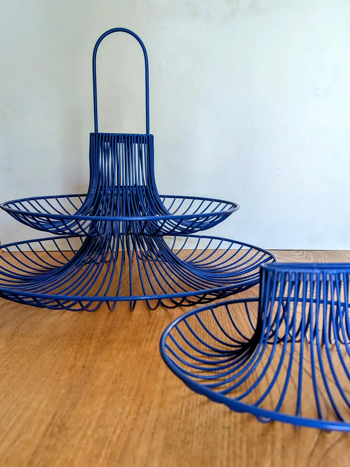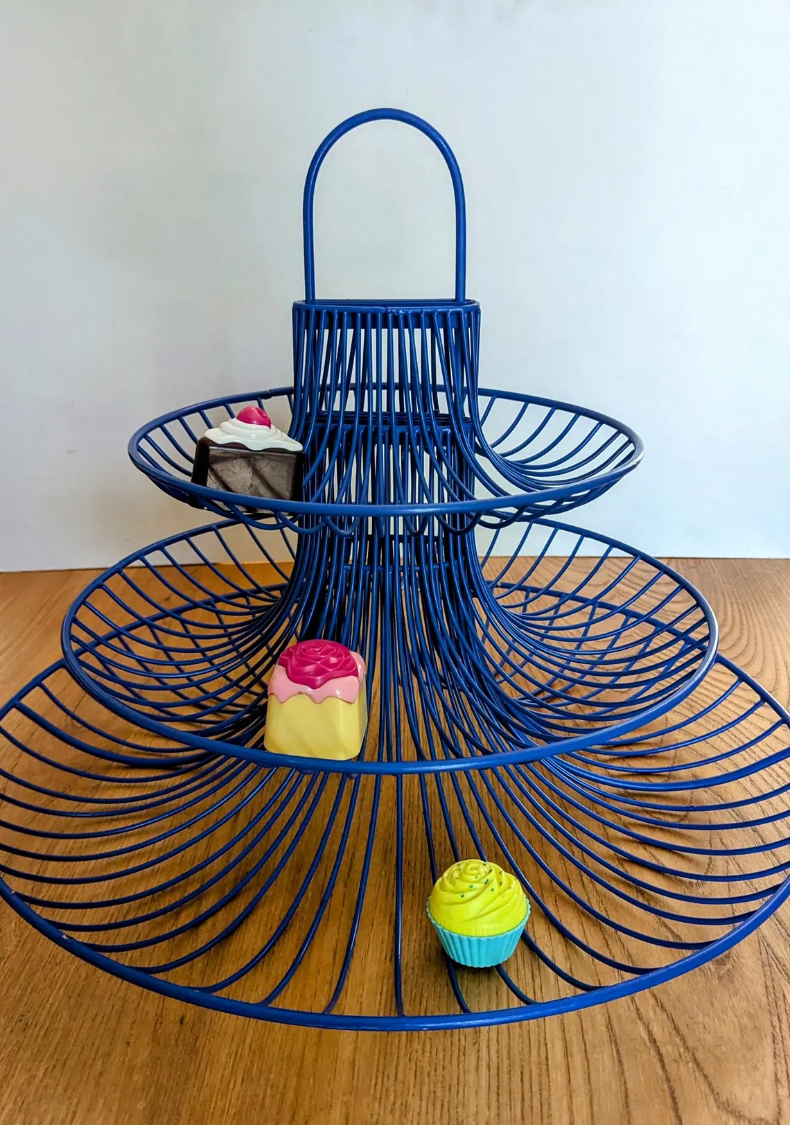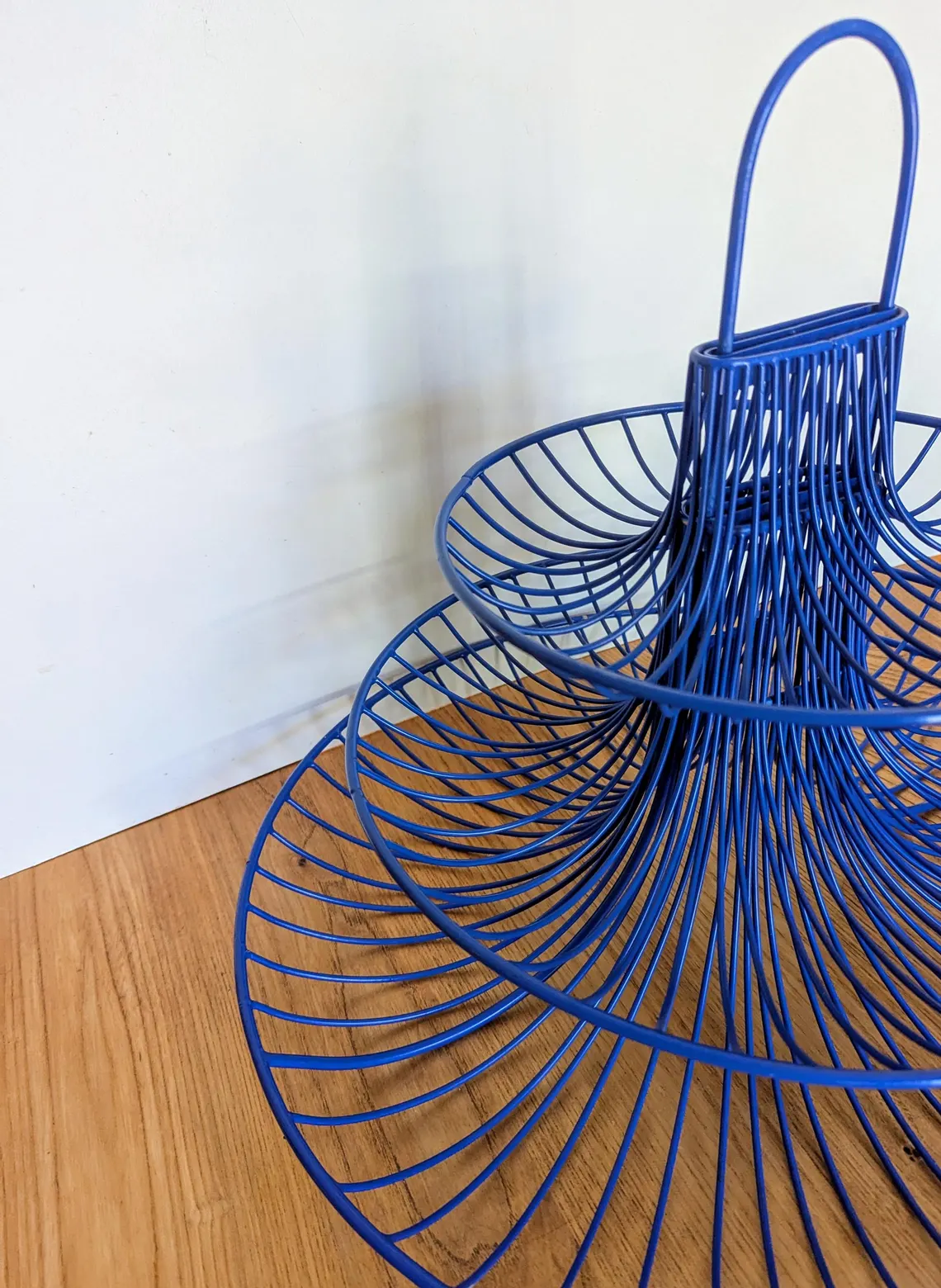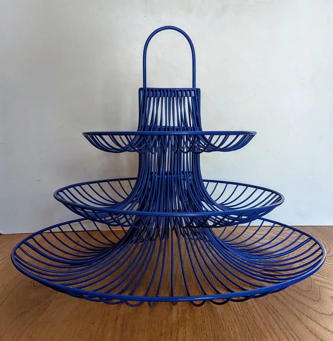A fabulous c. 1980s vertical blue wire fruit, vegetable, eggs, cupcake or shop display rack, with three tiers.