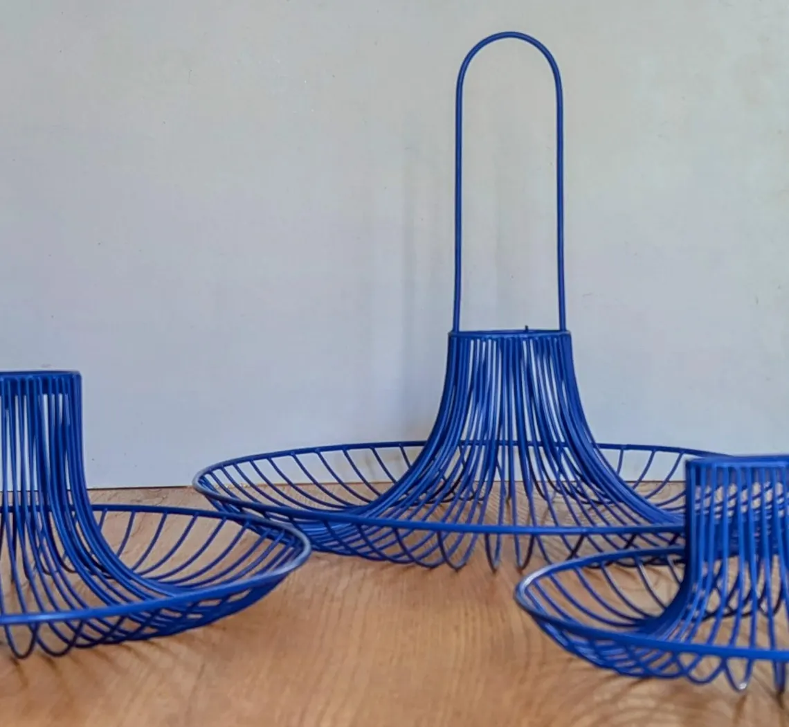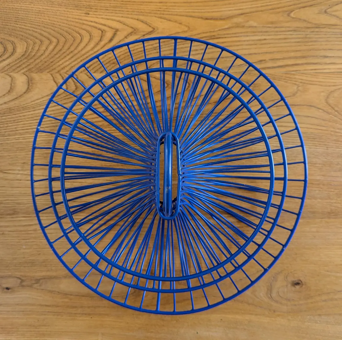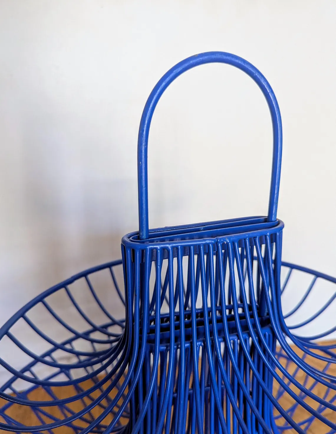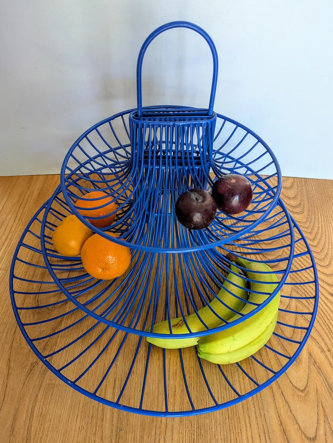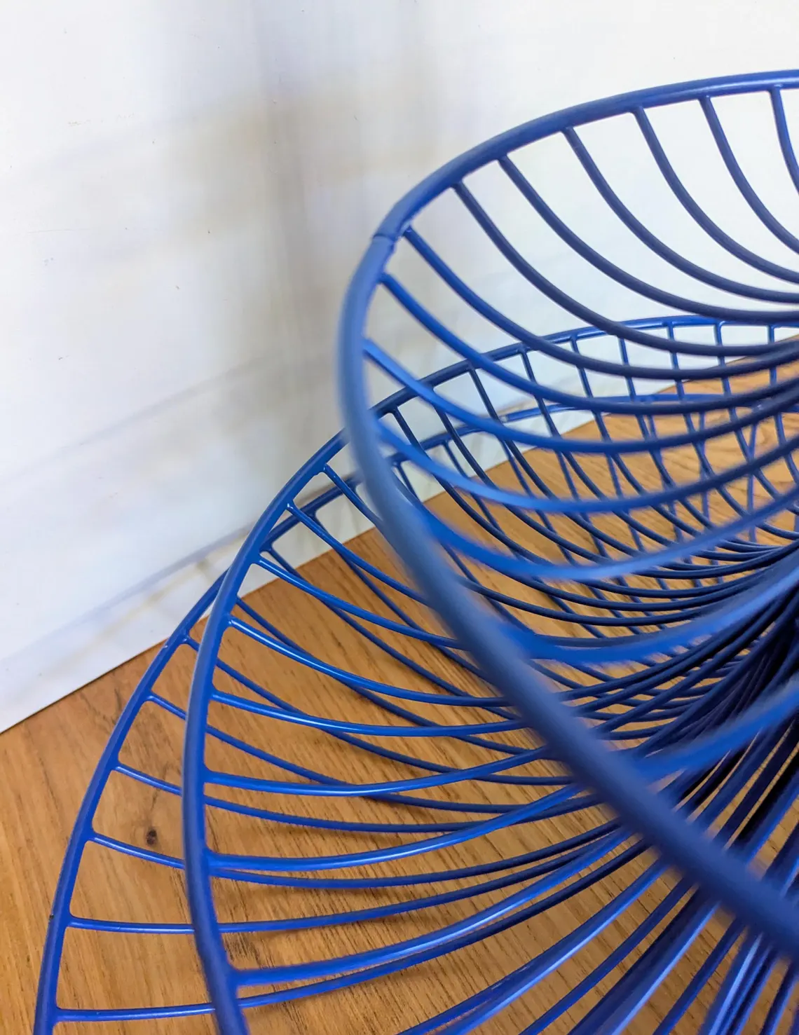 A fabulous c. 1980s vertical blue wire fruit, vegetable, eggs, cupcake or shop display rack, with three tiers.